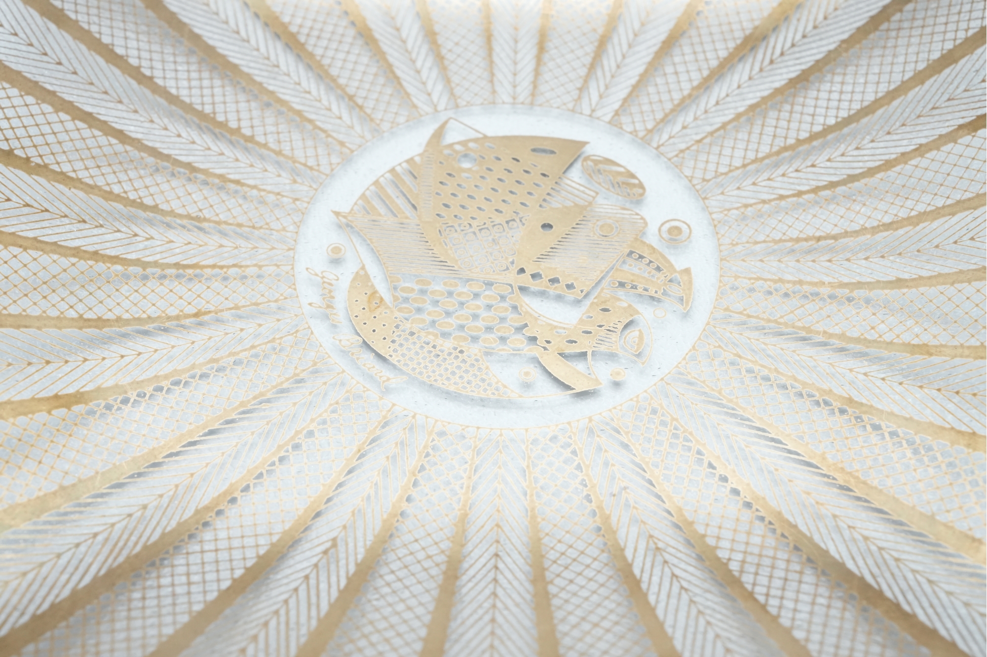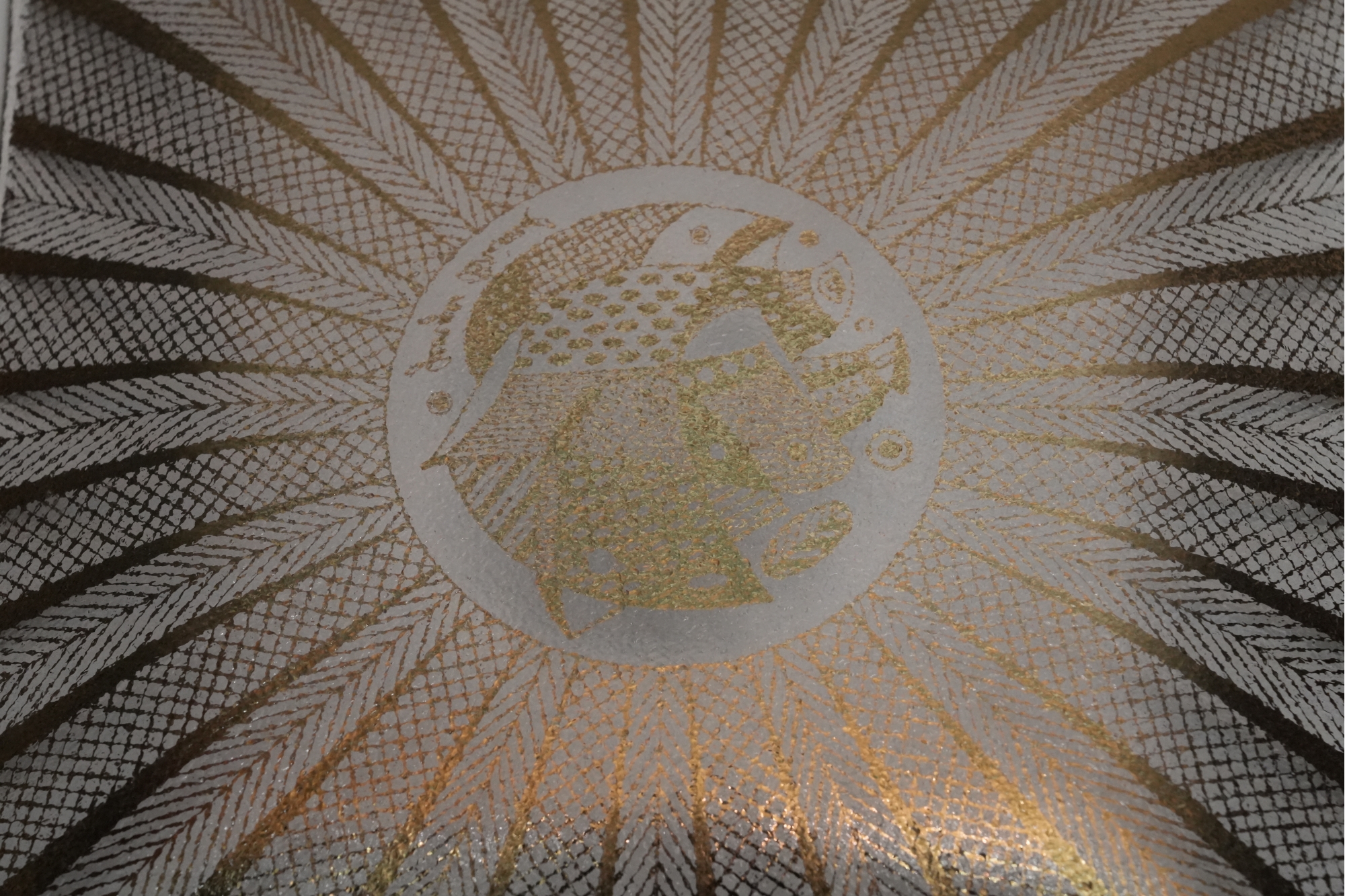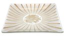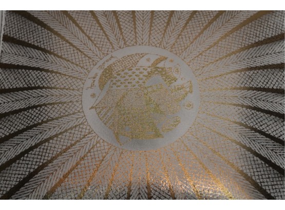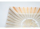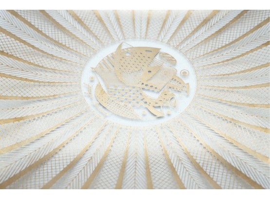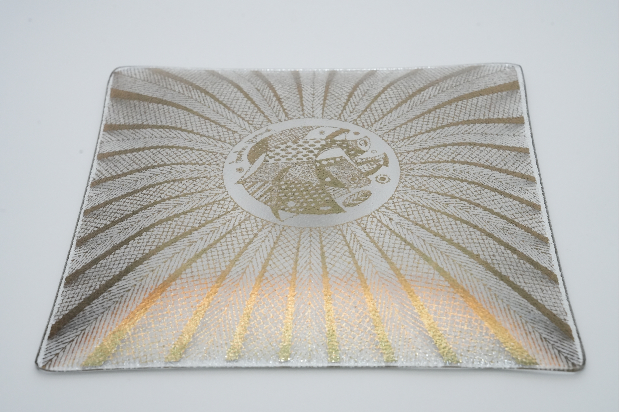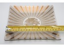 Mid century modern square glass serving tray designed by Georges Briard, featuring a striking gold sunburst pattern radiating from a central abstract motif. The design showcases Briard’s signature blend of bold geometric styling and metallic detailing, with finely etched and gilded decoration on clear glass. The tray has gently upturned edges and a substantial feel, making it ideal for barware service, cocktails, or display as a decorative accent piece.