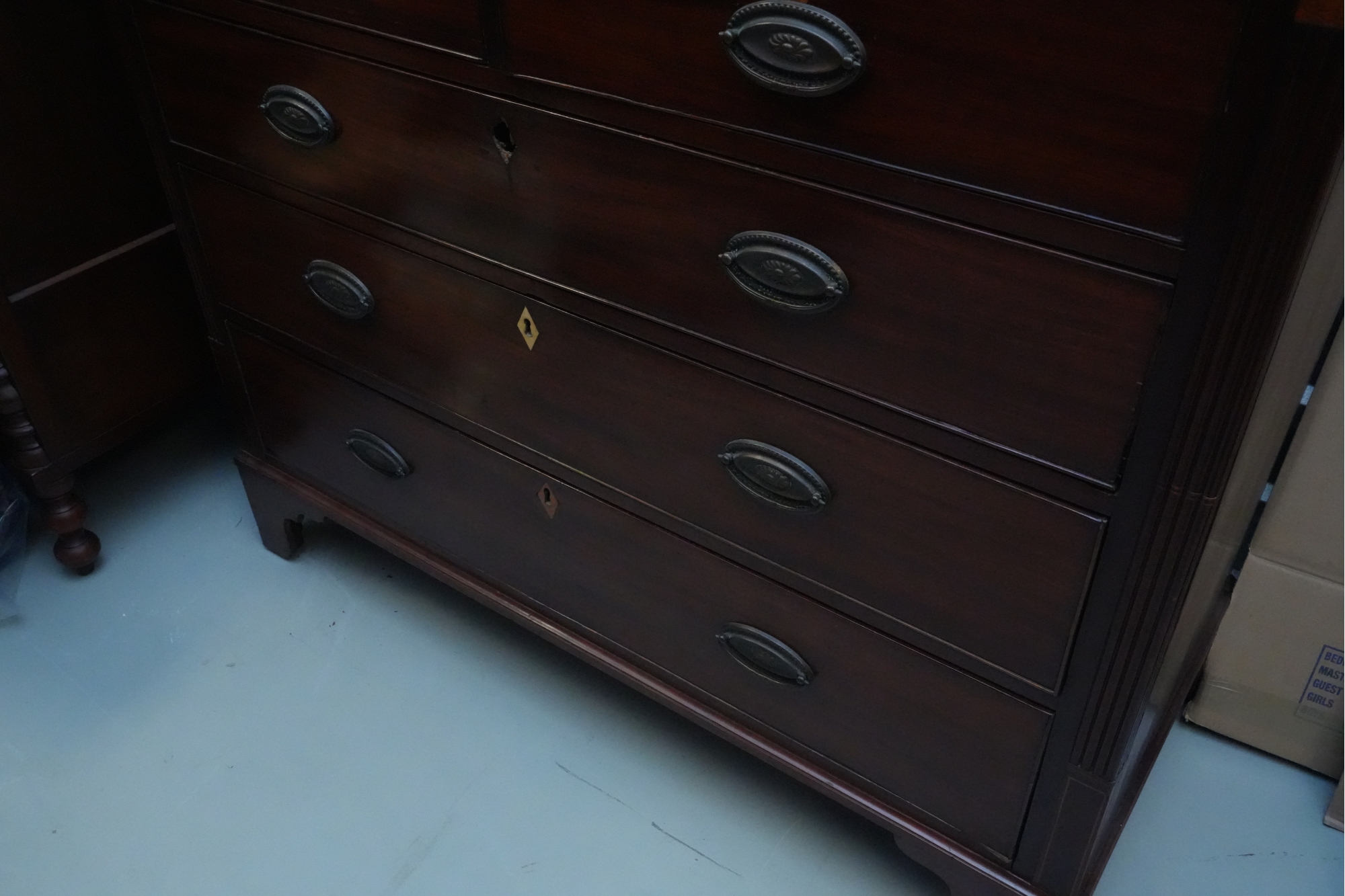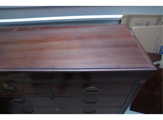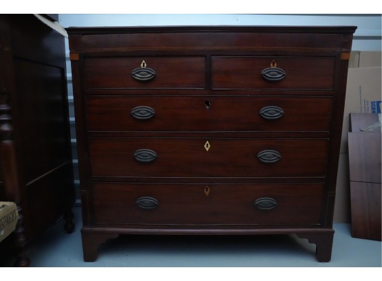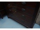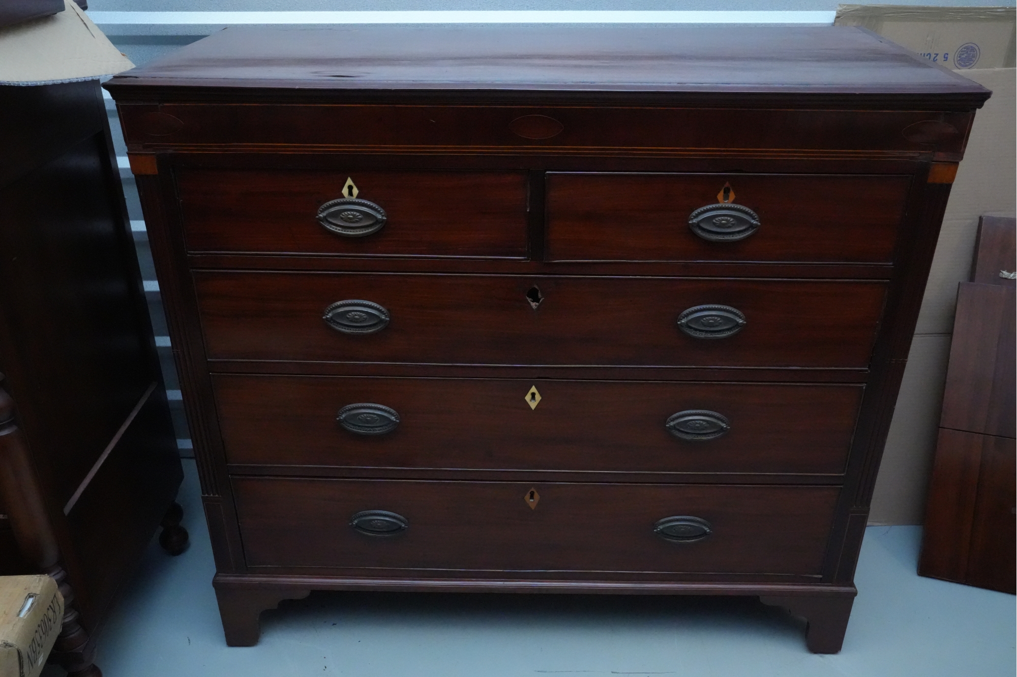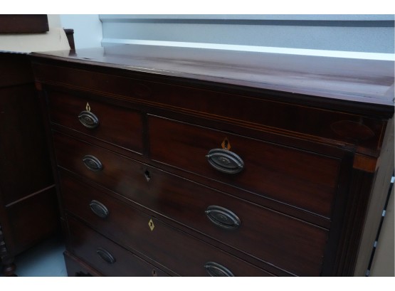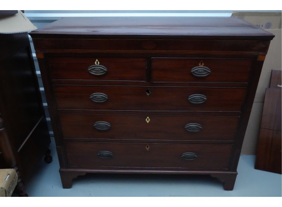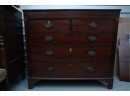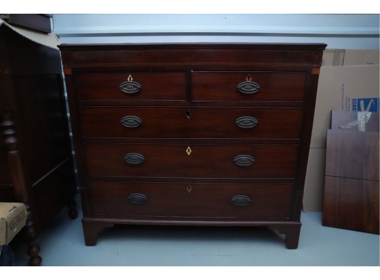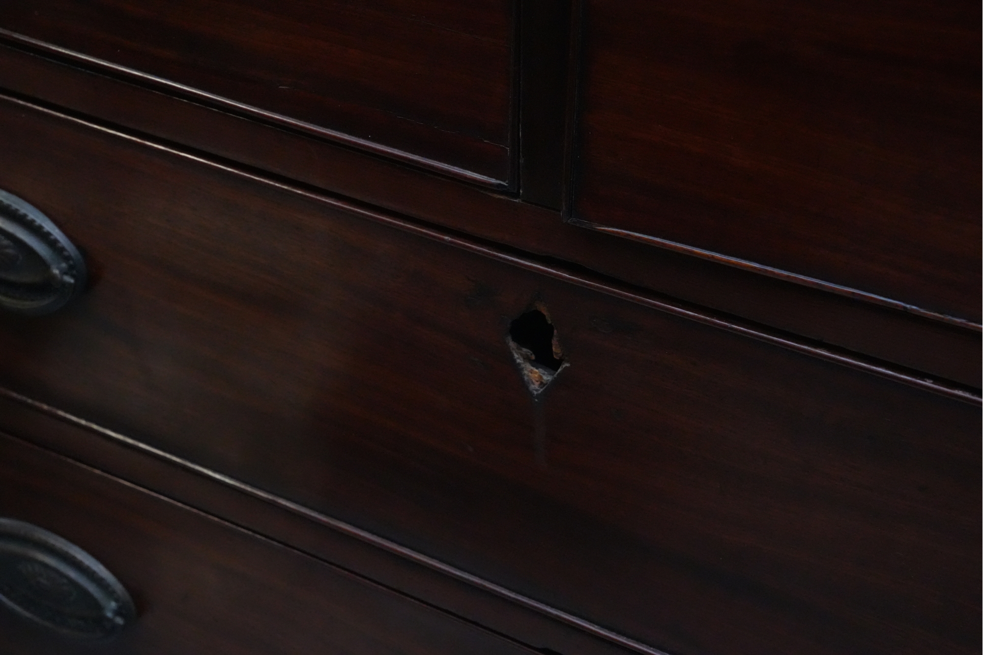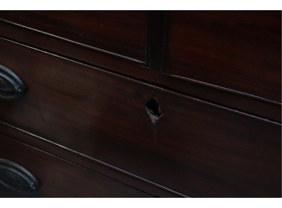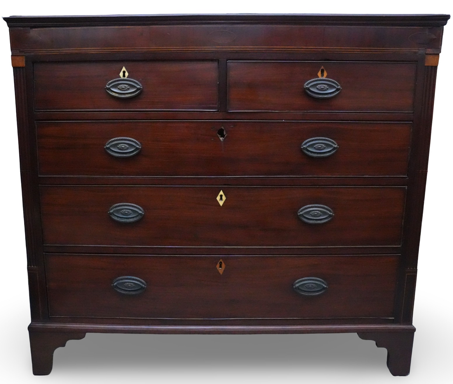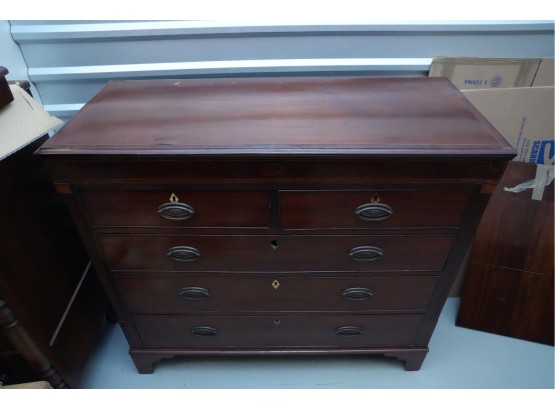 George III mahogany chest of drawers (circa 1770-1800), featuring two short, over three long drawers, original brass handles, and a rich patina. Missing one keyhole hardware. Some signs of damage due to age and use.