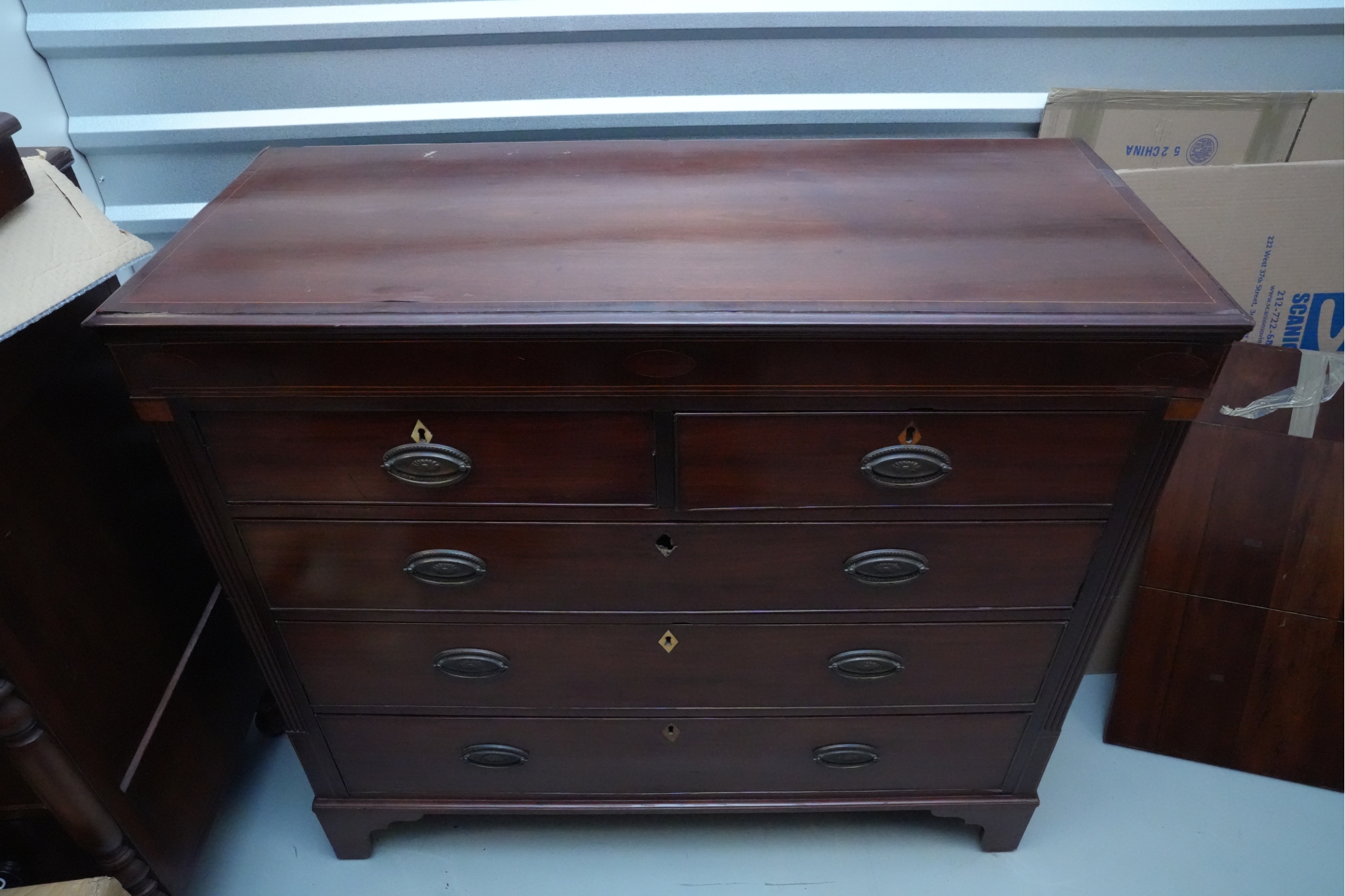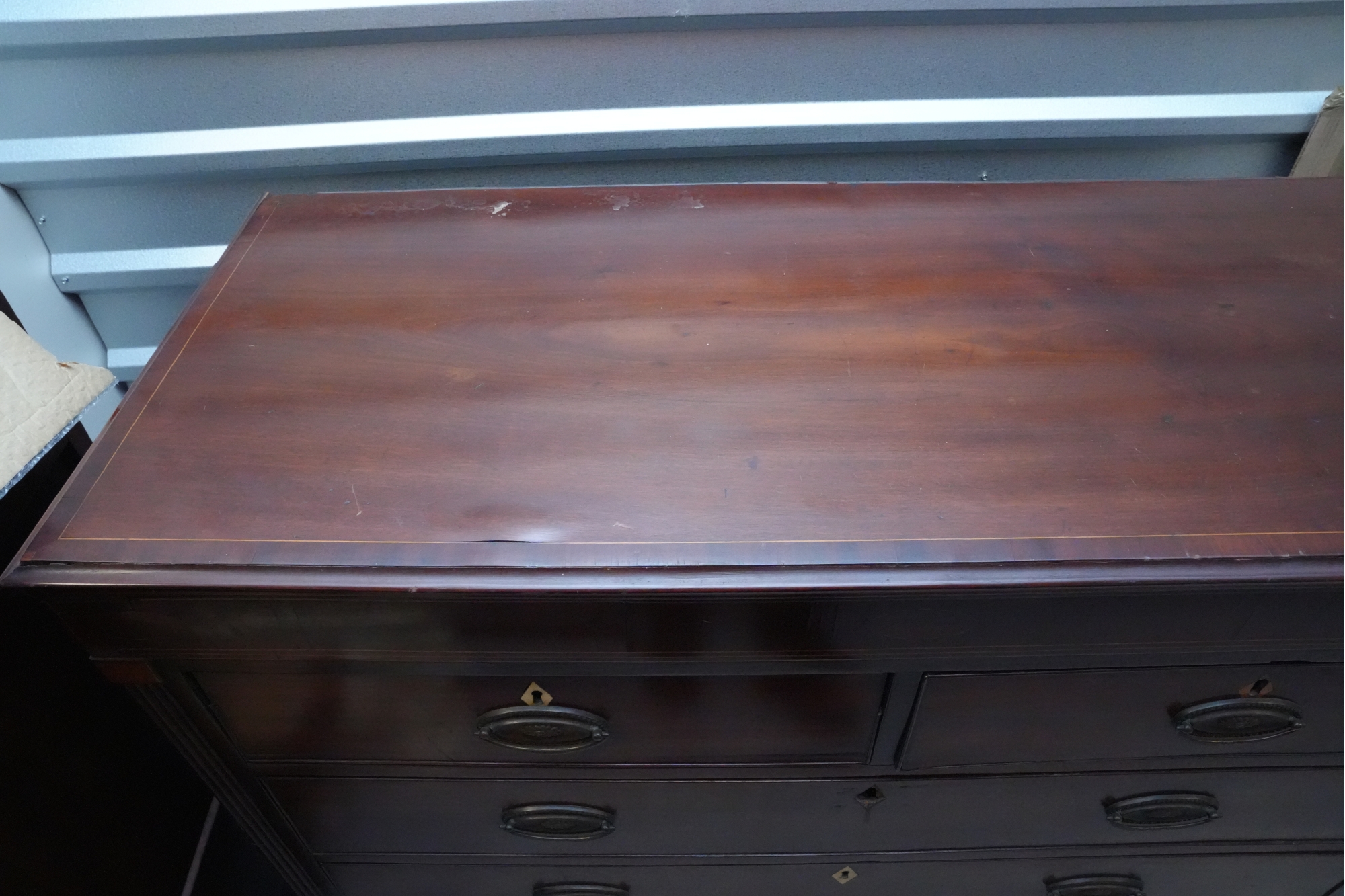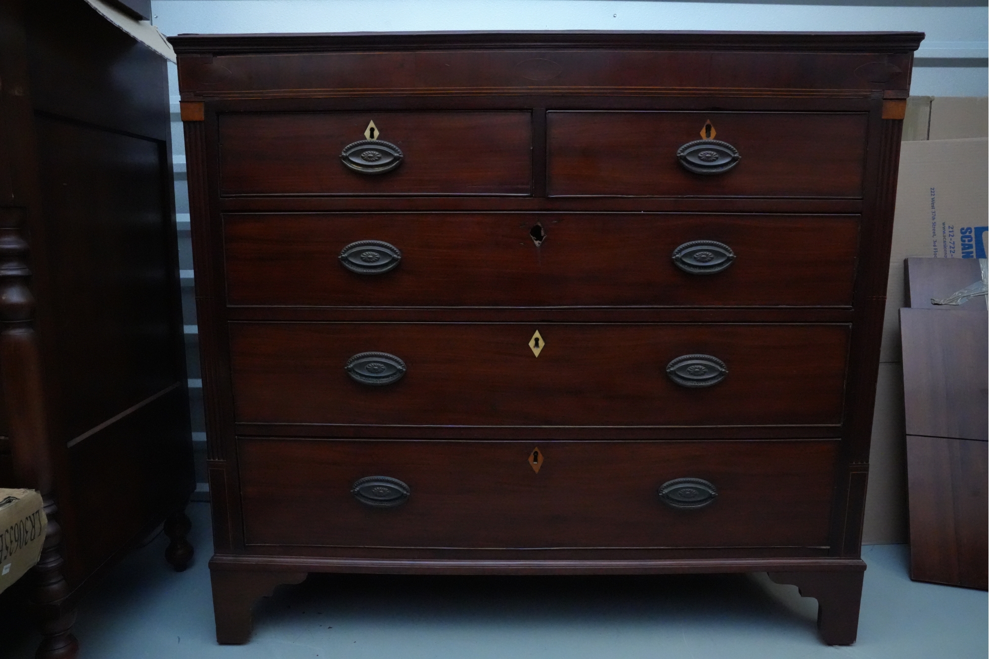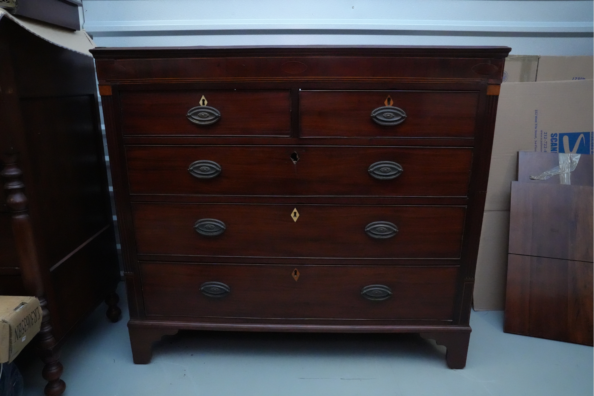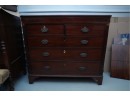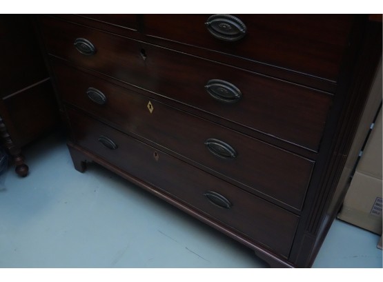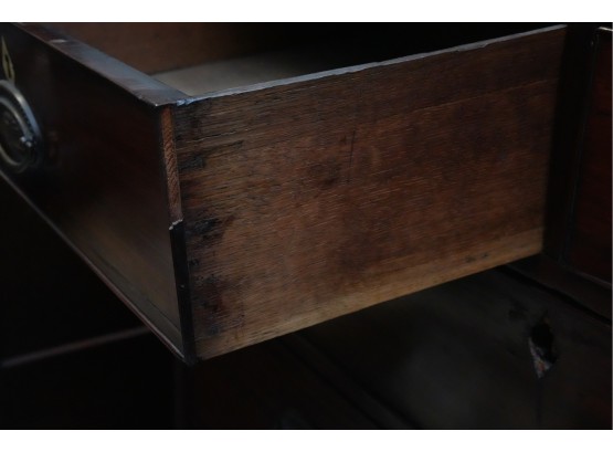 George III mahogany chest of drawers (circa 1770-1800), featuring two short, over three long drawers, original brass handles, and a rich patina. Missing one keyhole hardware. Some signs of damage due to age and use.