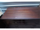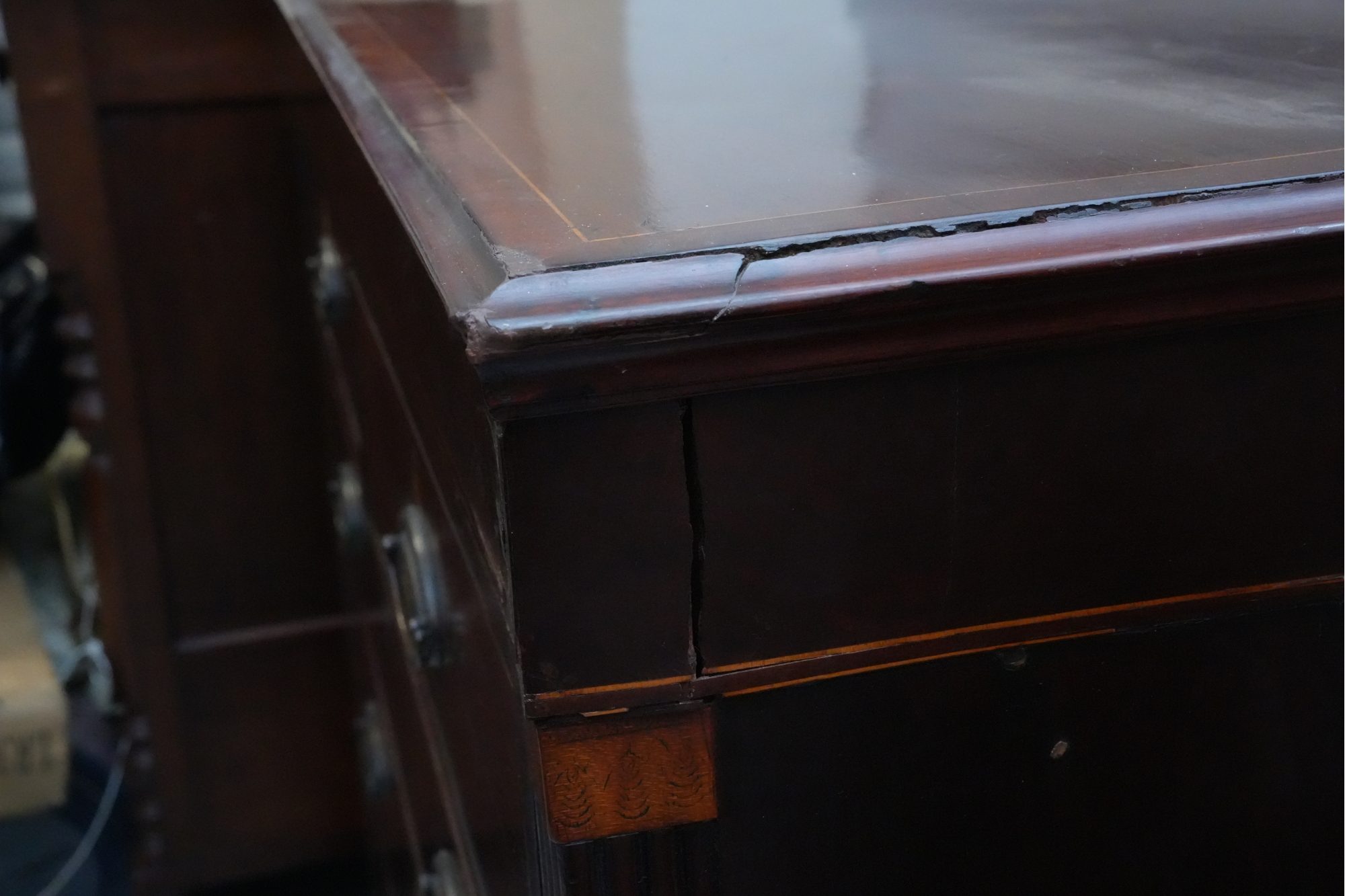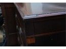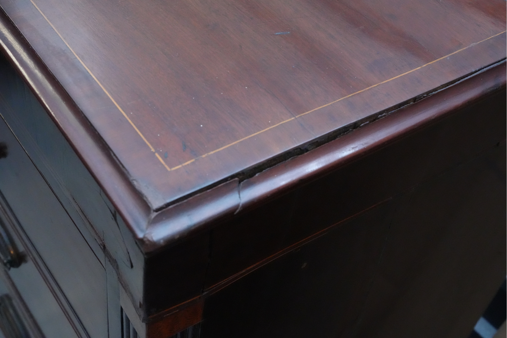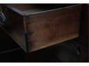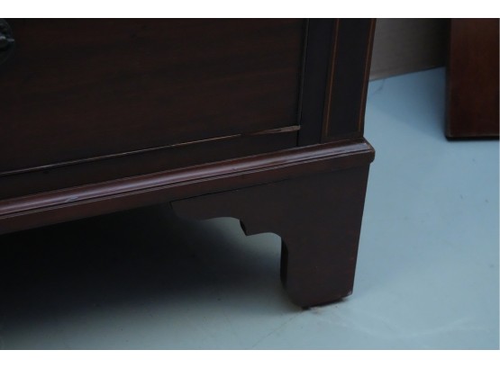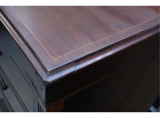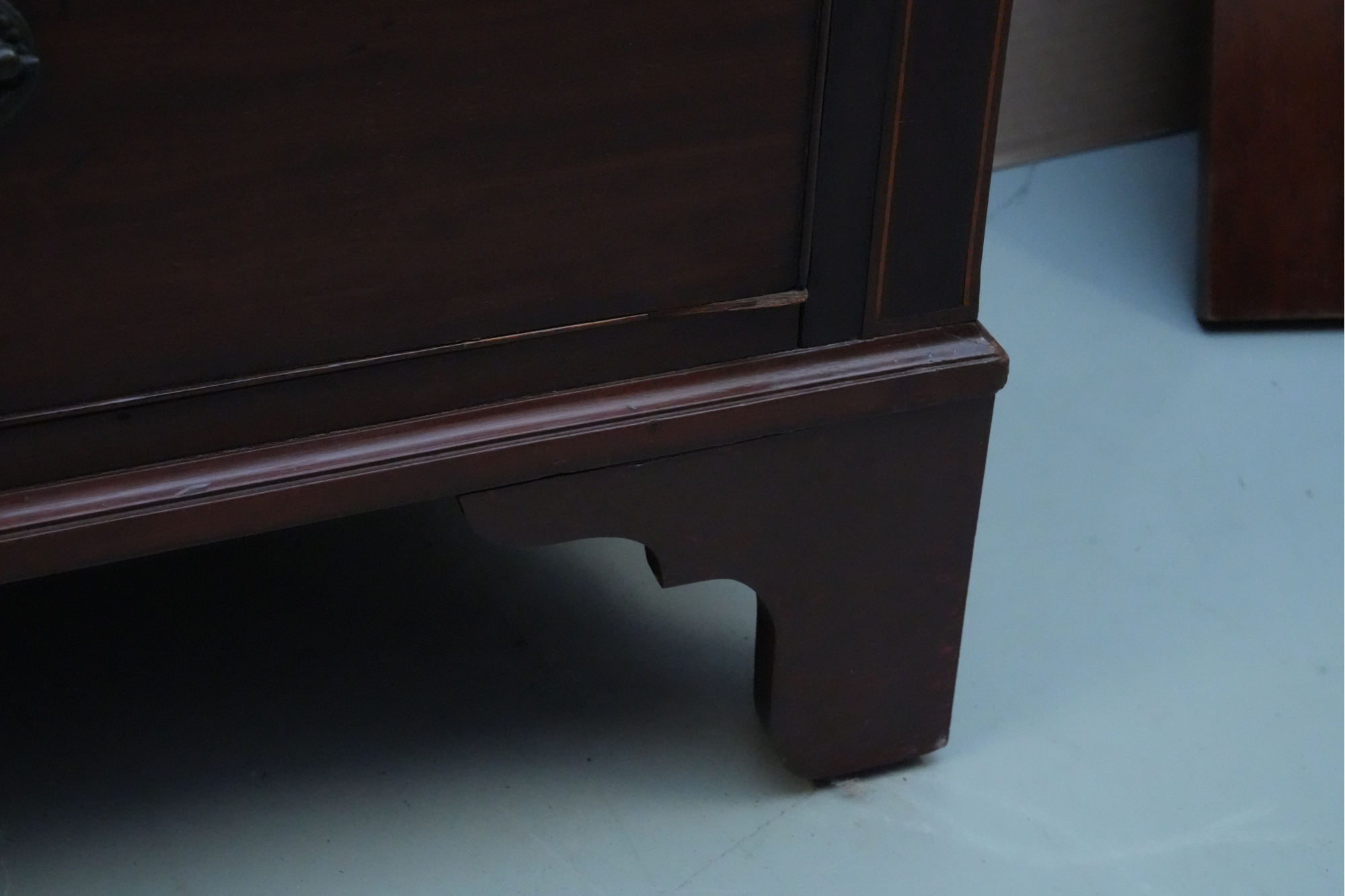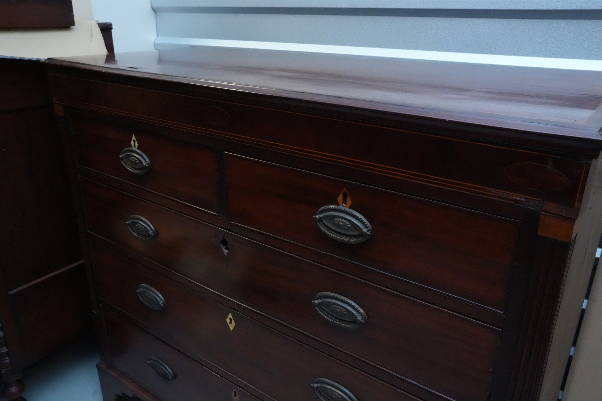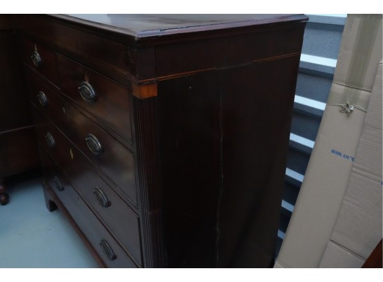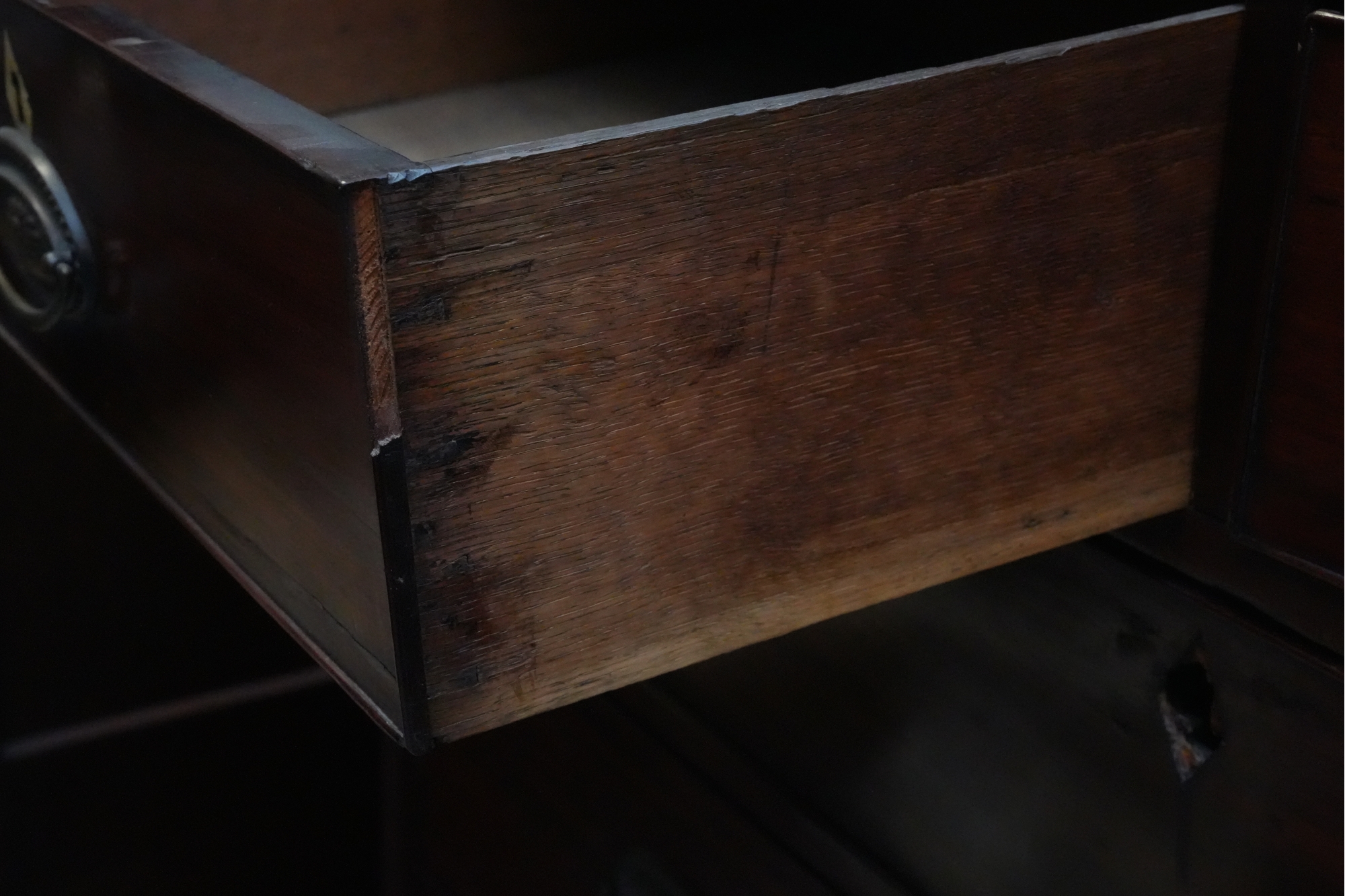 George III mahogany chest of drawers (circa 1770-1800), featuring two short, over three long drawers, original brass handles, and a rich patina. Missing one keyhole hardware. Some signs of damage due to age and use.