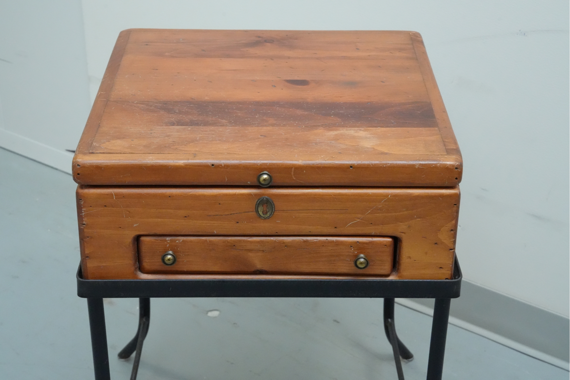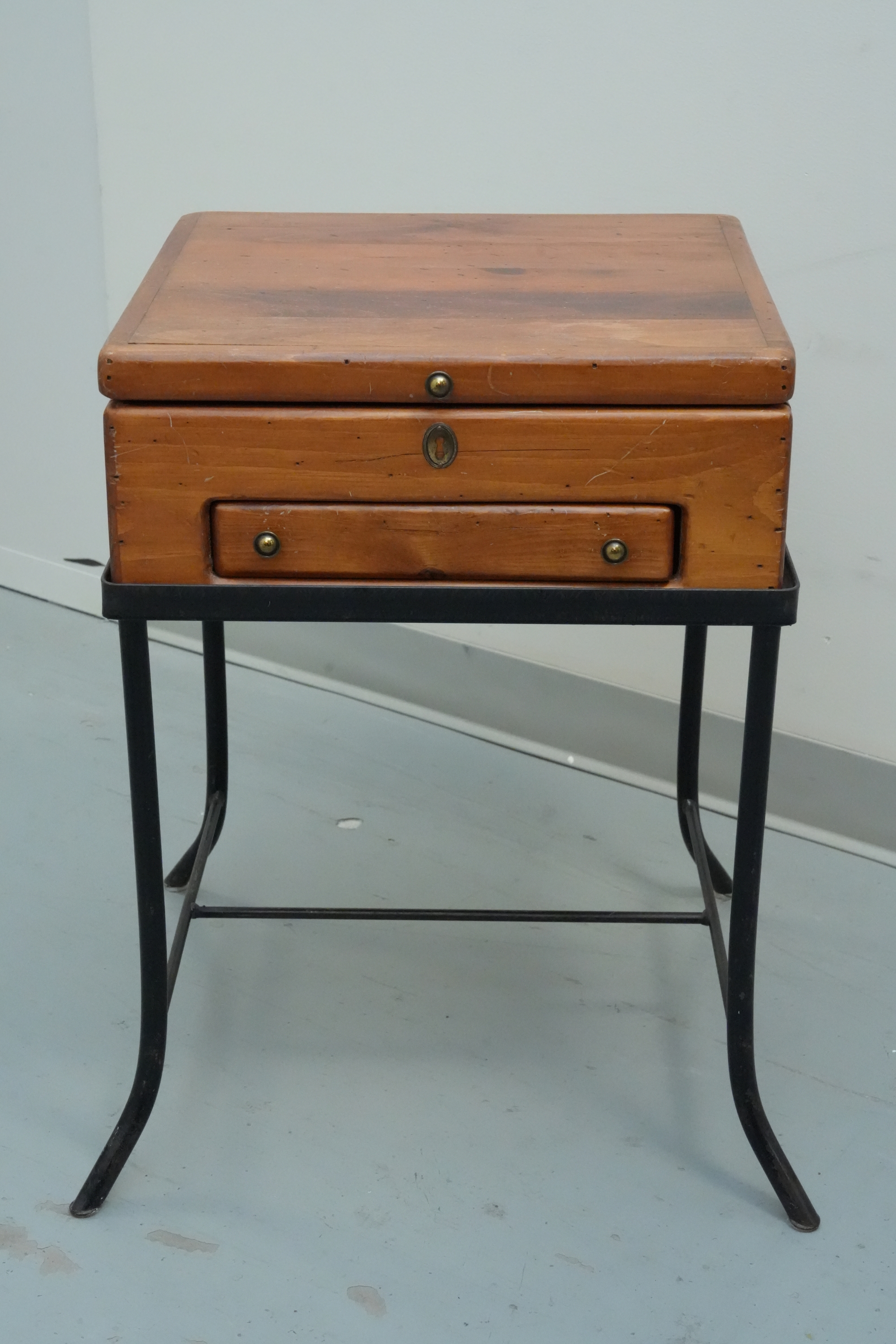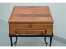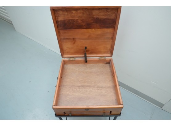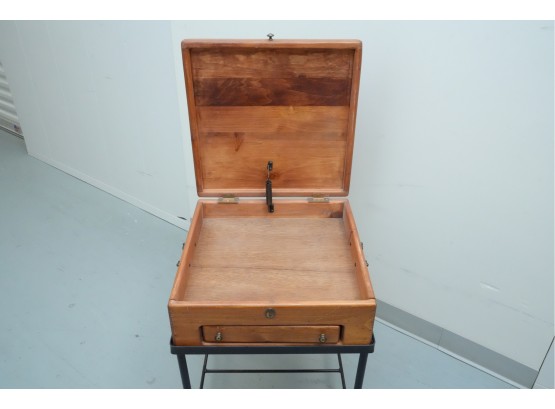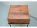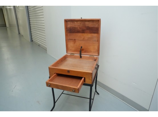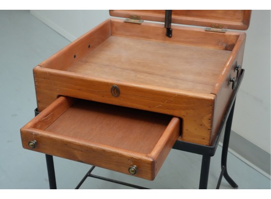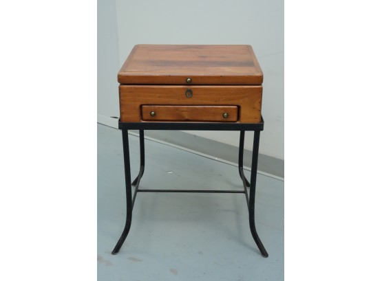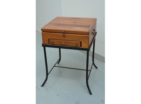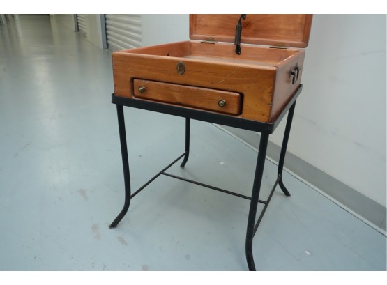 Vintage 1990s Georgian-style pine box on an iron stand, featuring a single drawer and removable box, suitable for use as an accent or side table.