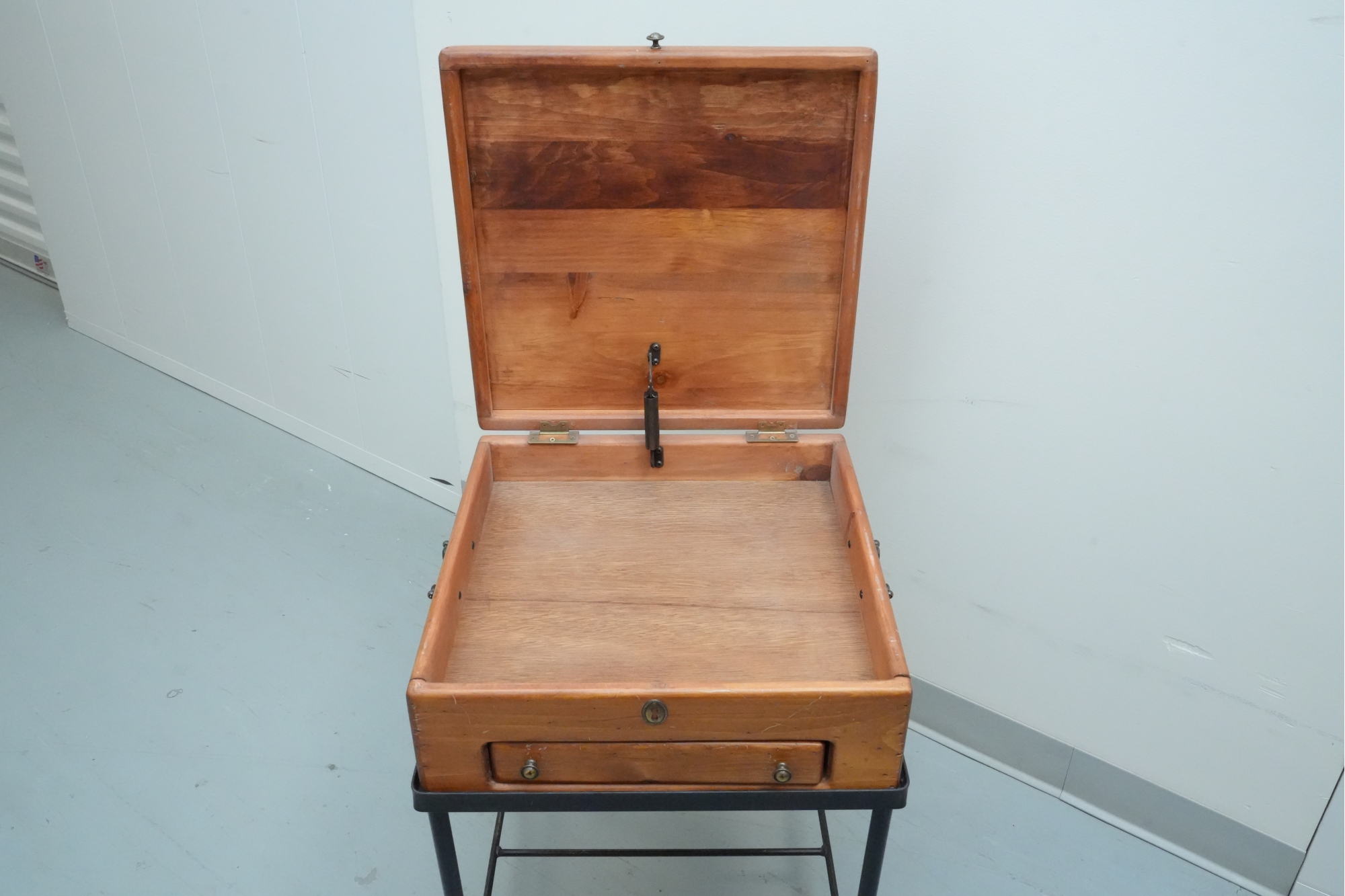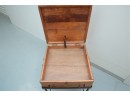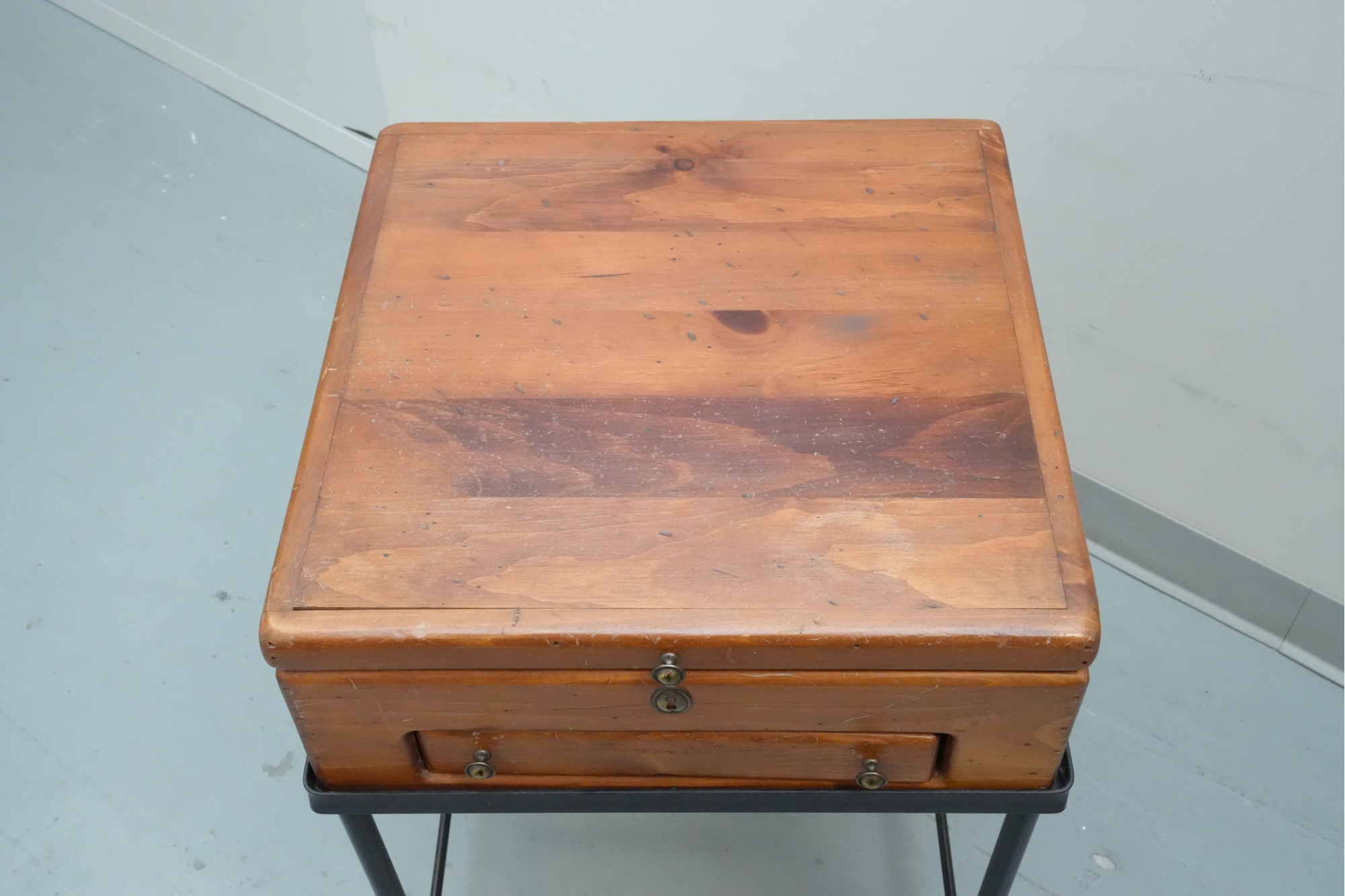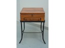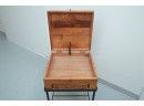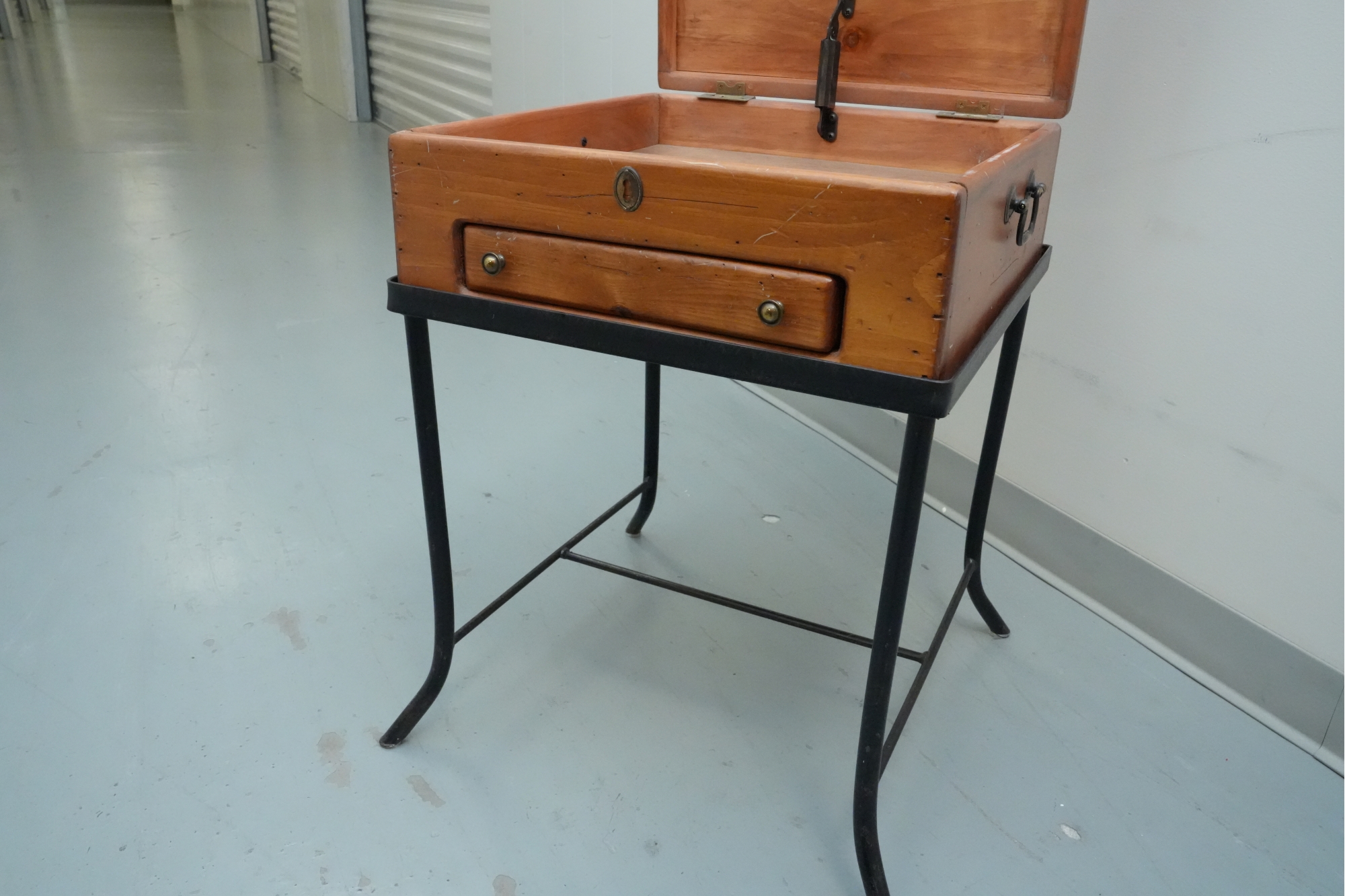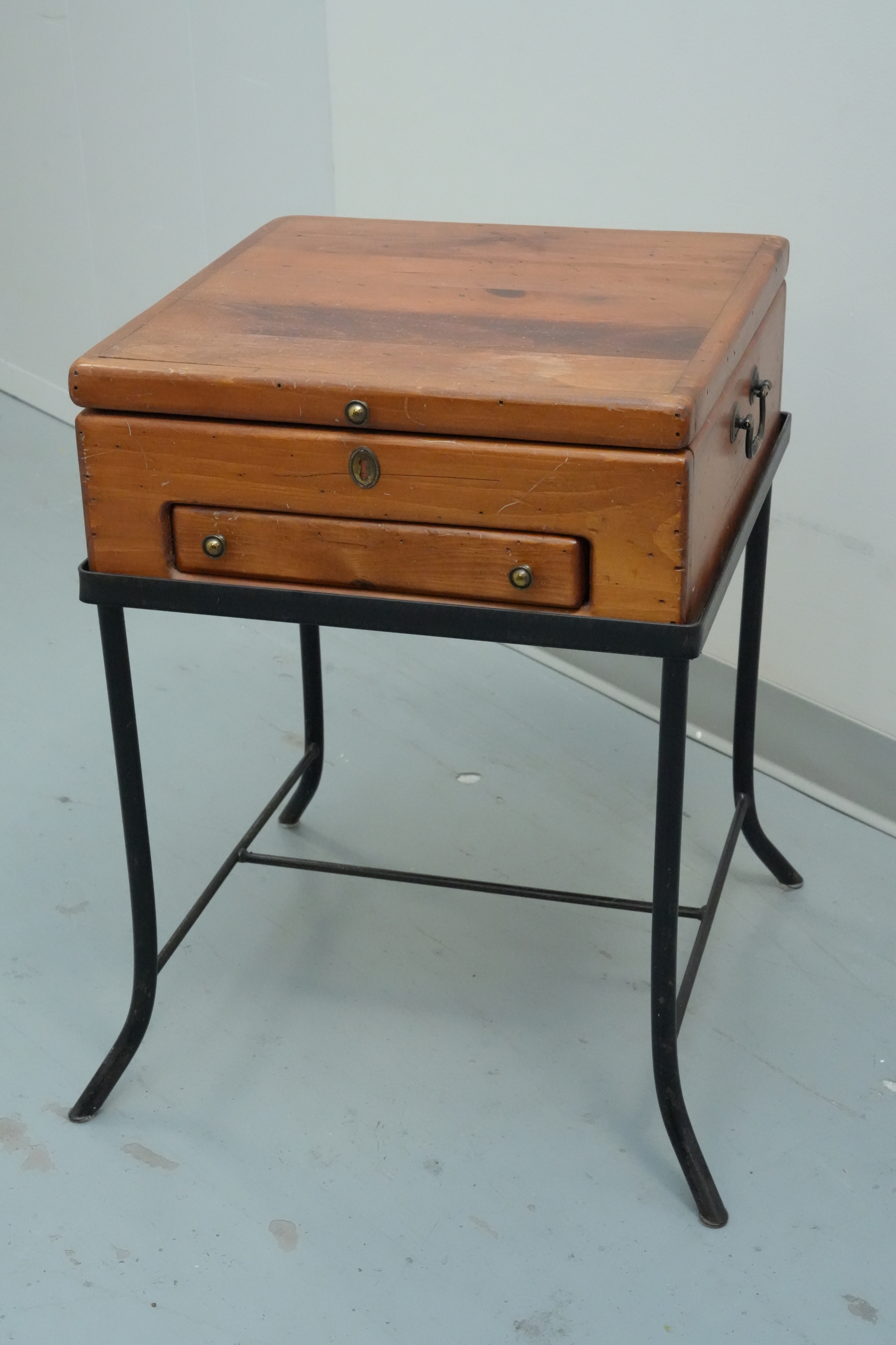 Vintage 1990s Georgian-style pine box on an iron stand, featuring a single drawer and removable box, suitable for use as an accent or side table.