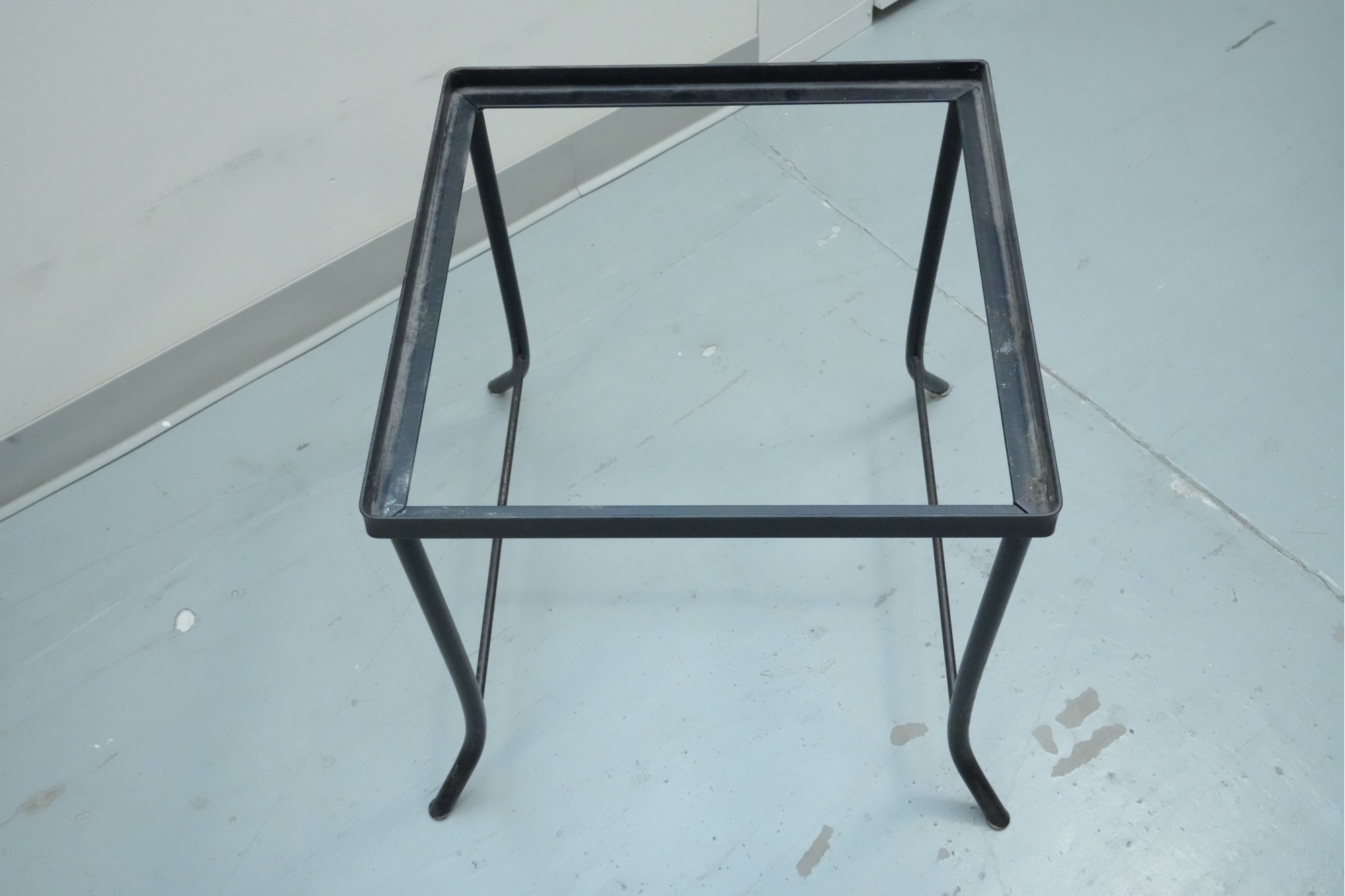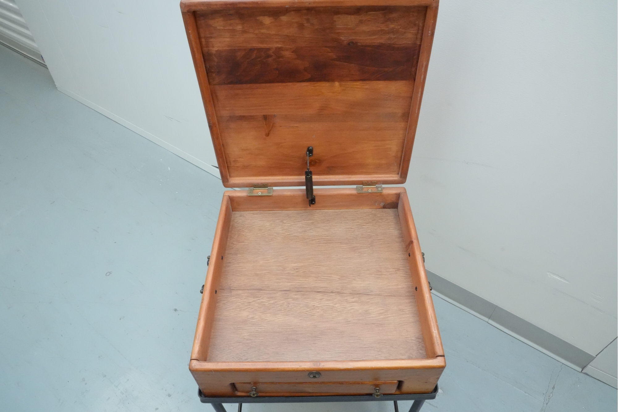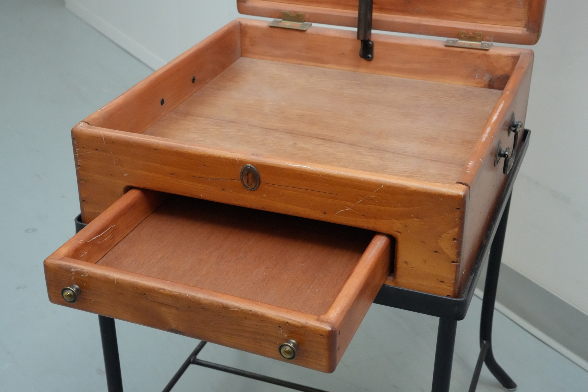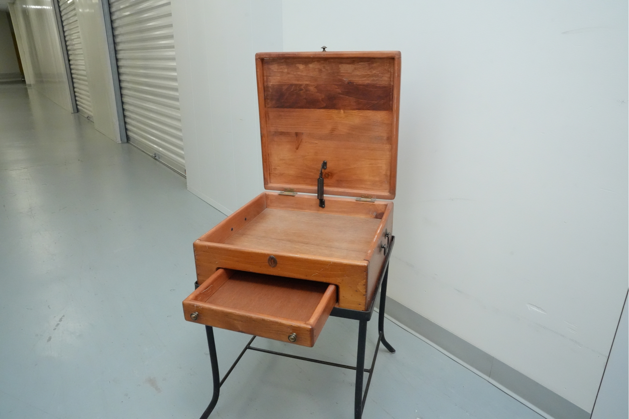Vintage 1990s Georgian-style pine box on an iron stand, featuring a single drawer and removable box, suitable for use as an accent or side table.
