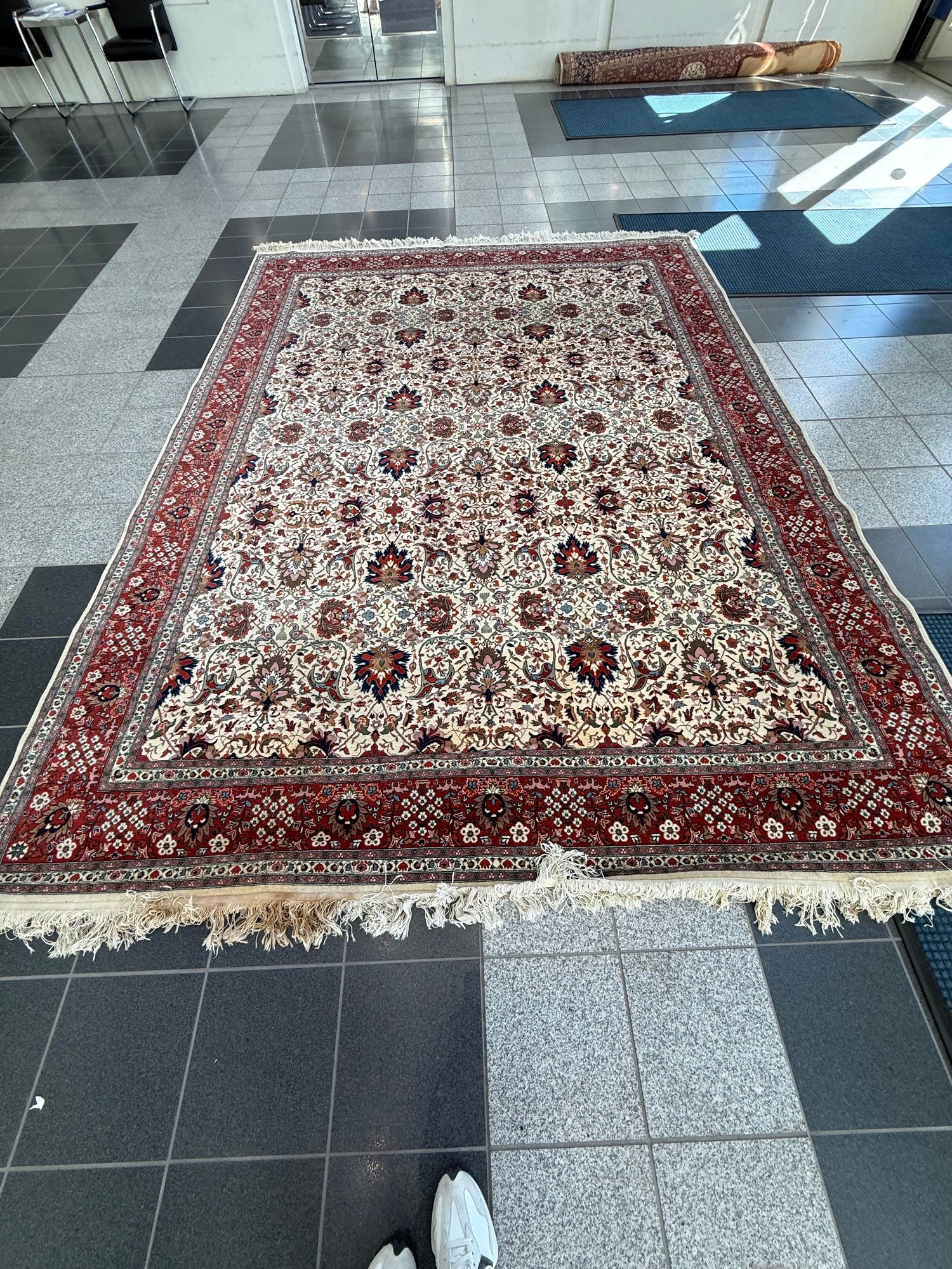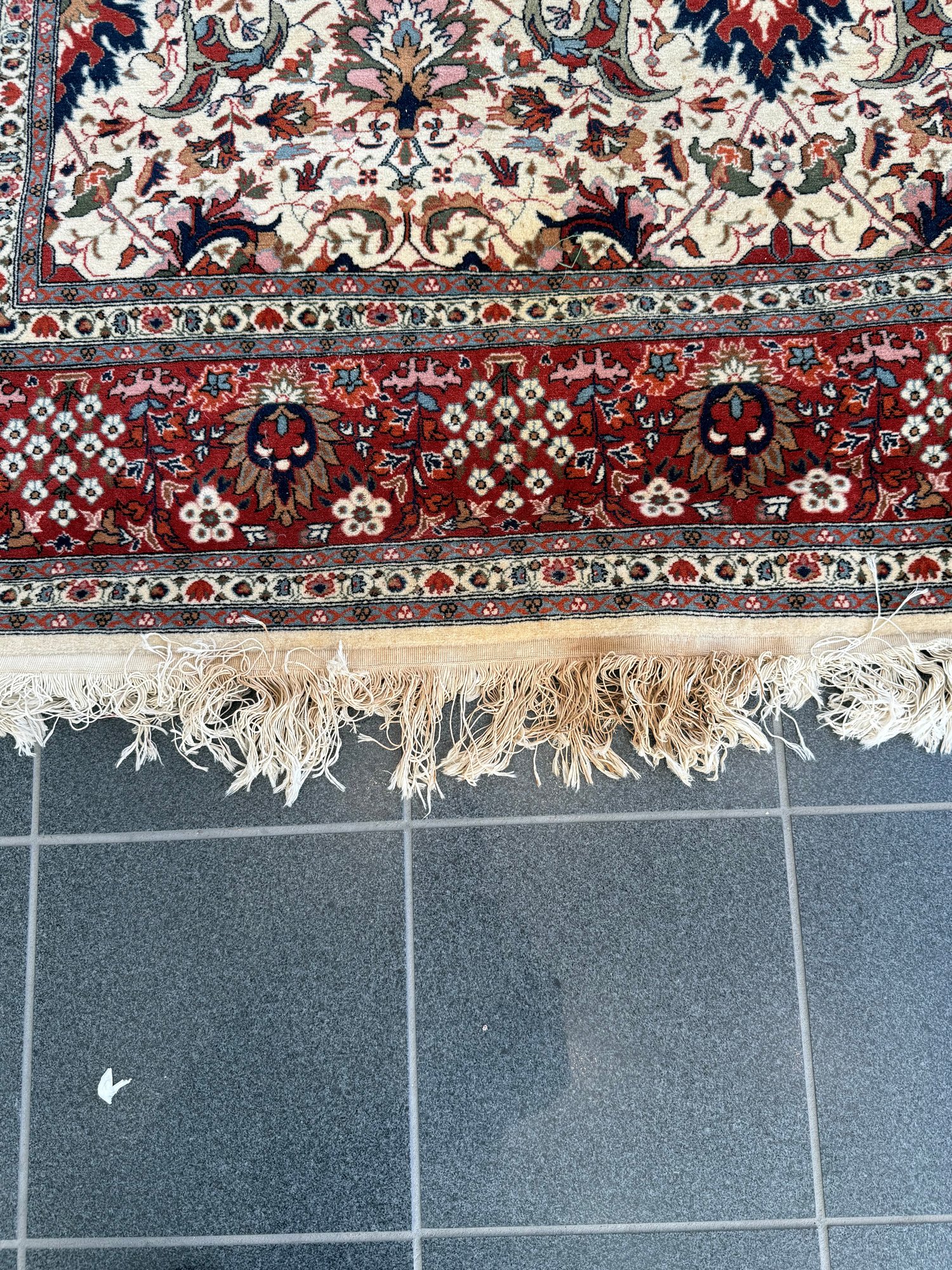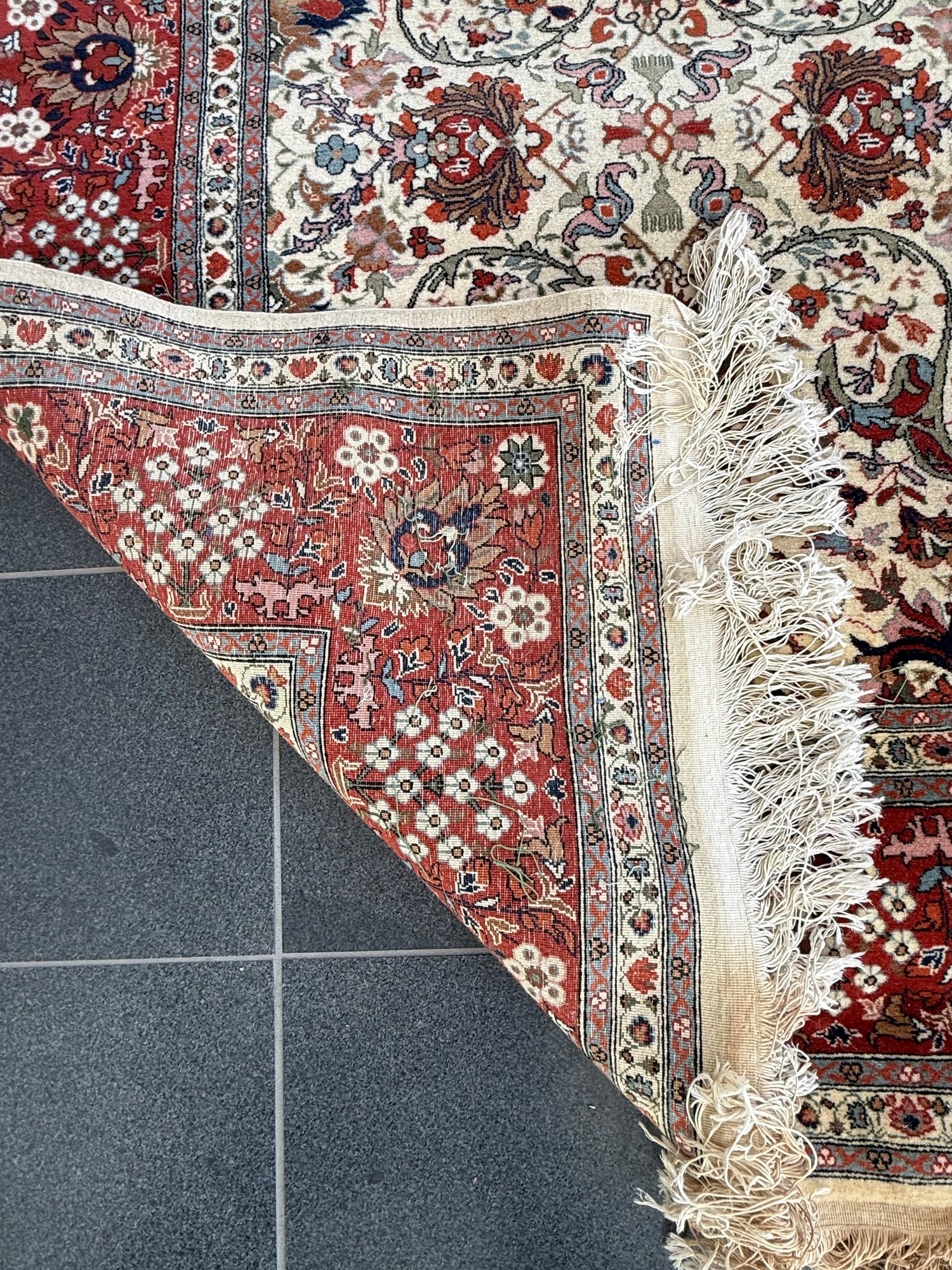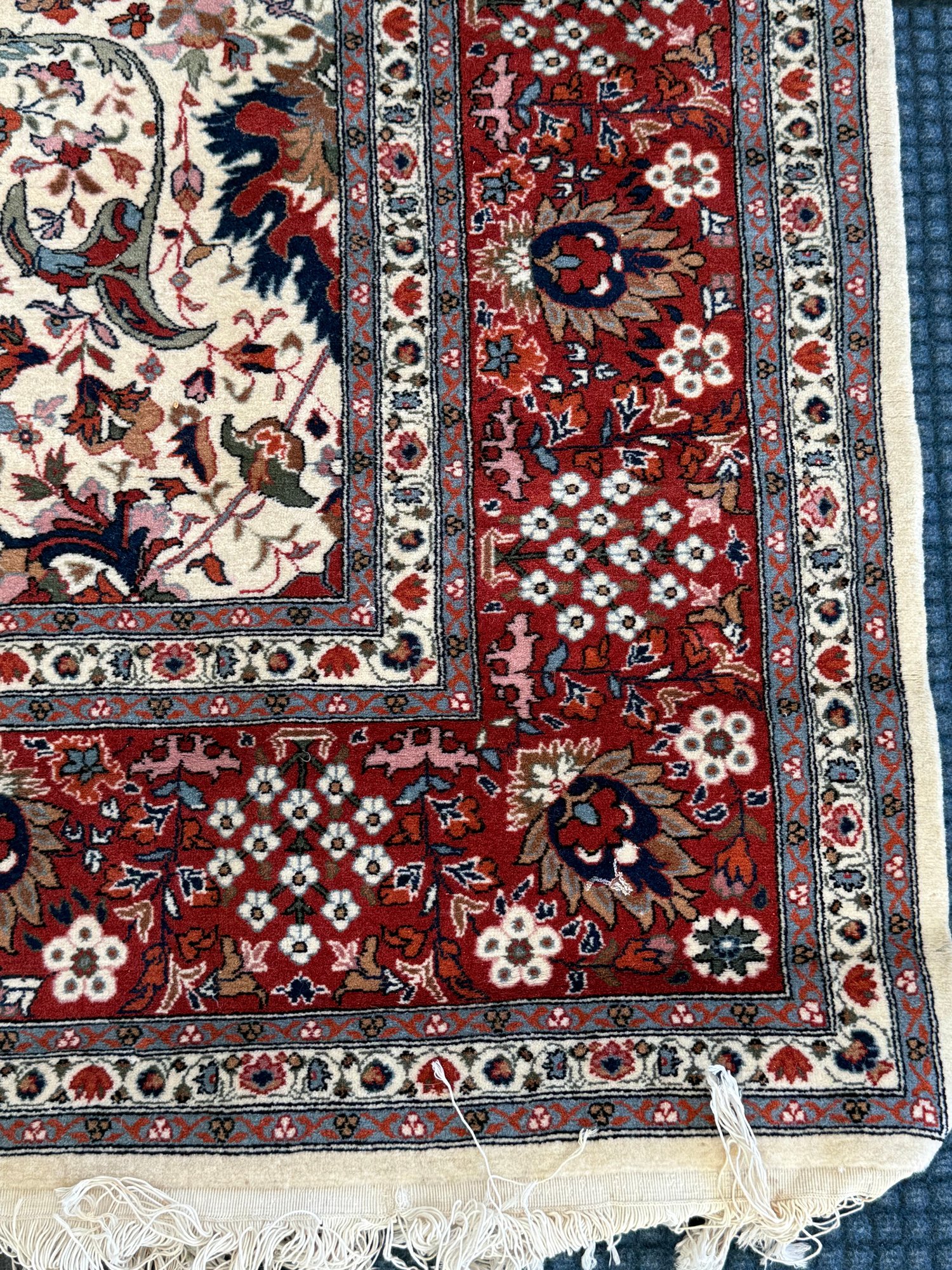 Persian Isfahan hand-knotted wool and silk area rug featuring a floral medallion design in beige and red tones. Some signs of wear on the fringe due to age and use.