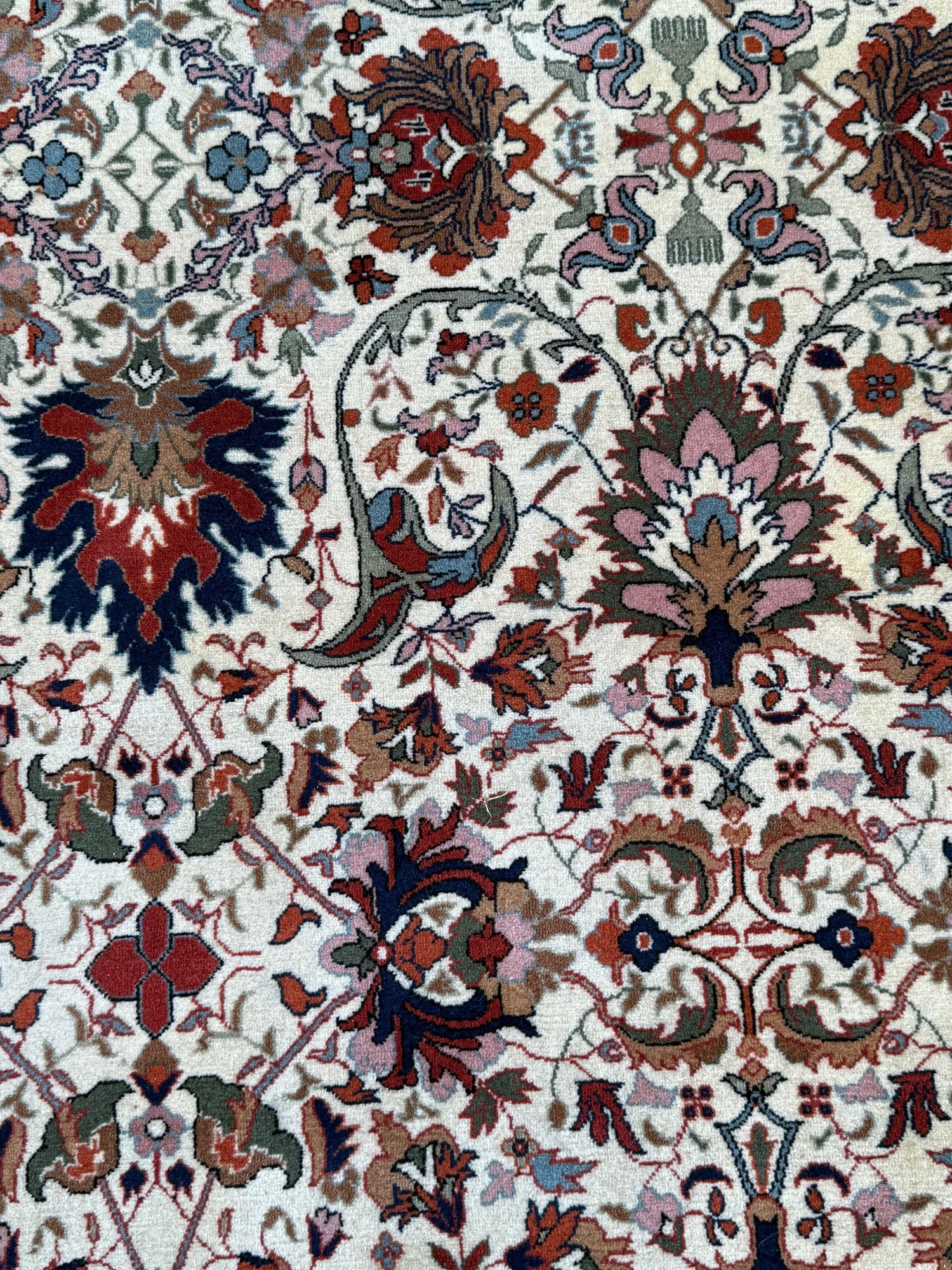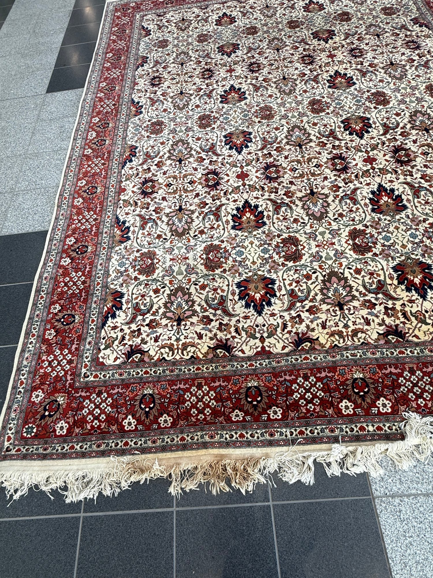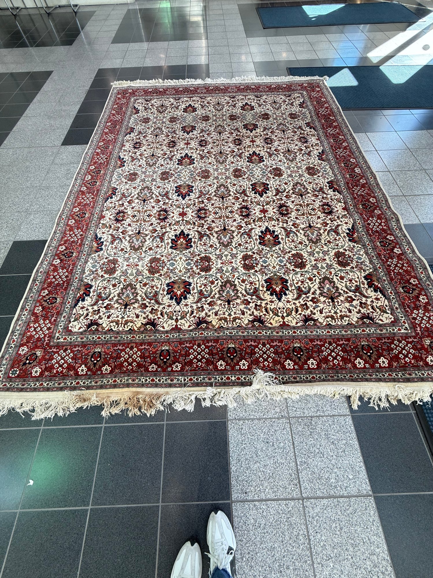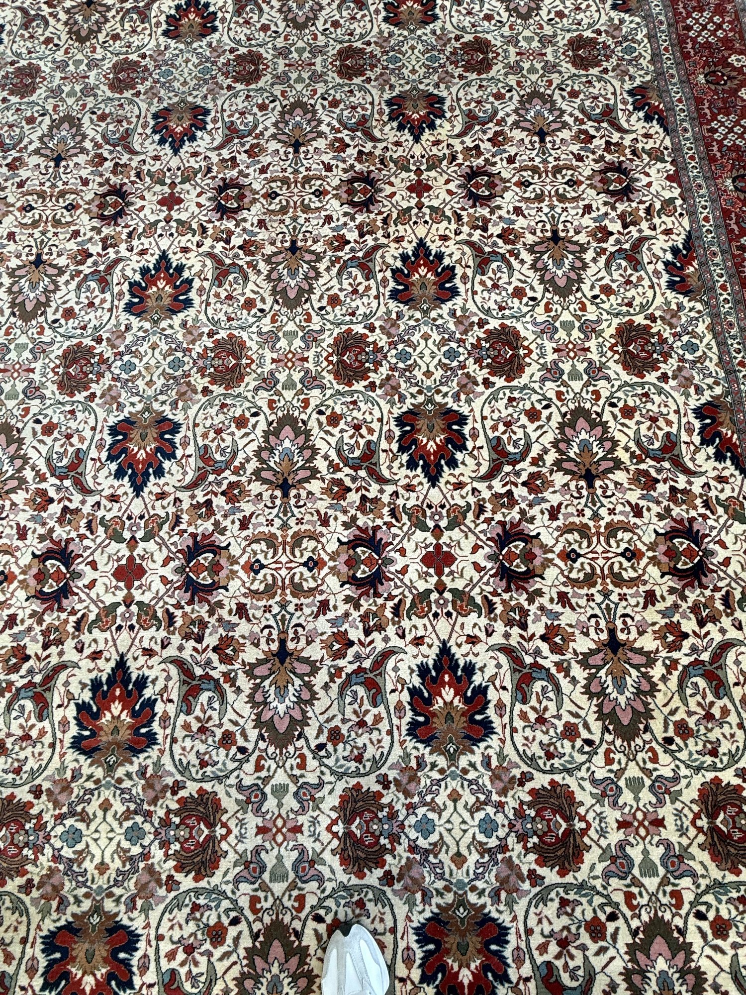 Persian Isfahan hand-knotted wool and silk area rug featuring a floral medallion design in beige and red tones. Some signs of wear on the fringe due to age and use.