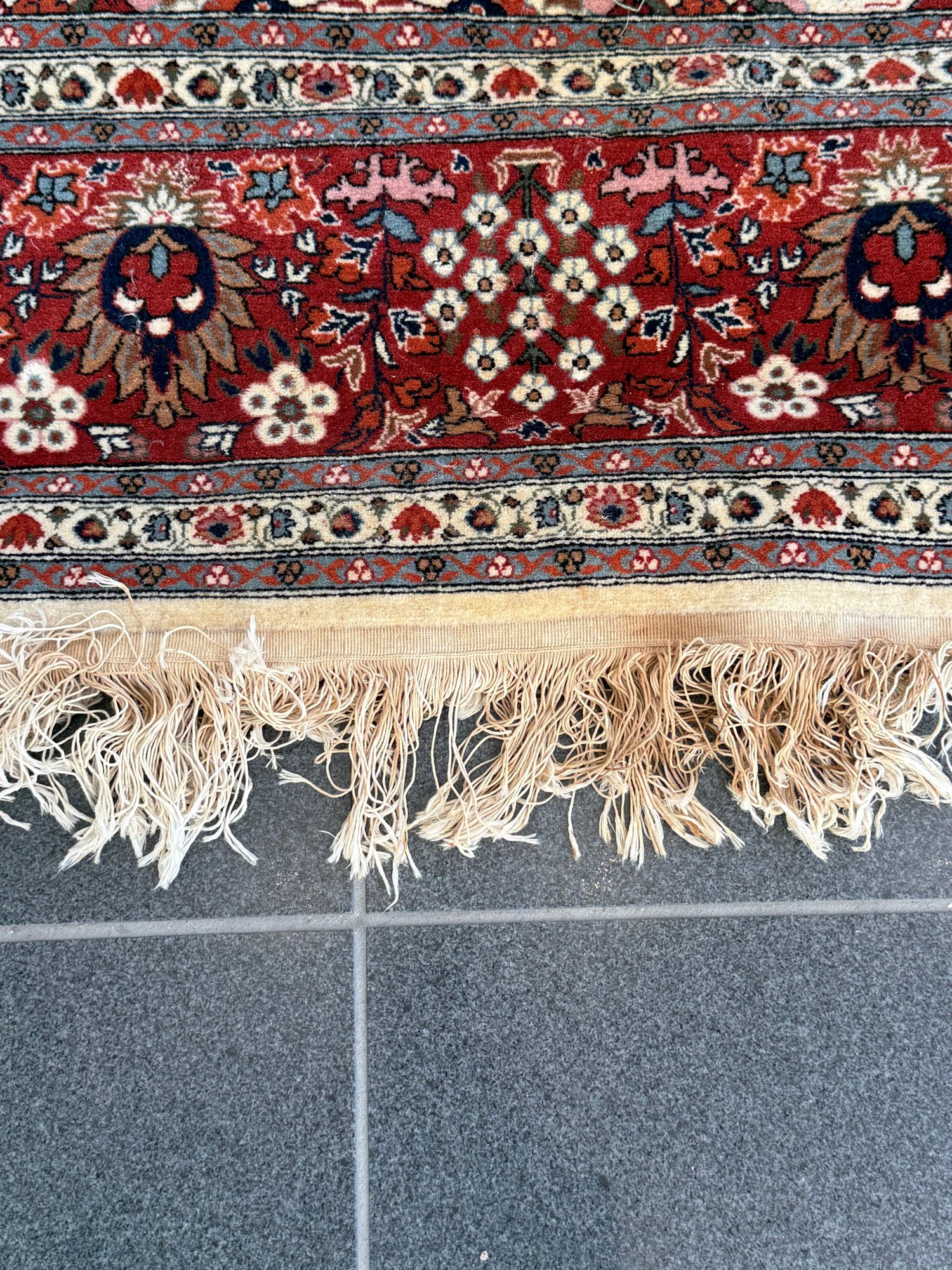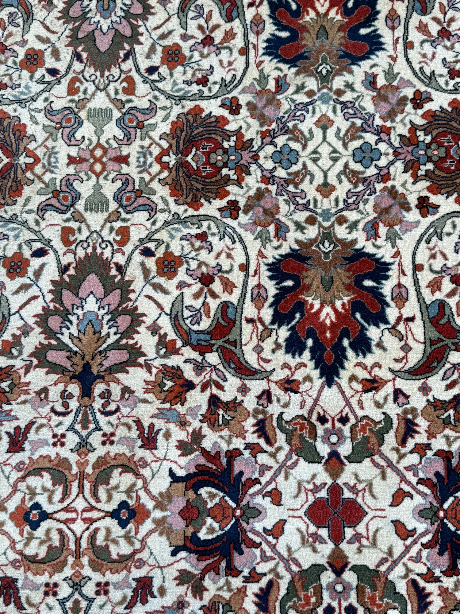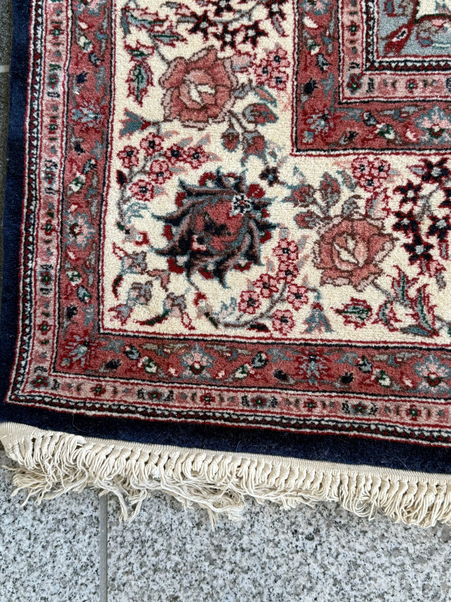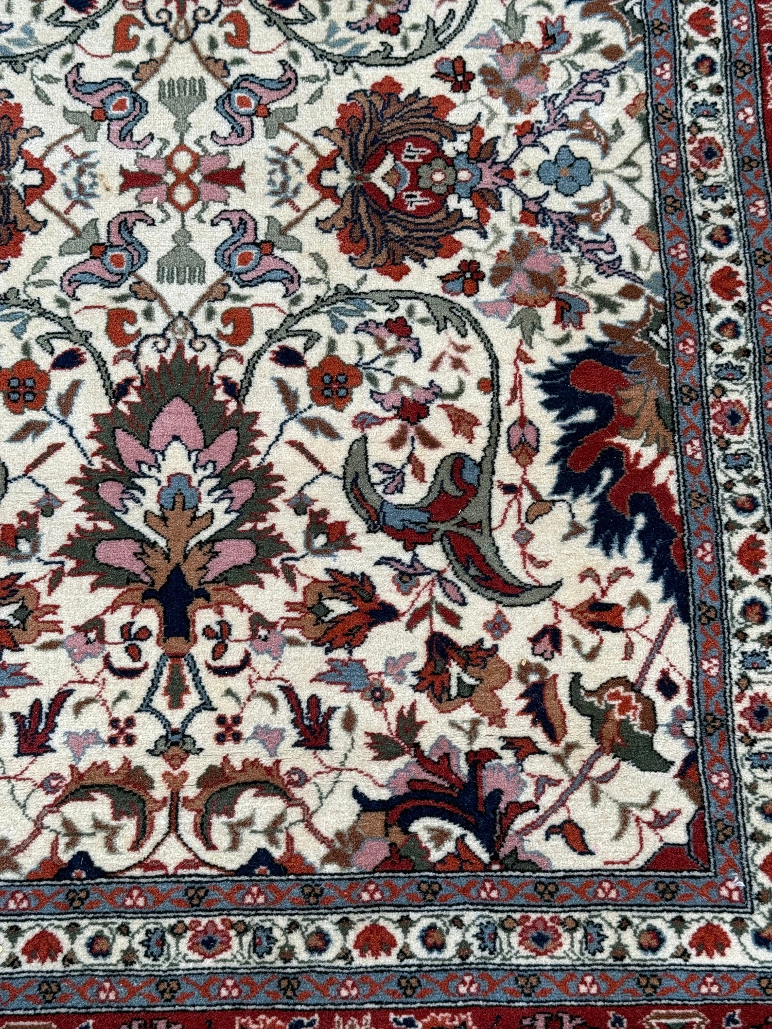 Persian Isfahan hand-knotted wool and silk area rug featuring a floral medallion design in beige and red tones. Some signs of wear on the fringe due to age and use.