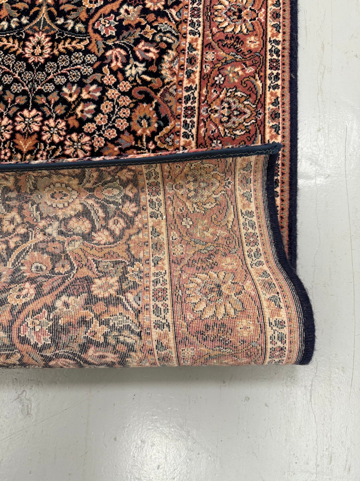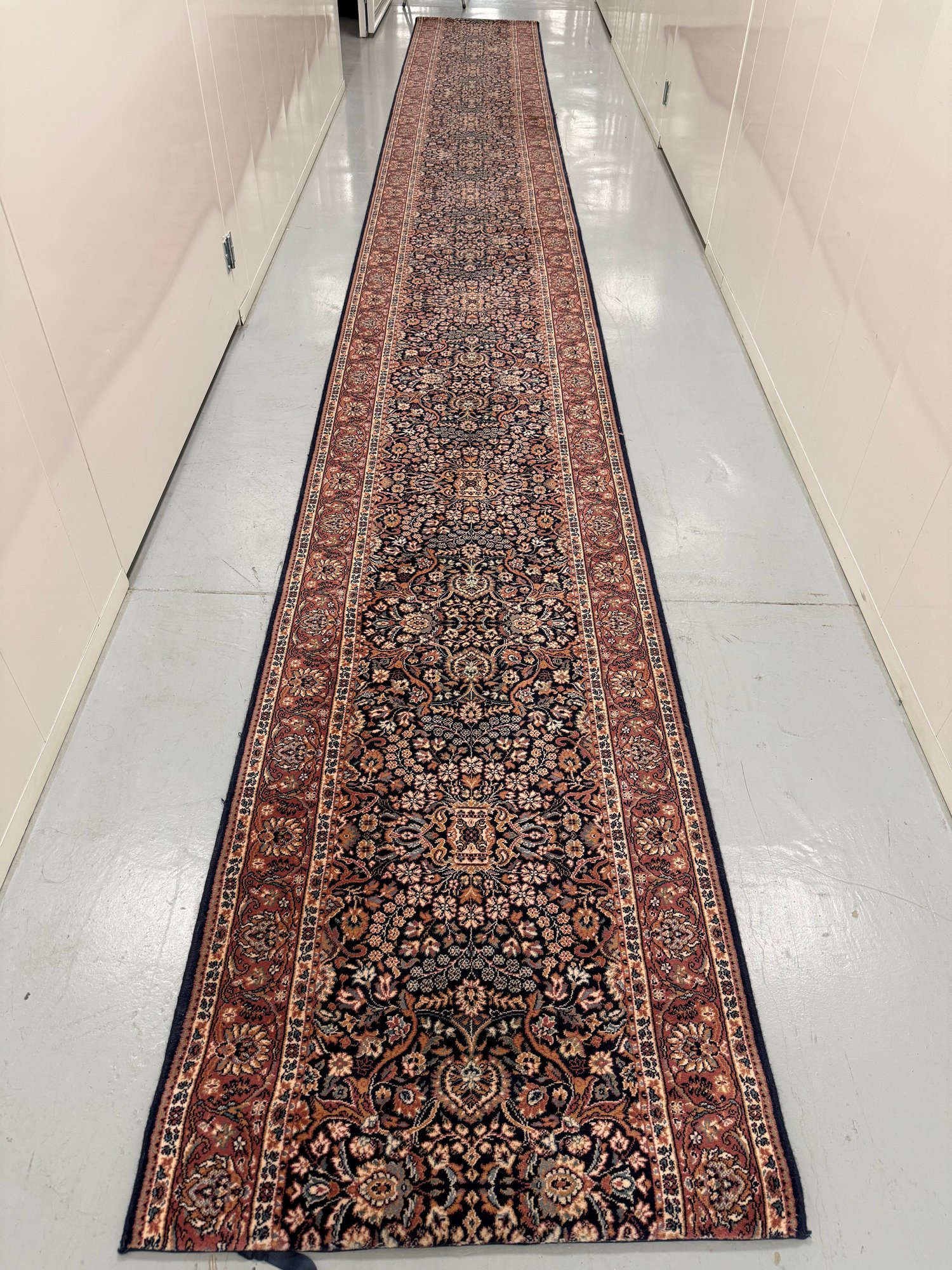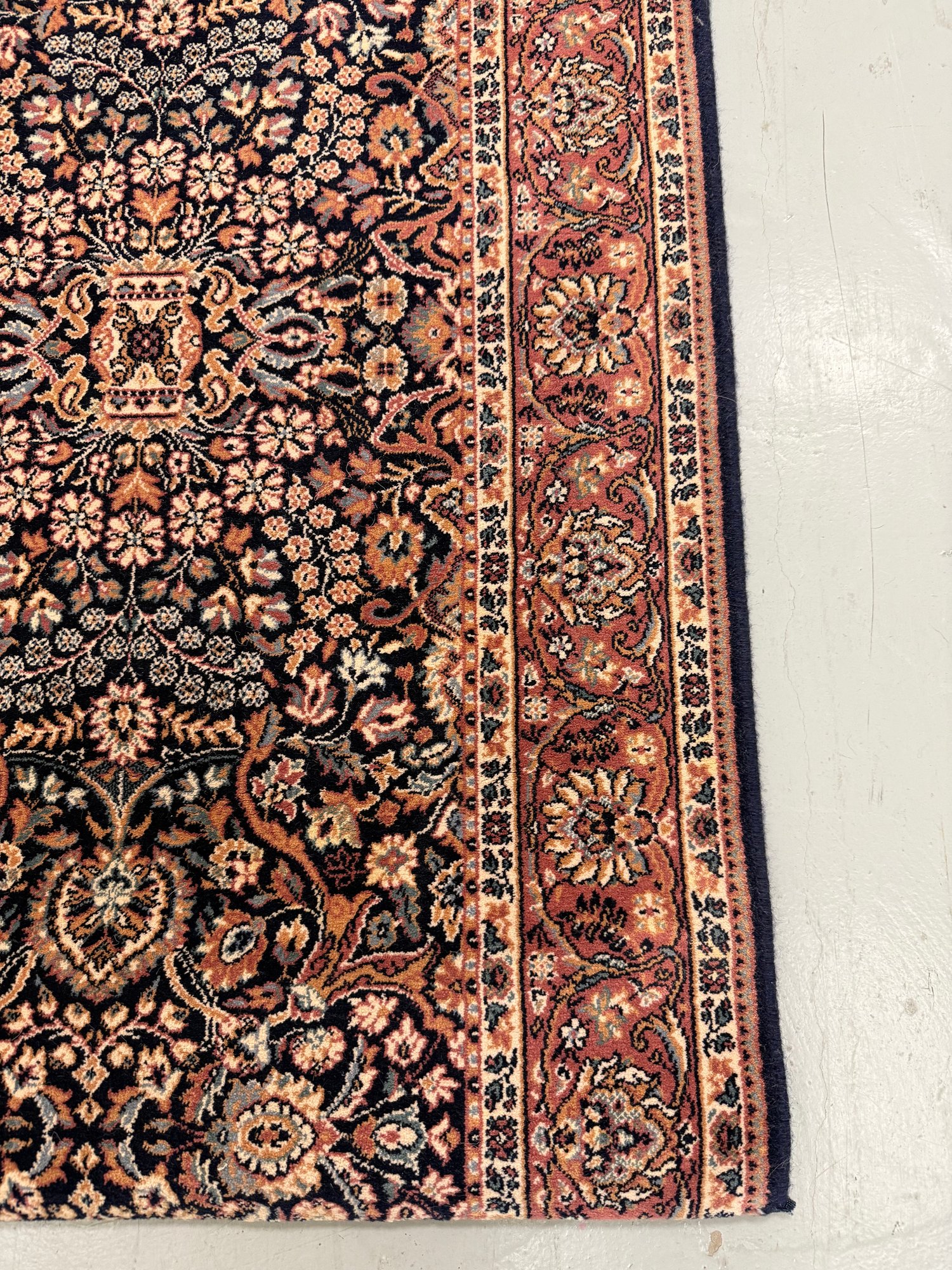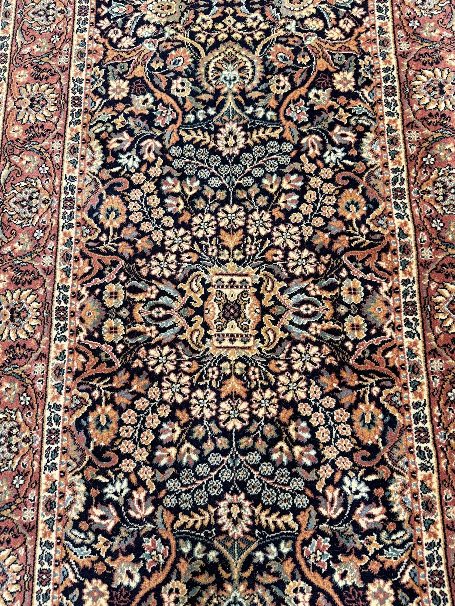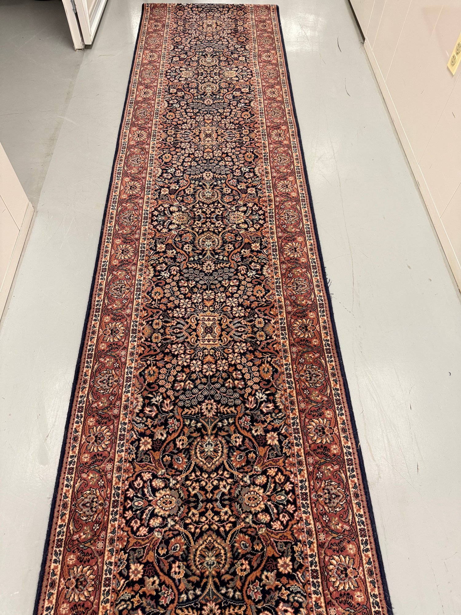 Persian Nain wool and silk long runner rug with a traditional floral pattern and a navy blue background.