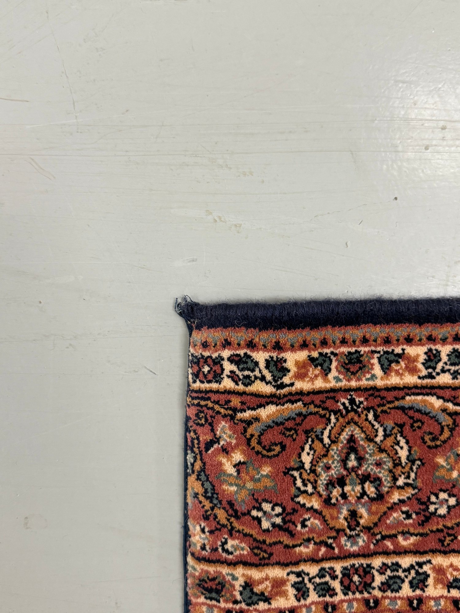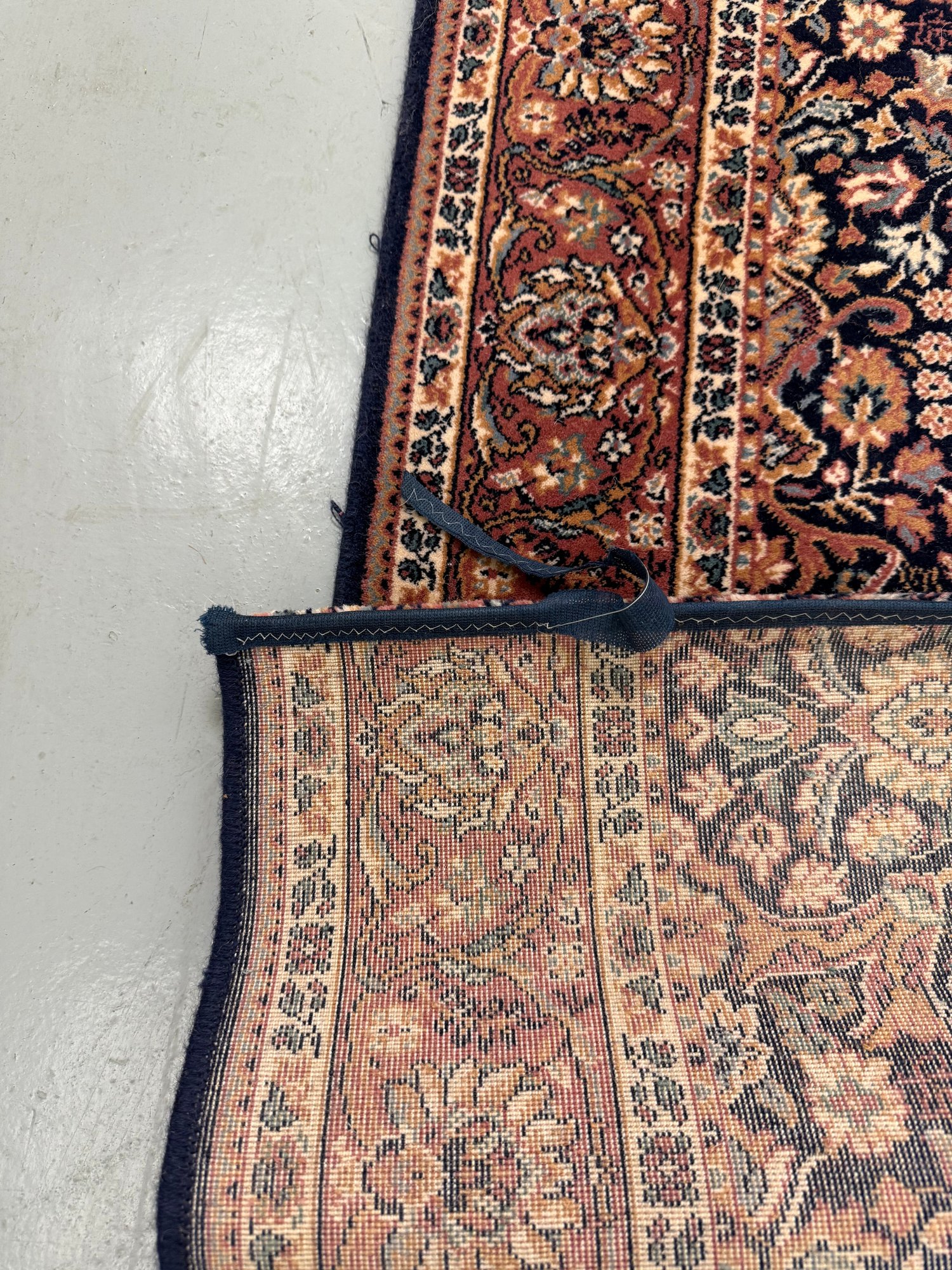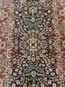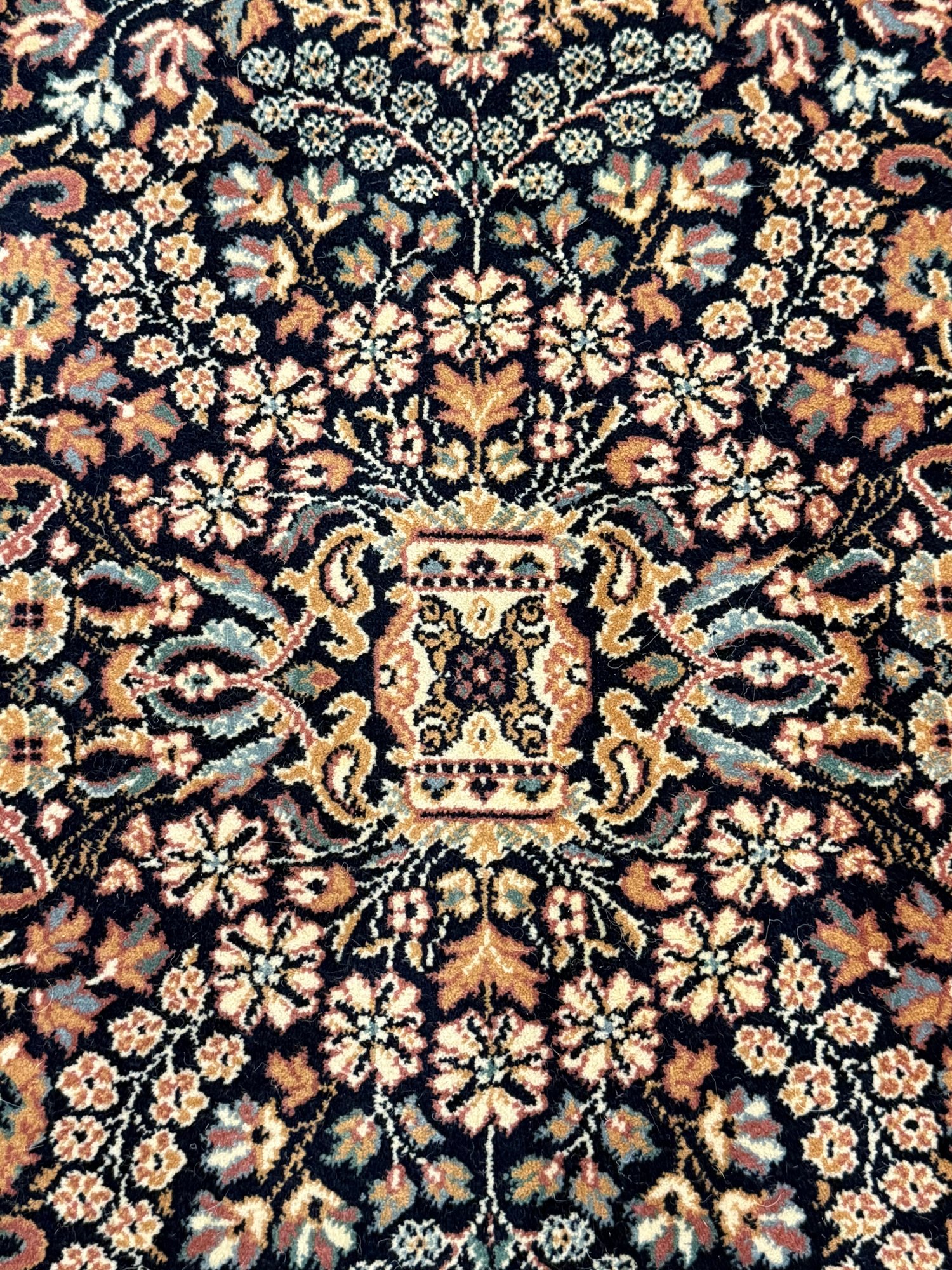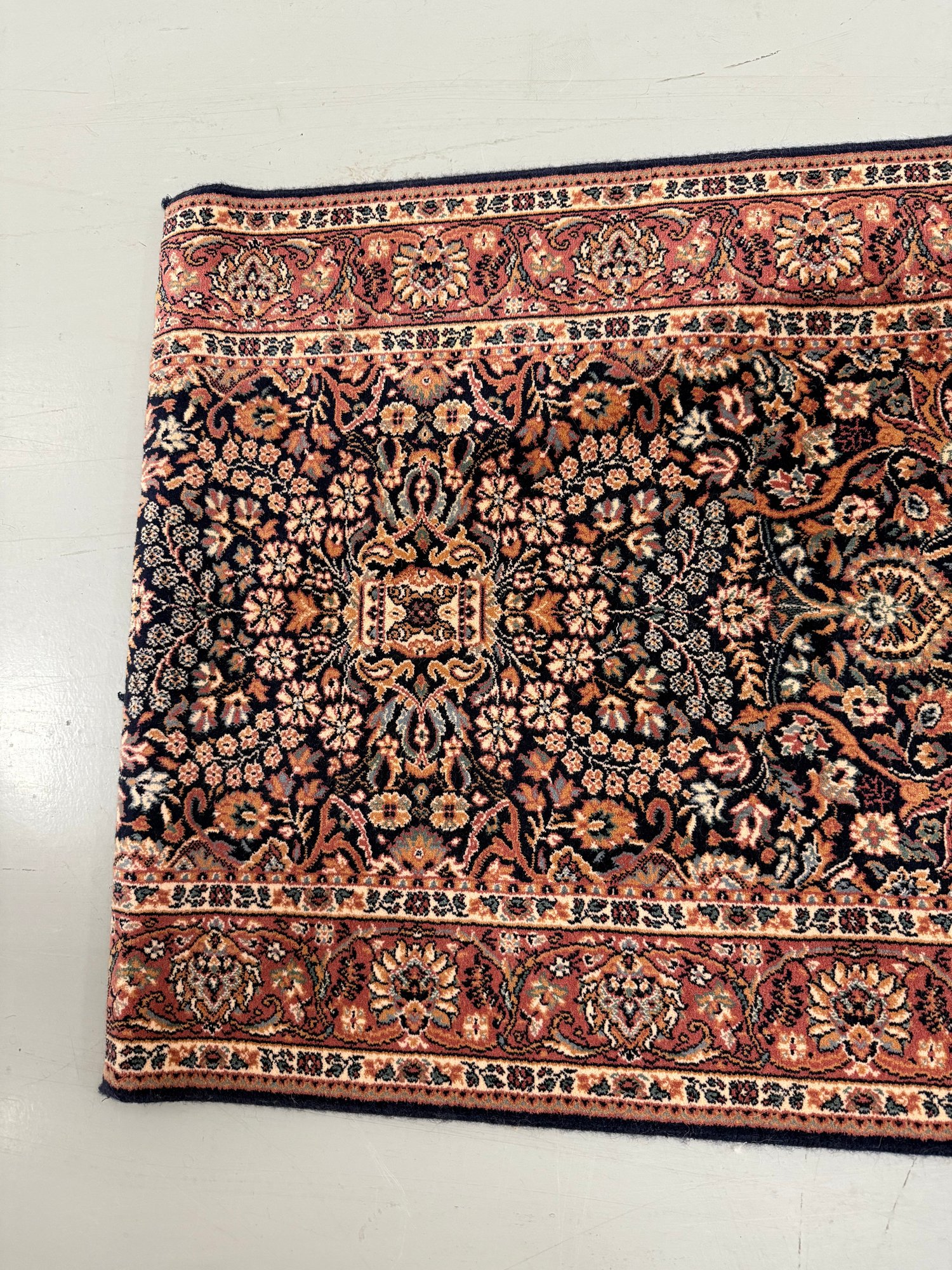 Persian Nain wool and silk long runner rug with a traditional floral pattern and a navy blue background.