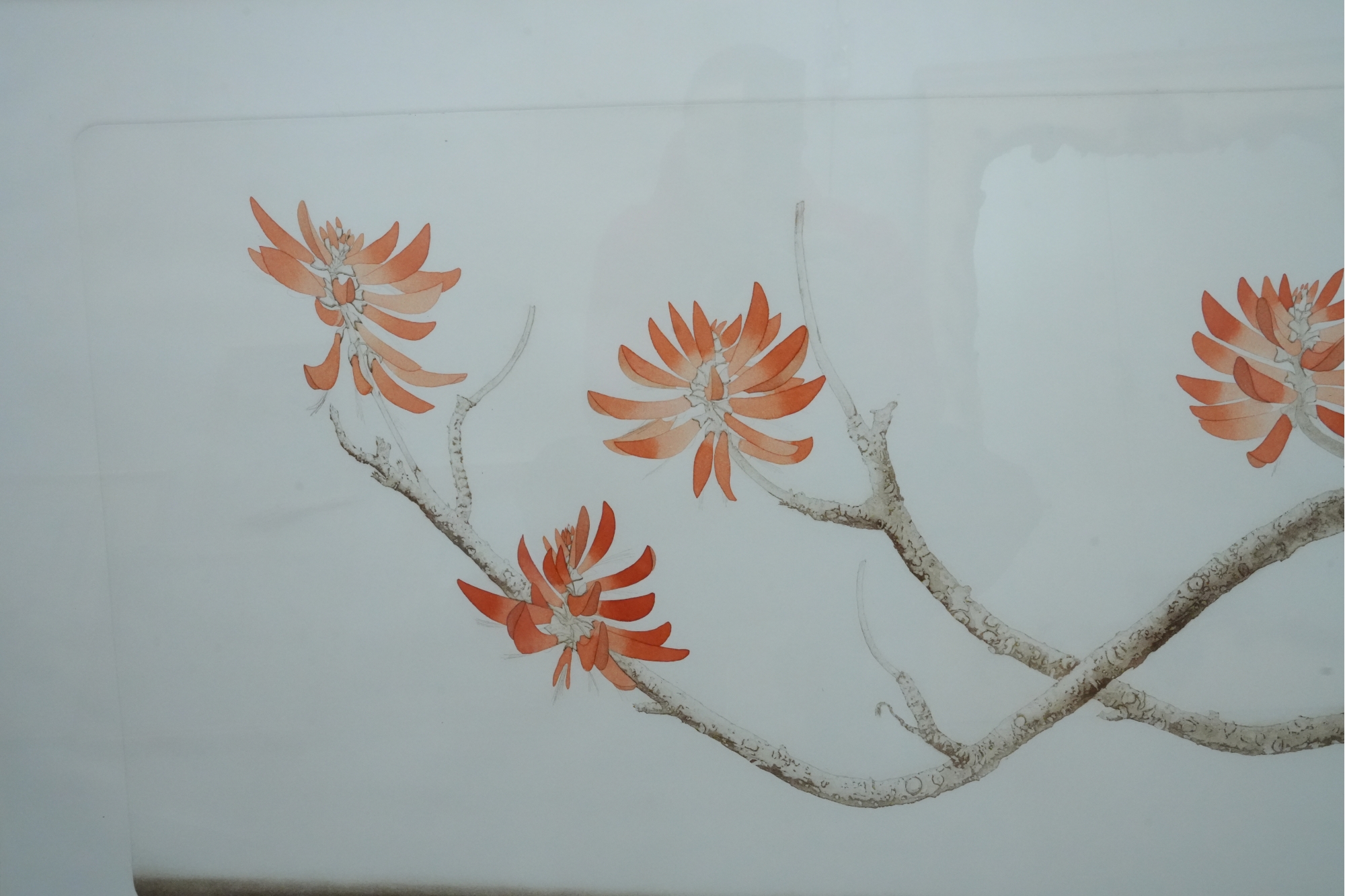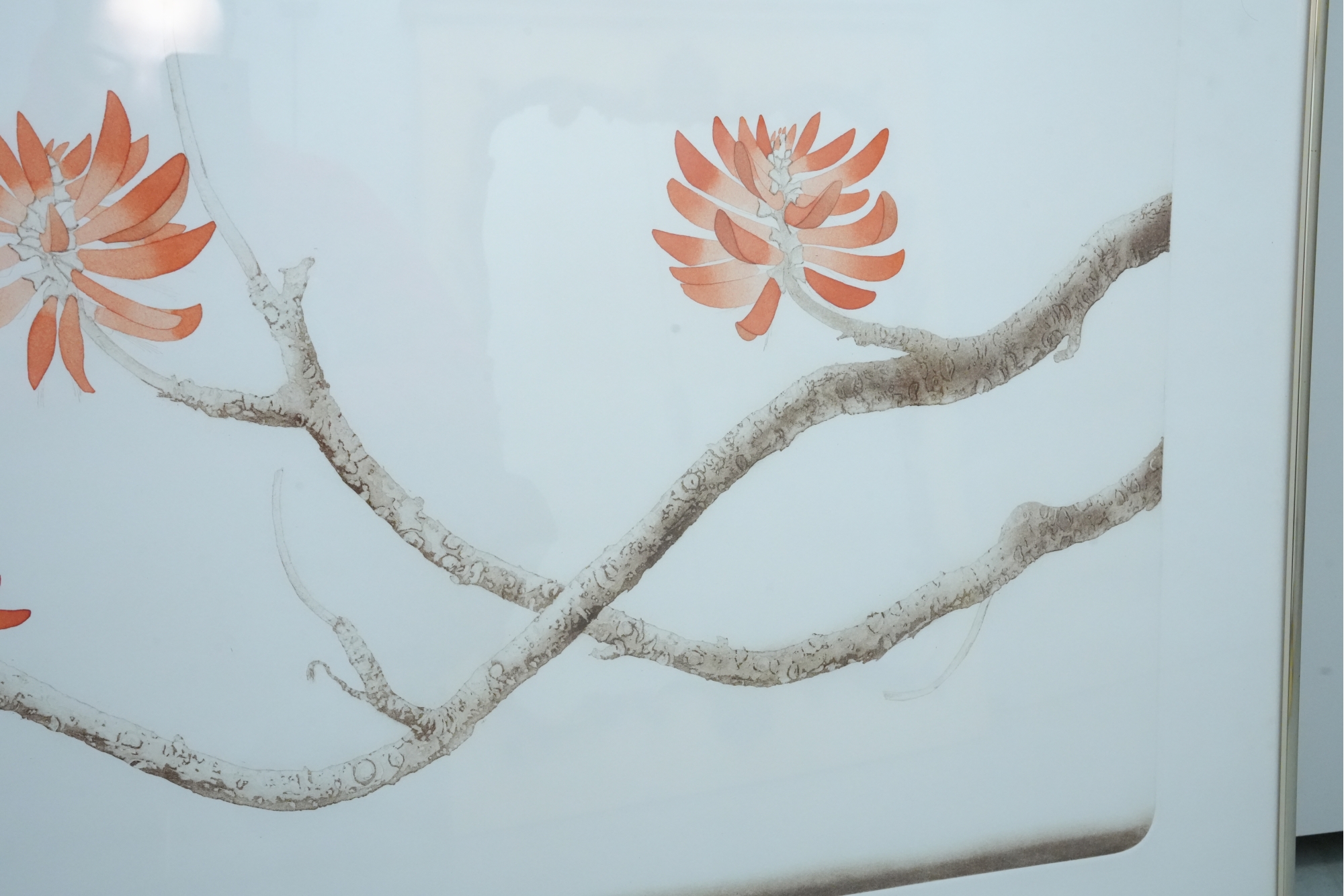 Artwork depicting textured tree limbs and four radial-petaled orange flowers.
