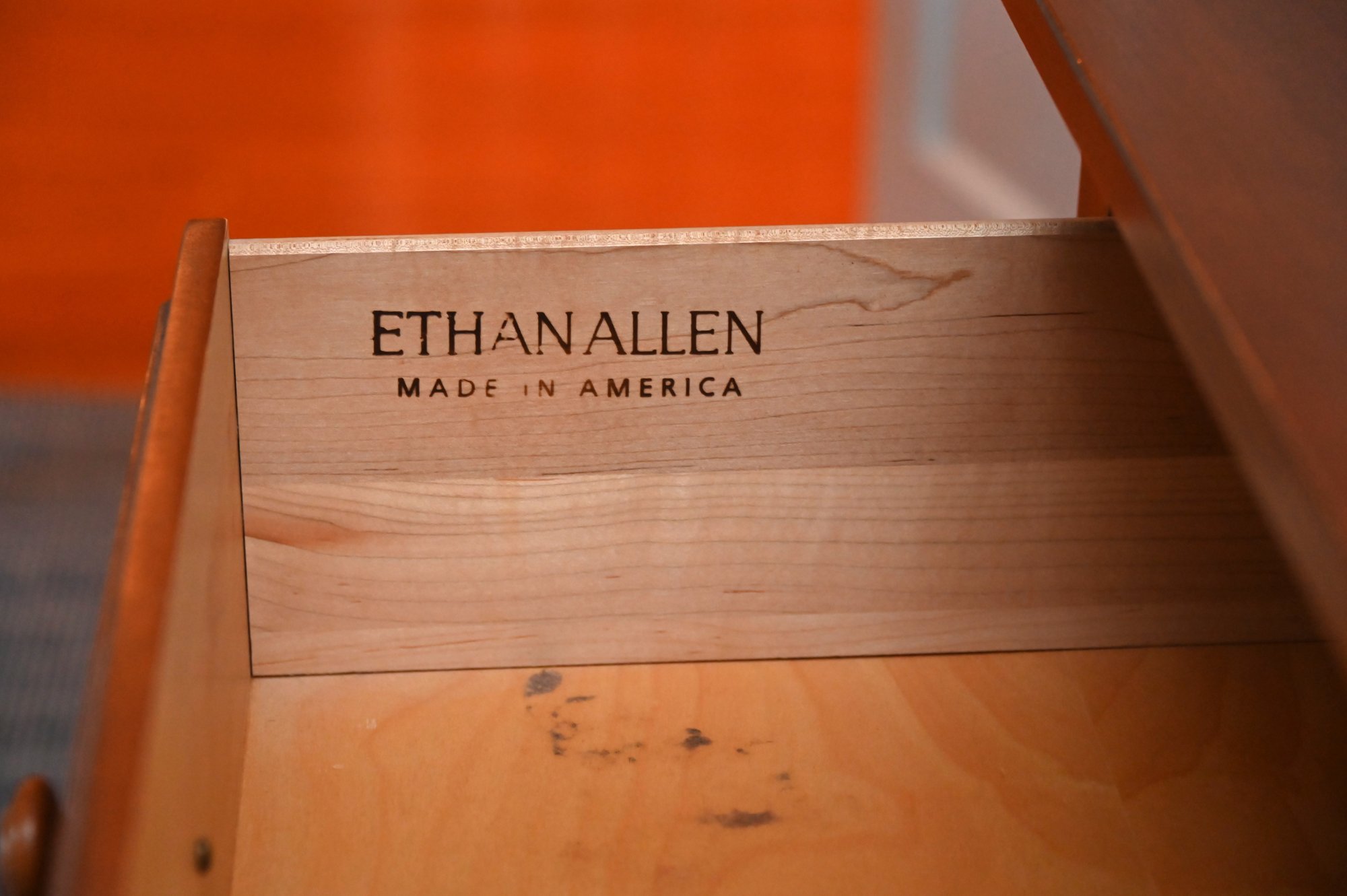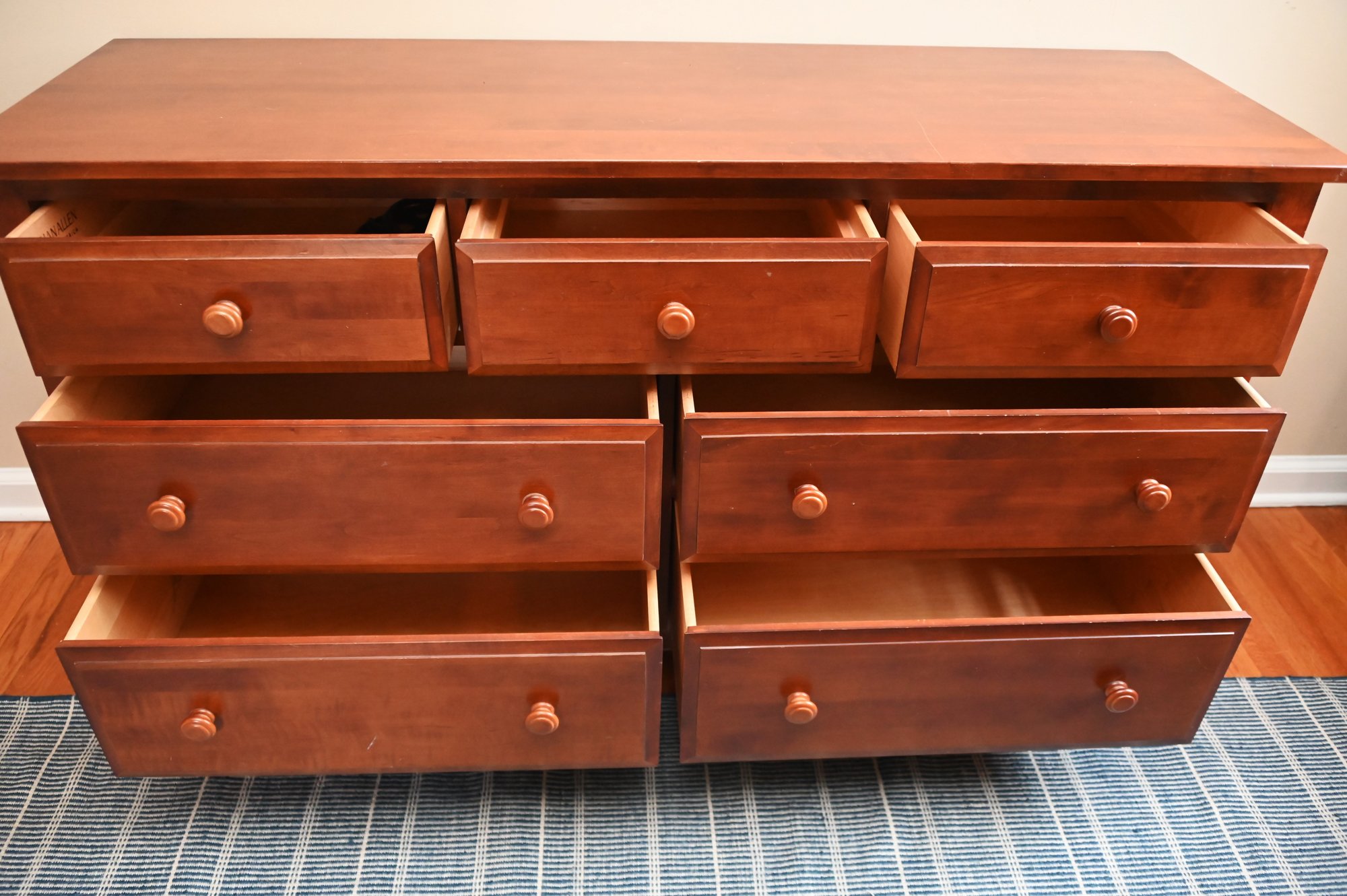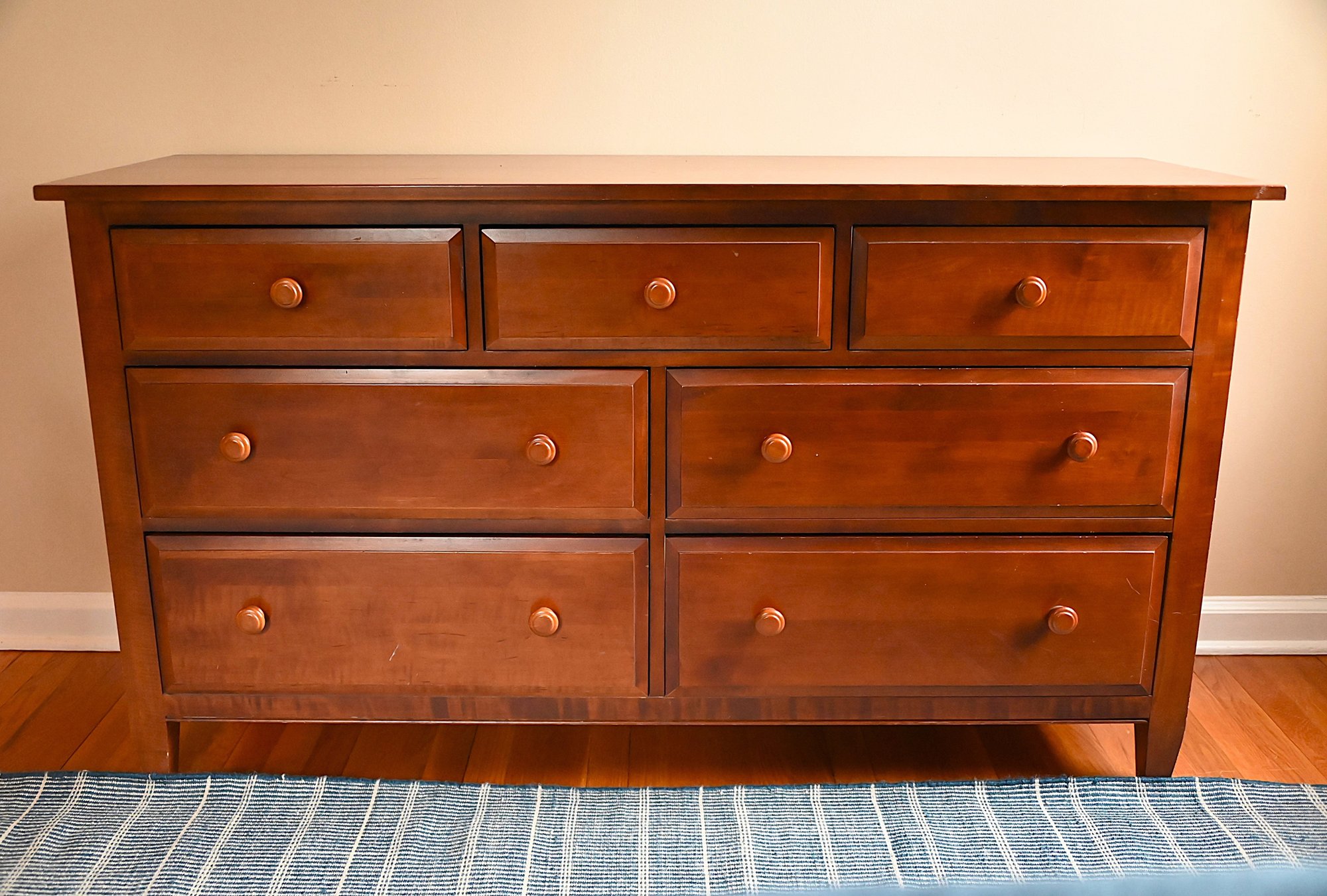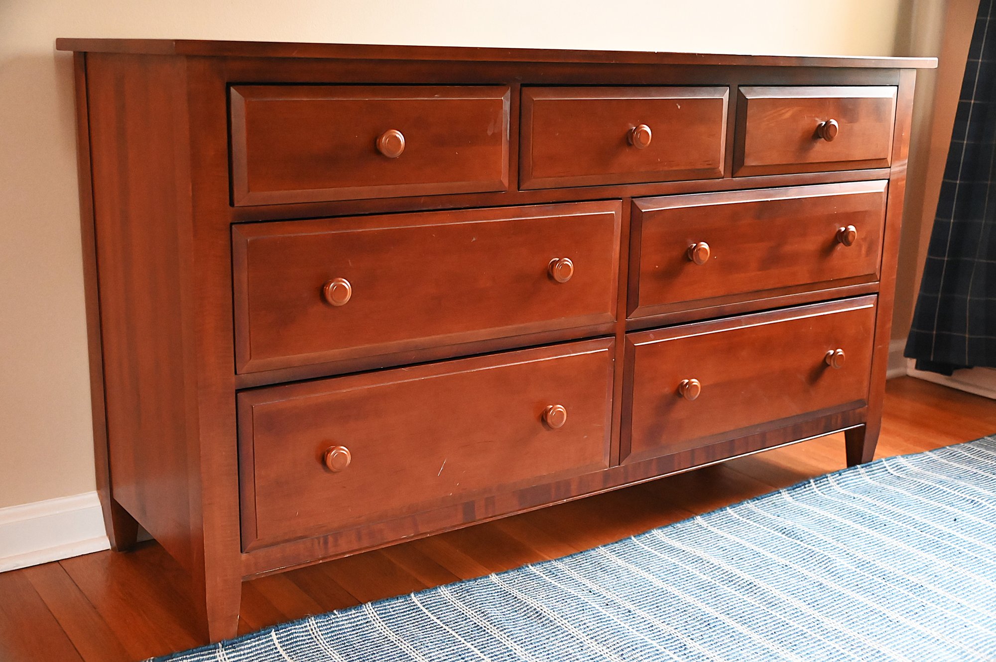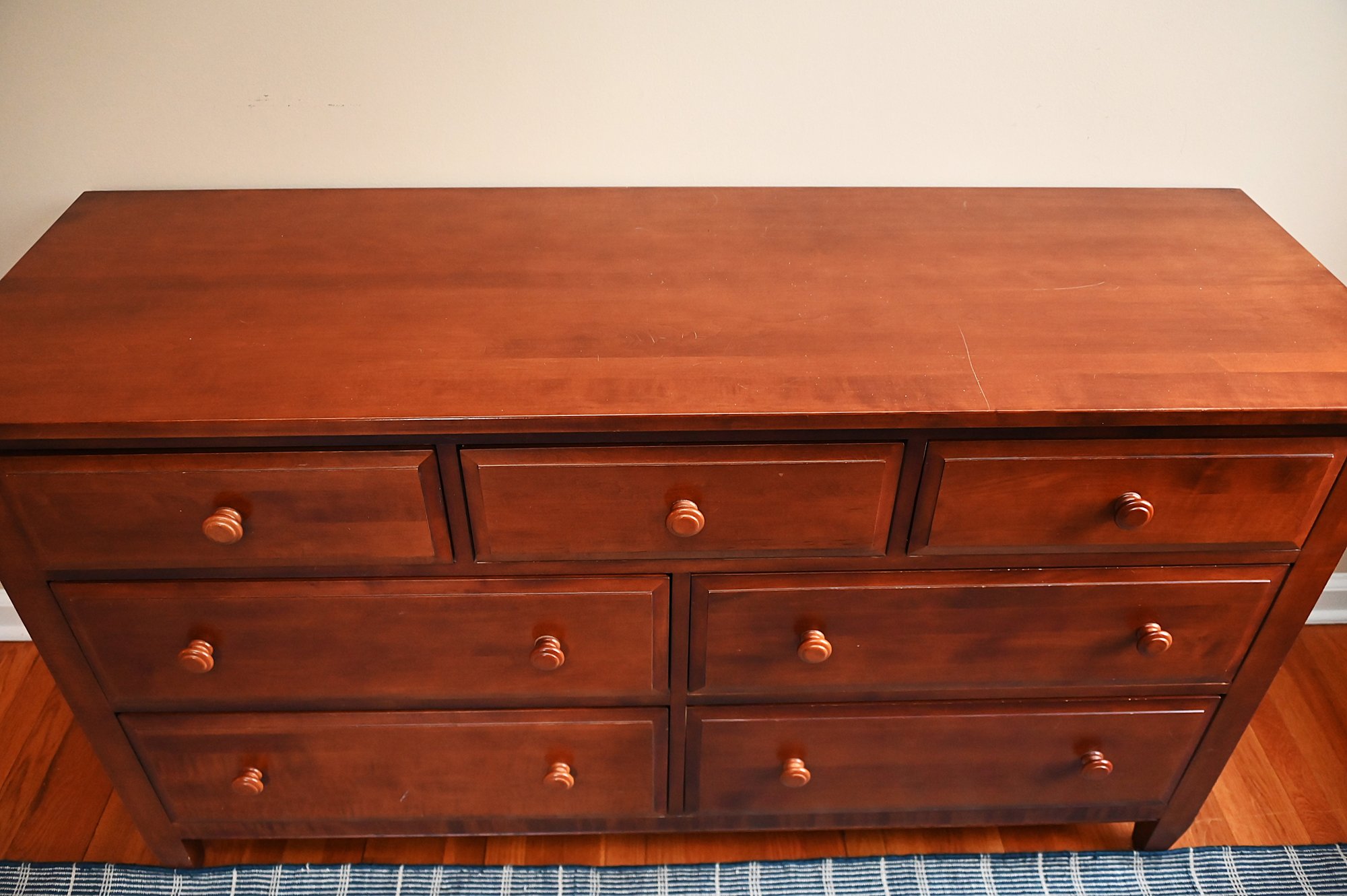 classic wooden dresser with a rich, warm brown finish. The dresser has a sturdy and timeless design, with clean lines and a smooth surface that highlights the natural grain of the wood.