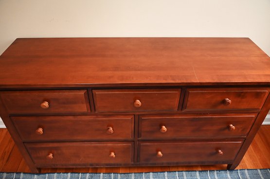 It consists of a total of seven drawers: three smaller ones across the top and four larger ones below, offering ample storage space. Each drawer is adorned with a round wooden knob, matching the finish of the dresser for a cohesive look. The drawer fronts have a subtle recessed panel design, adding a touch of elegance.