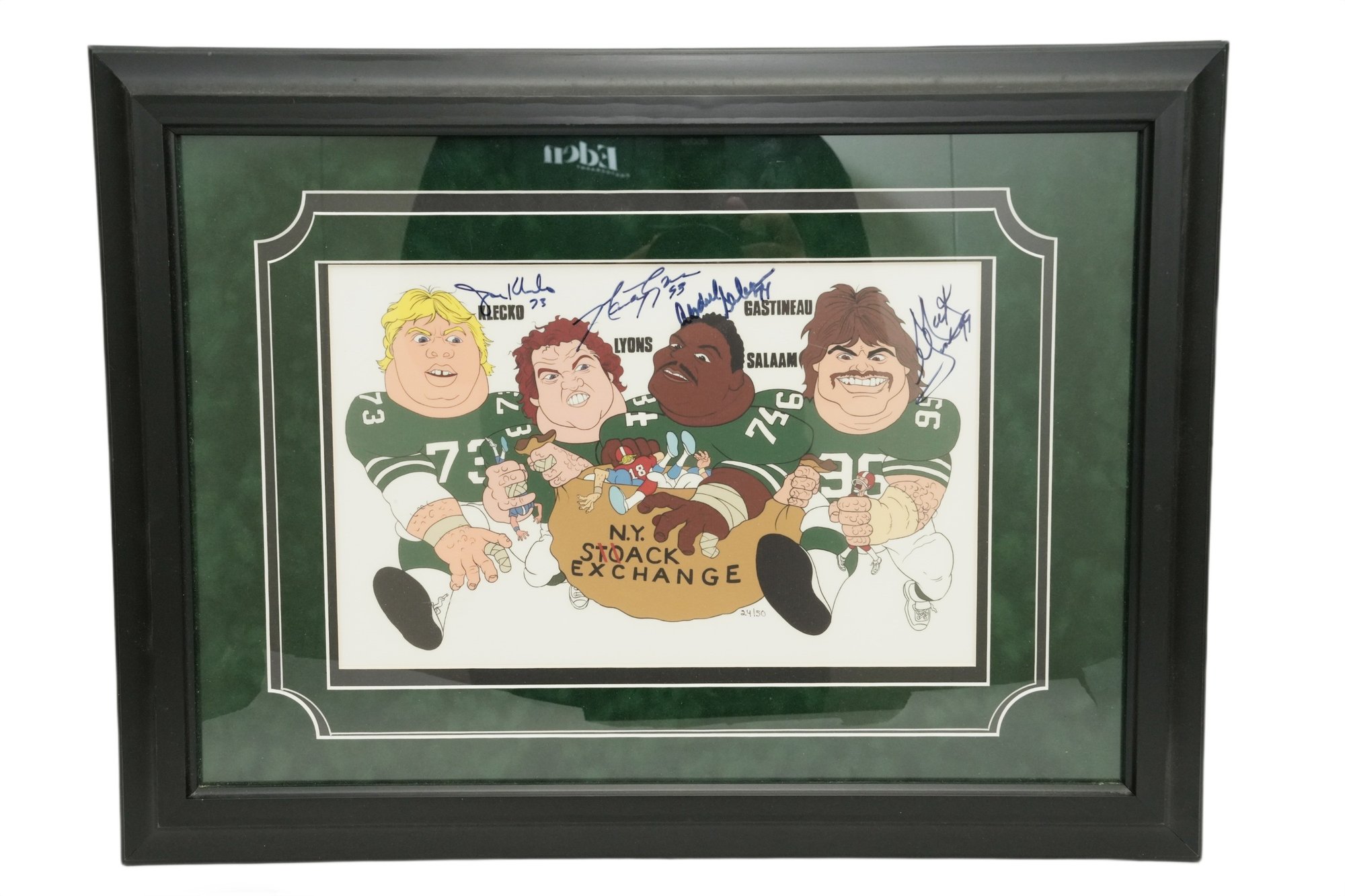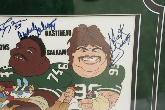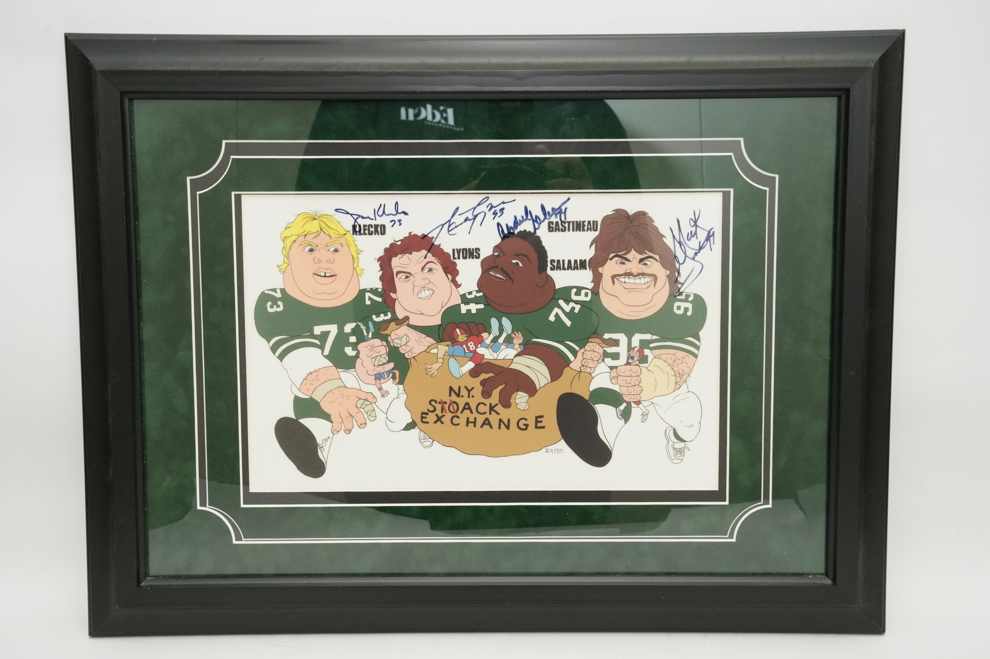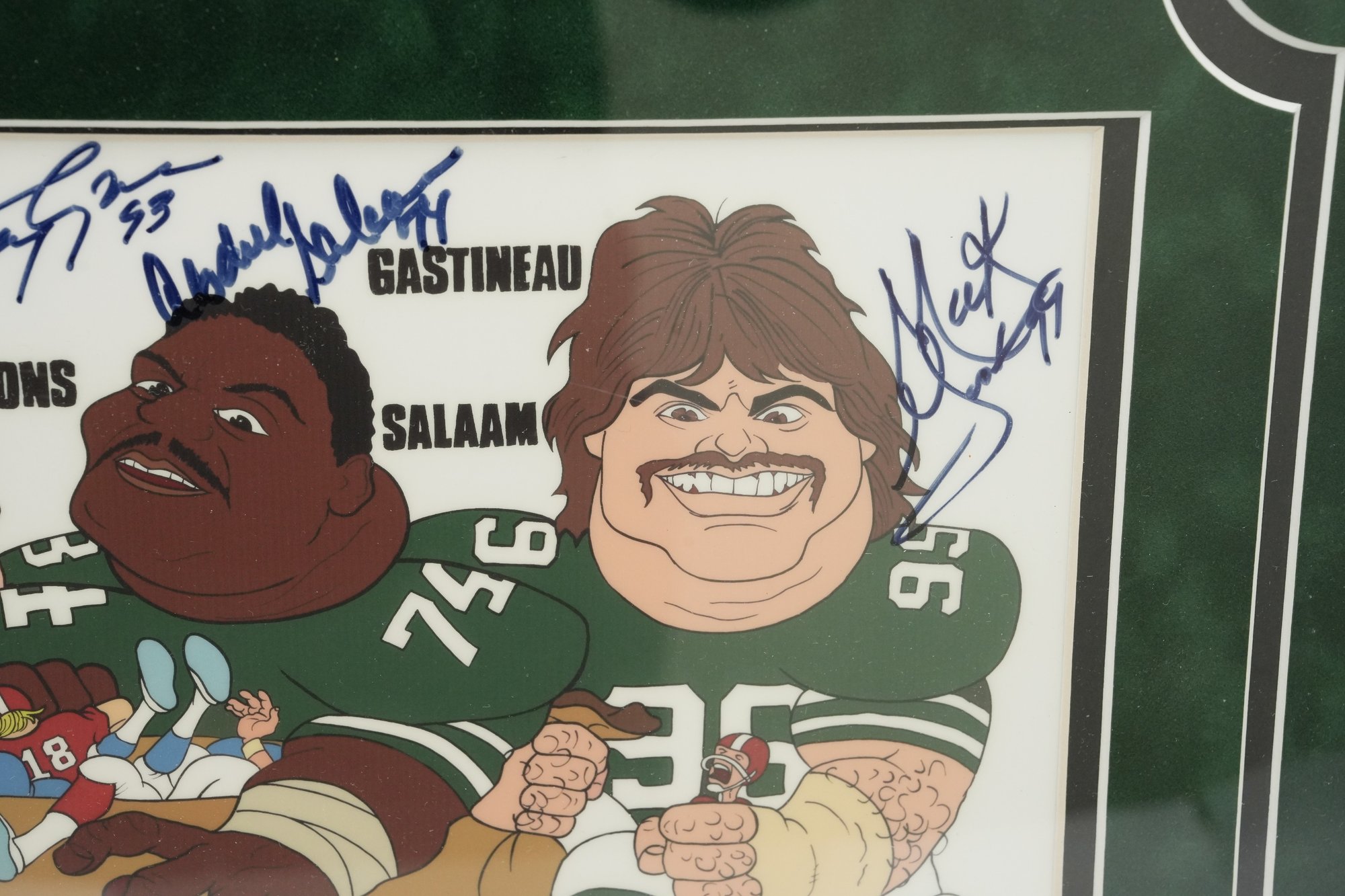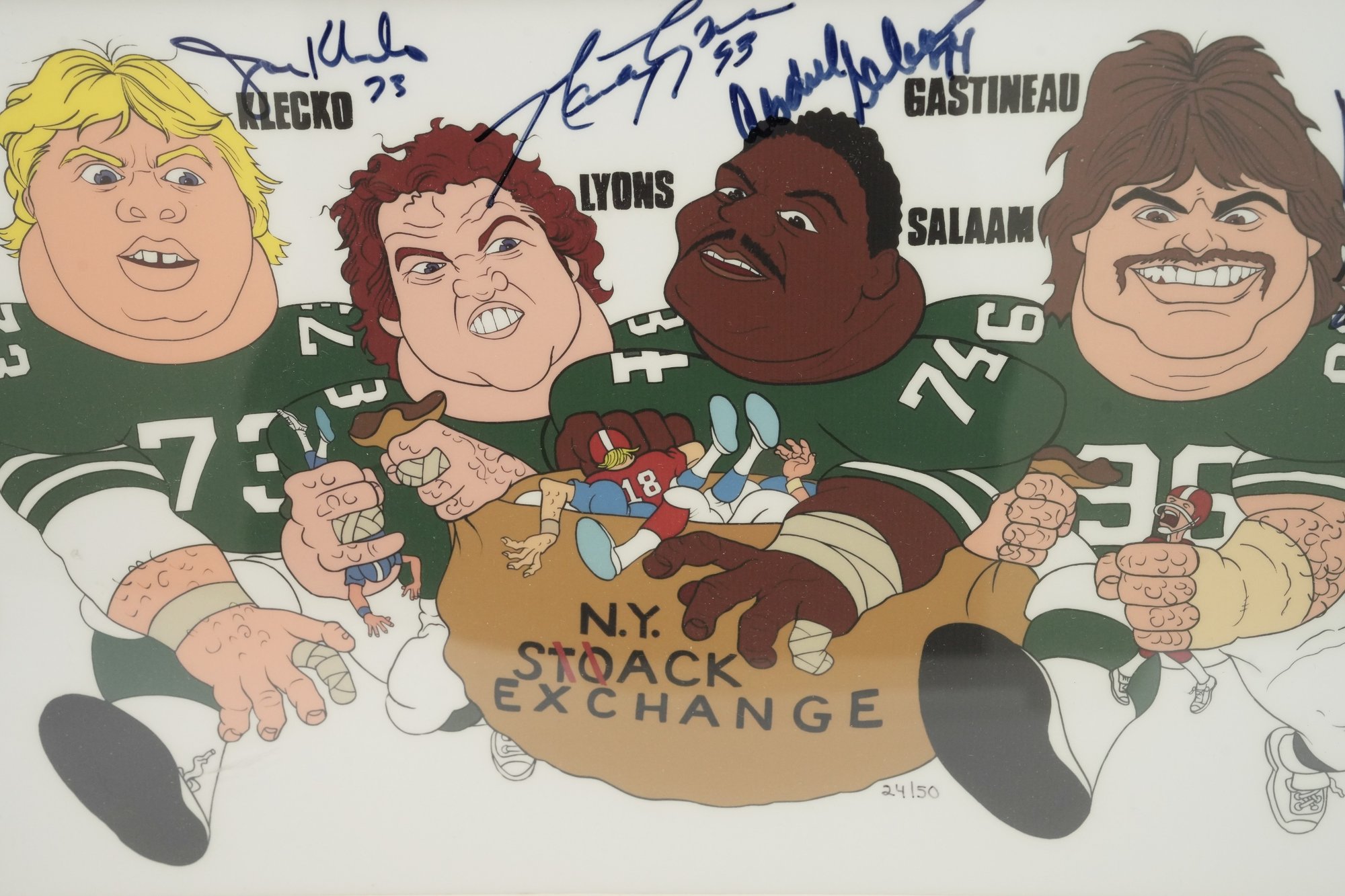 New York Jets (NFL football team) "The New York Sack Exchange" caricature art, autographed by defensive line back players, Mark Gastineau, Joe Klecko, Marty Lyons, and Abdul Salaam