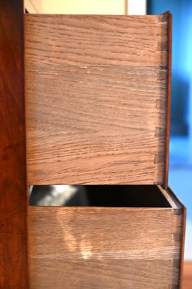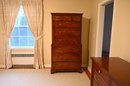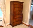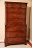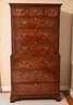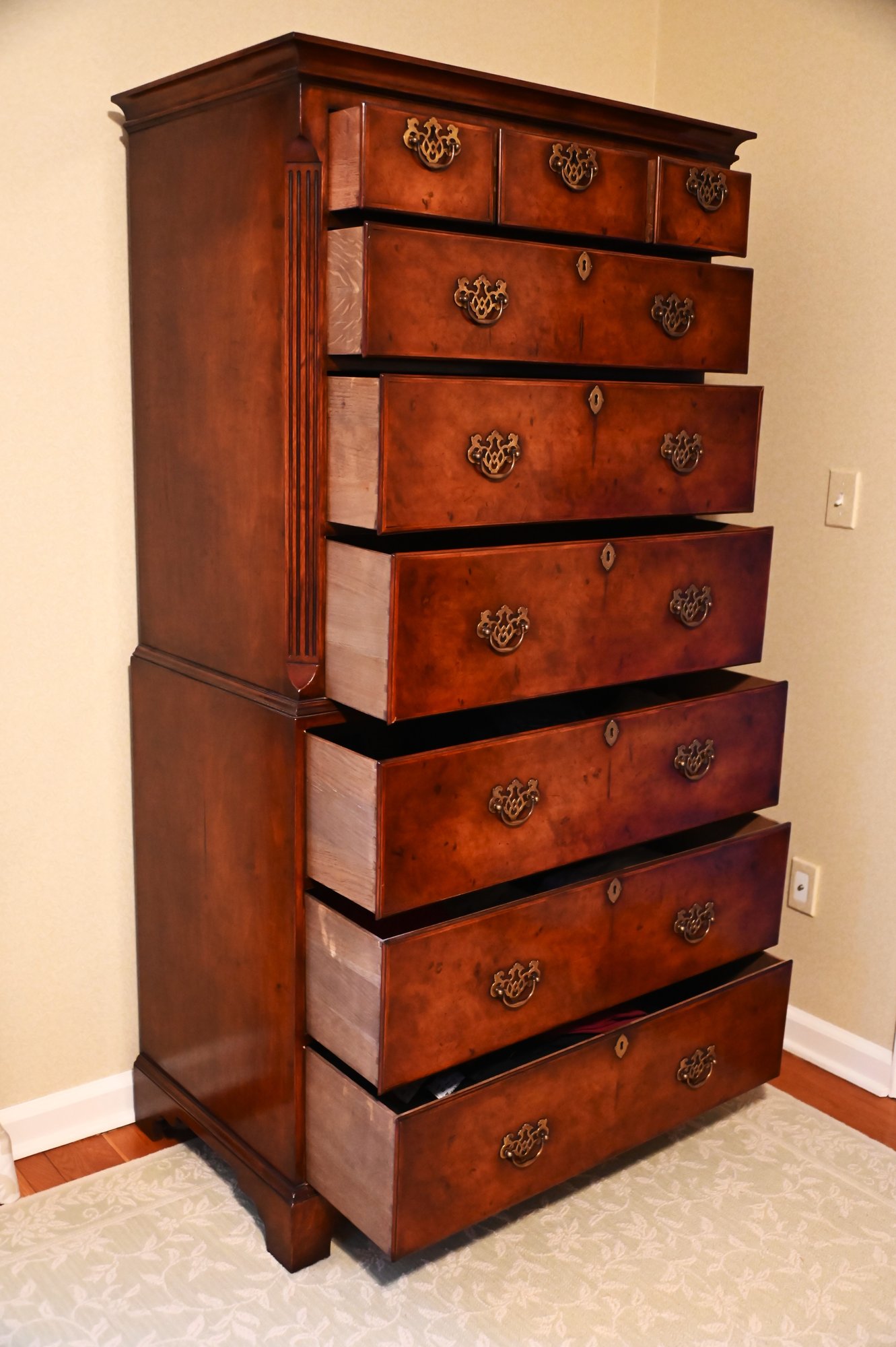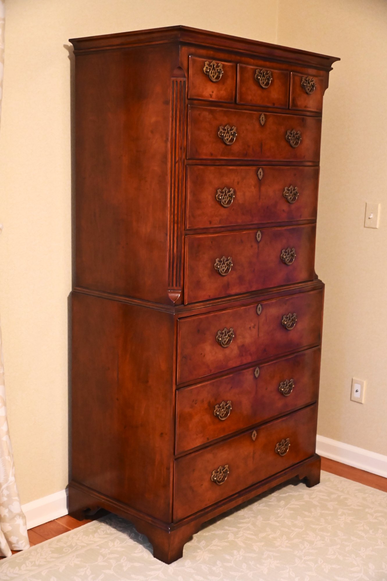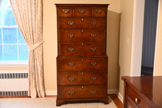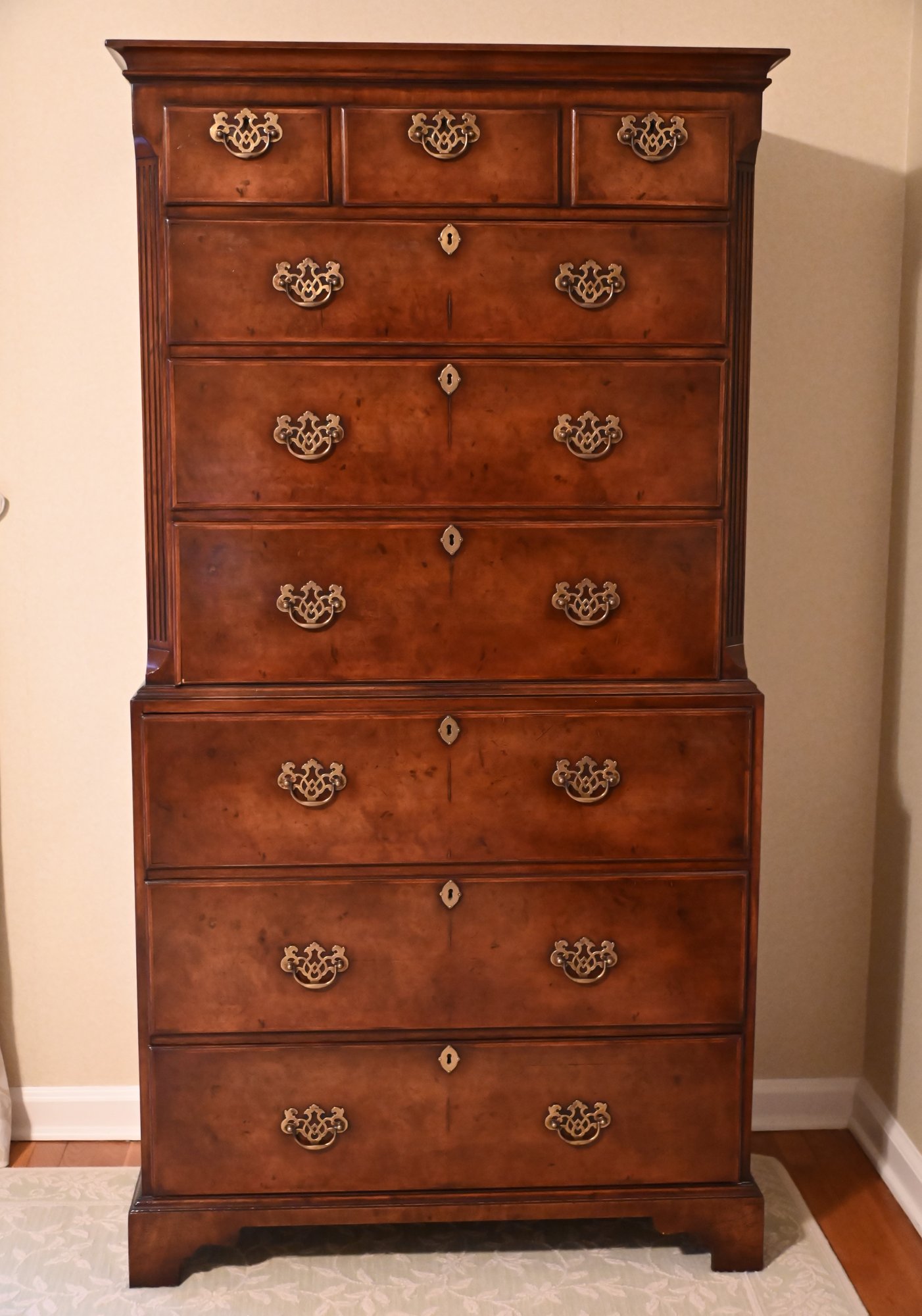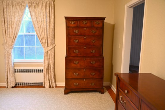 This exquisite highboy chest exudes timeless elegance with its rich, warm-toned wood and classic craftsmanship. Featuring a two-part construction, the upper section offers three smaller drawers above three spacious drawers, while the lower section houses an additional three generously sized drawers. Each drawer is adorned with ornate brass handles and keyholes, enhancing its sophisticated aesthetic. The piece is framed by subtly fluted corner columns, adding depth and refinement to its design. Standing on bracket feet, this stately chest blends traditional charm with functional storage