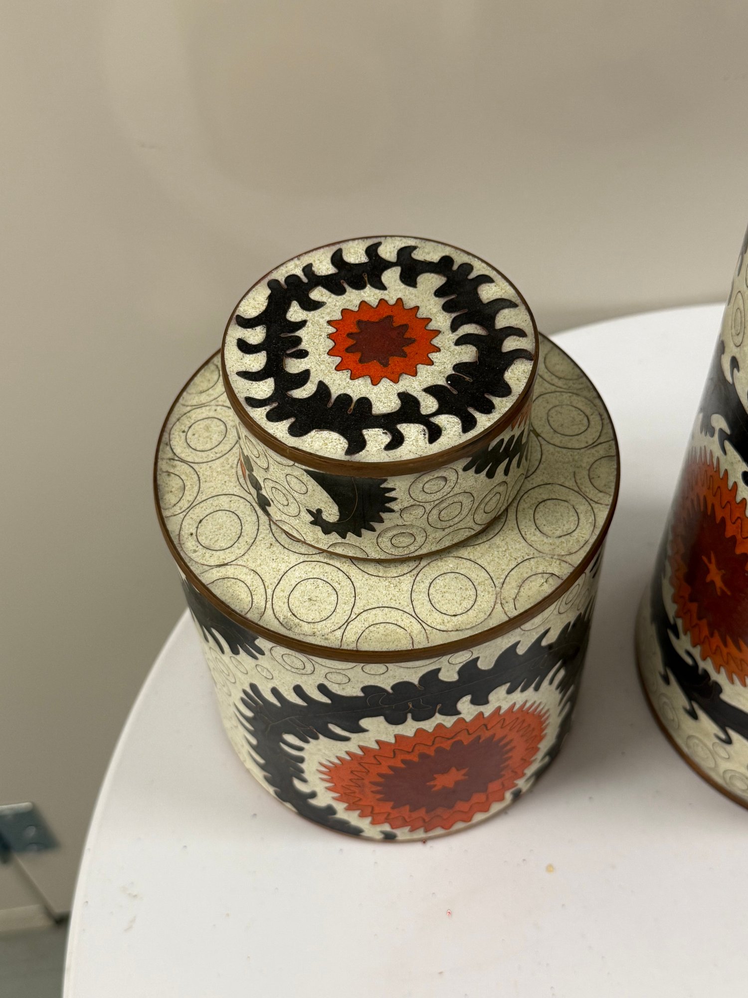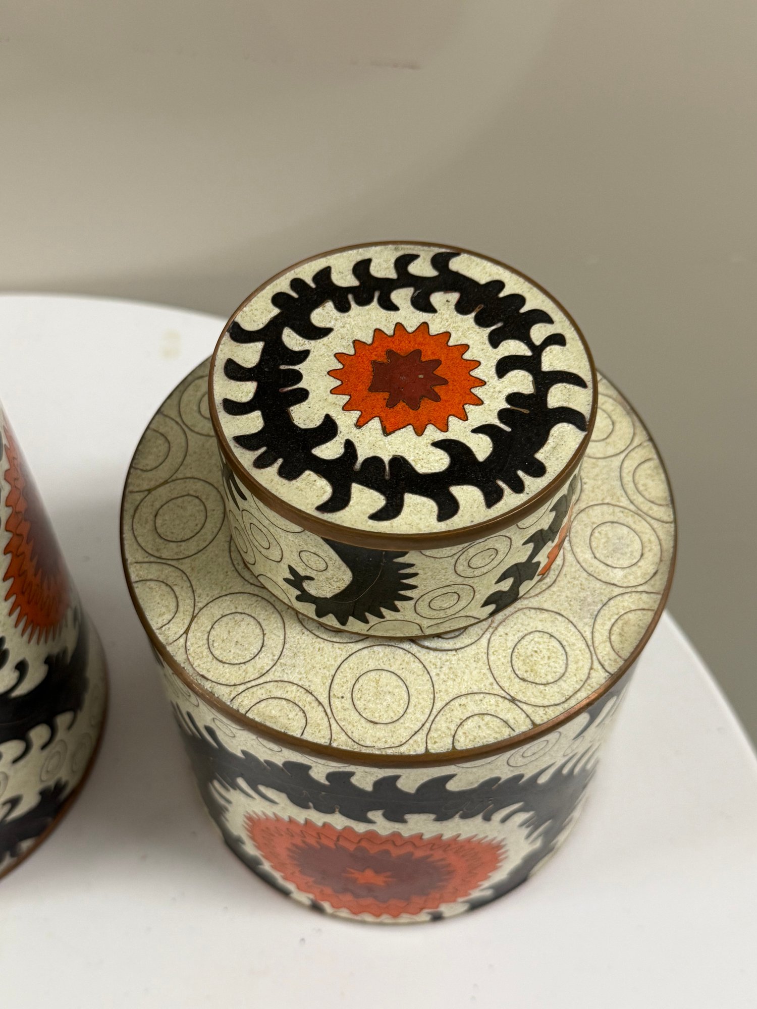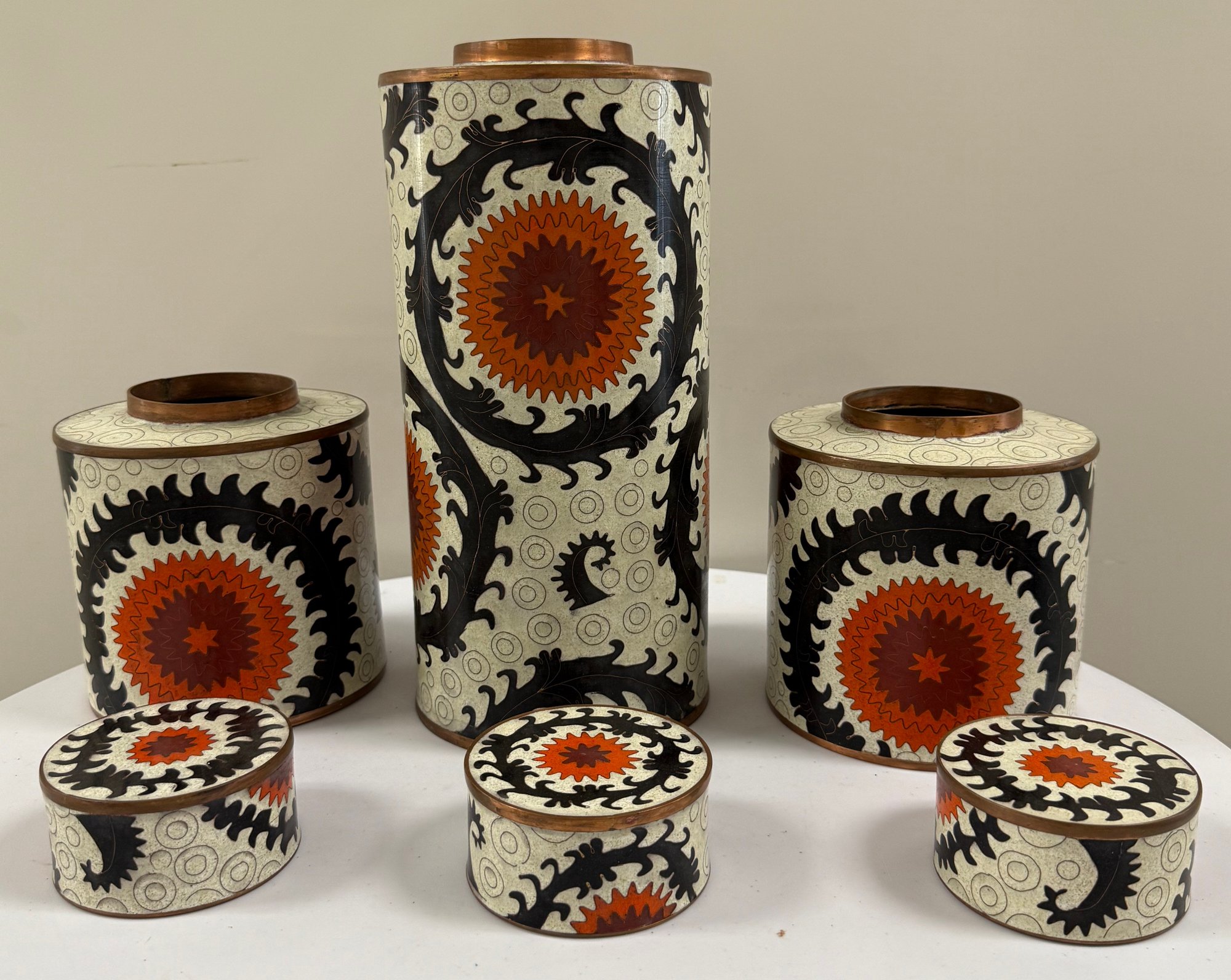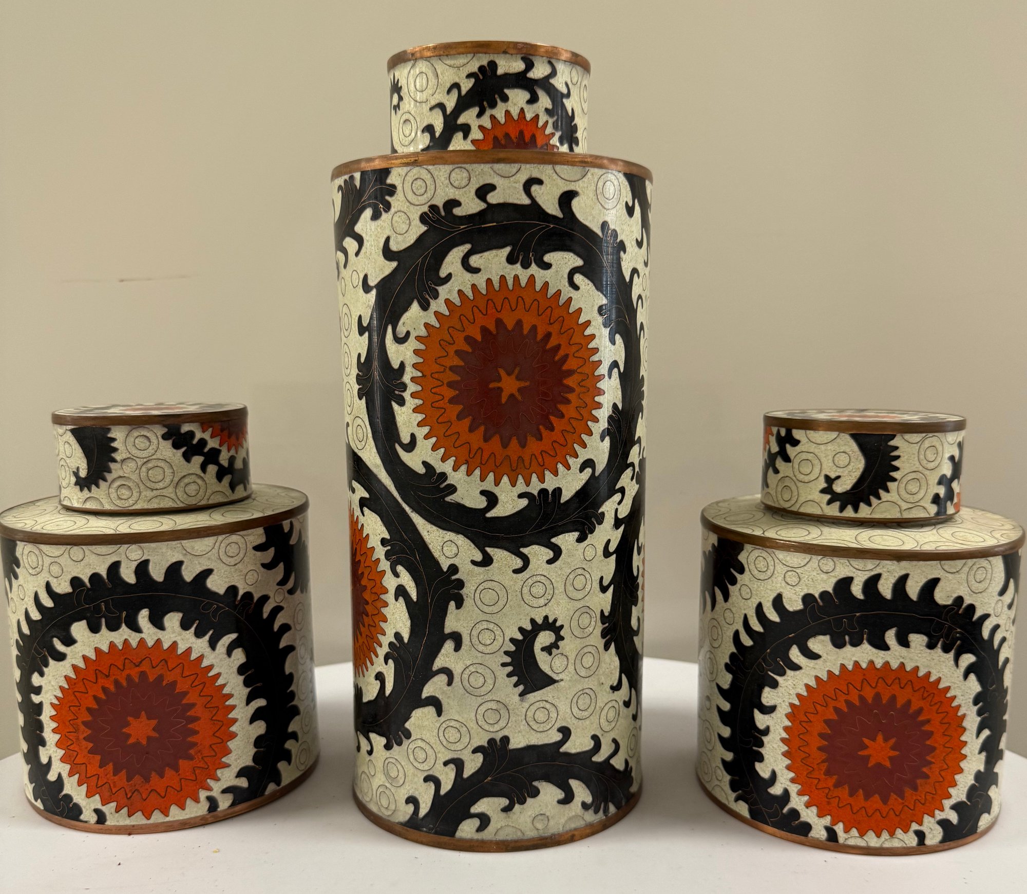 Set of three (3) vintage Fabienne Jouvin designer cloisonné covered canisters, made from copper with applied enamel artwork, in the "Ouzbeck" pattern. Marked "Fabienne Jouvin Paris" on underside.