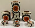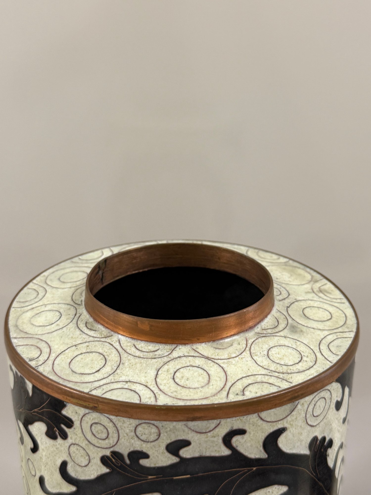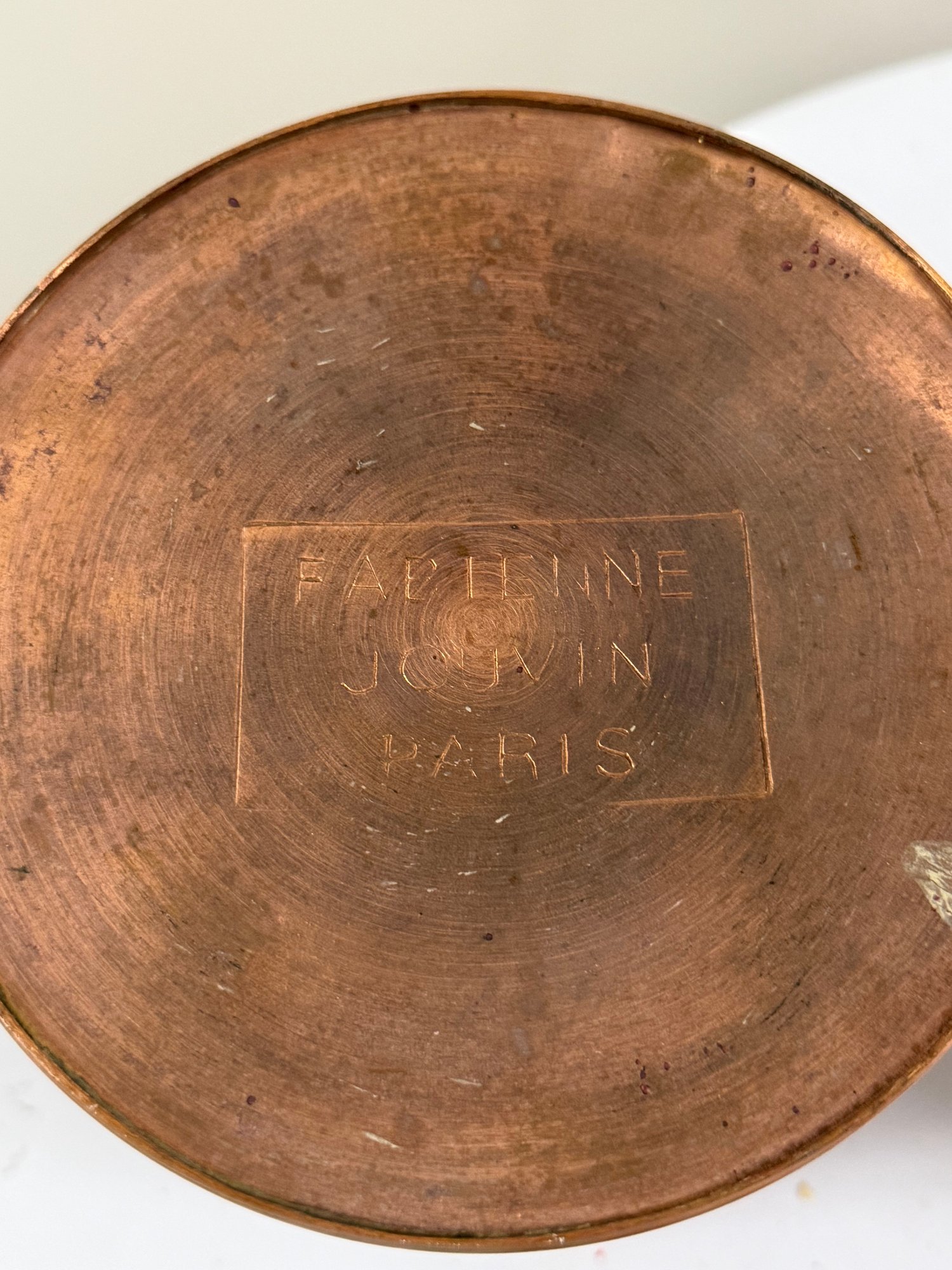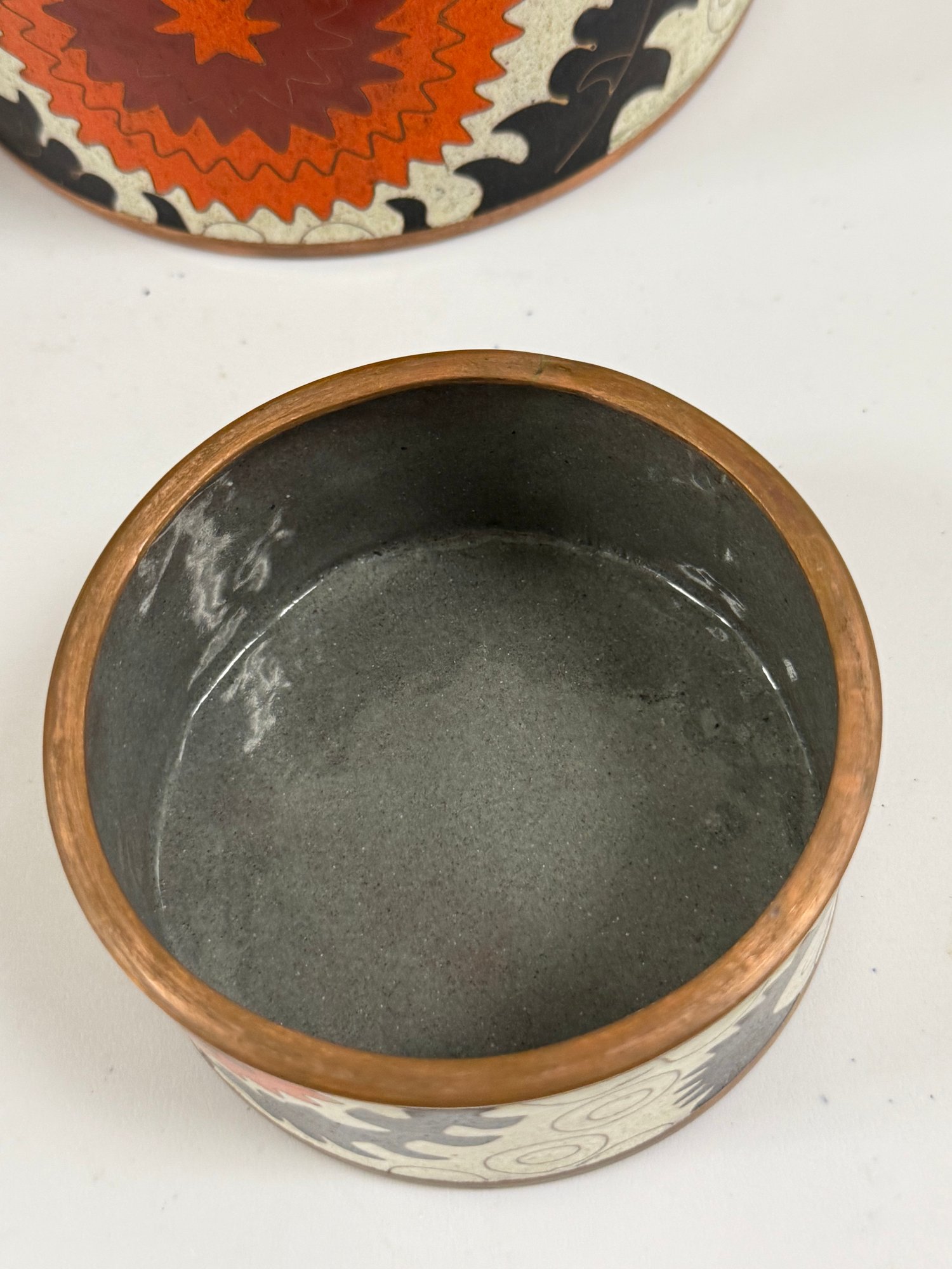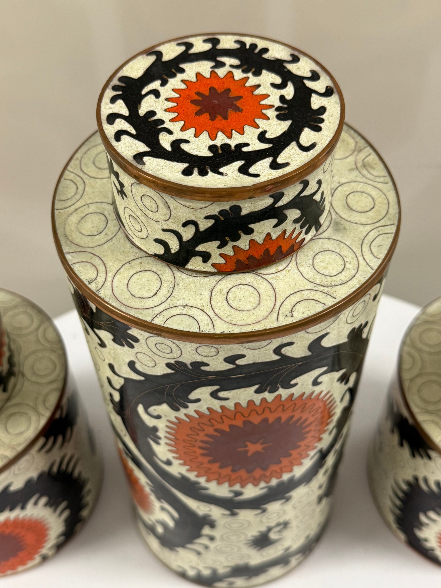 Set of three (3) vintage Fabienne Jouvin designer cloisonné covered canisters, made from copper with applied enamel artwork, in the "Ouzbeck" pattern. Marked "Fabienne Jouvin Paris" on underside.