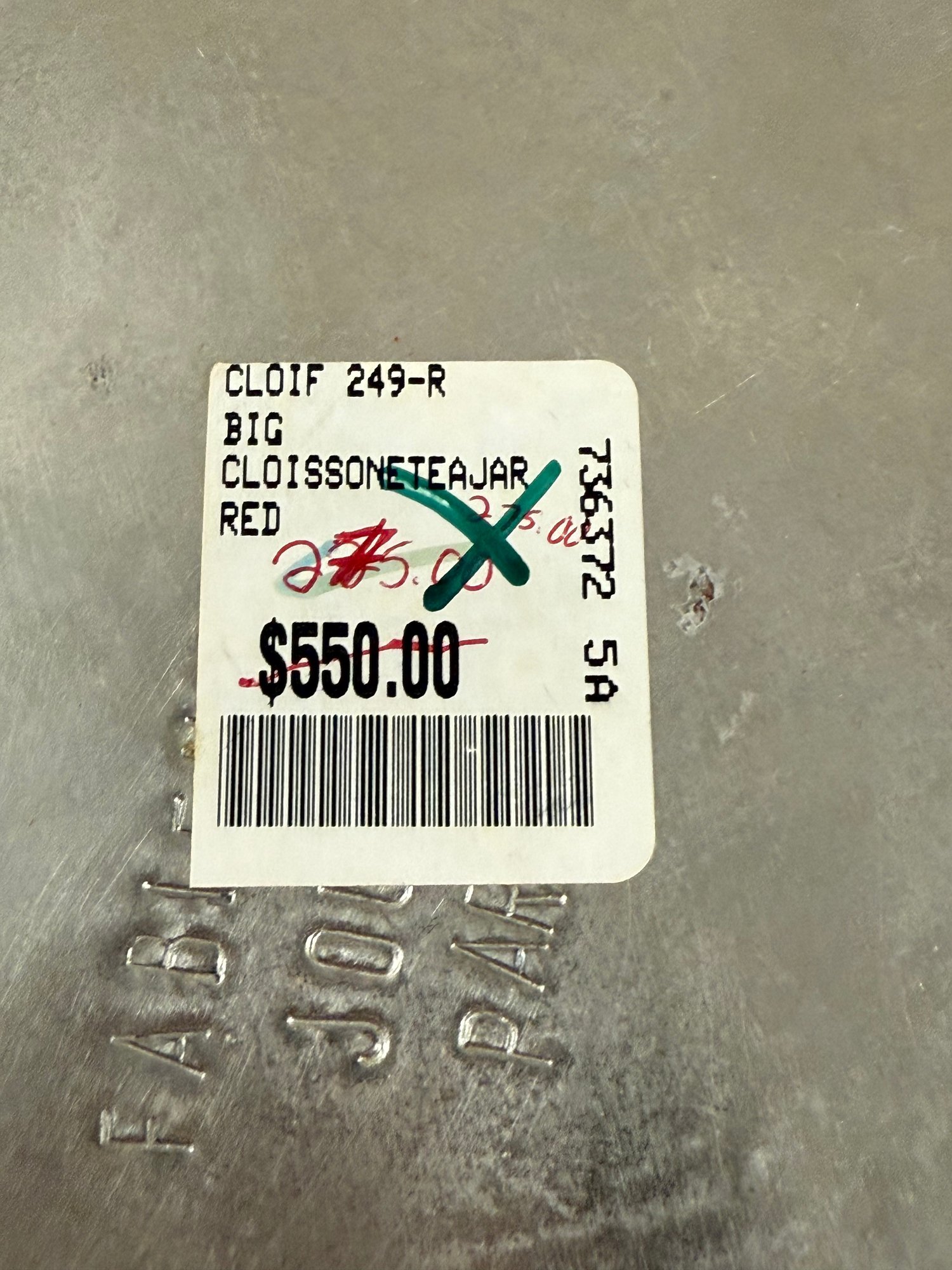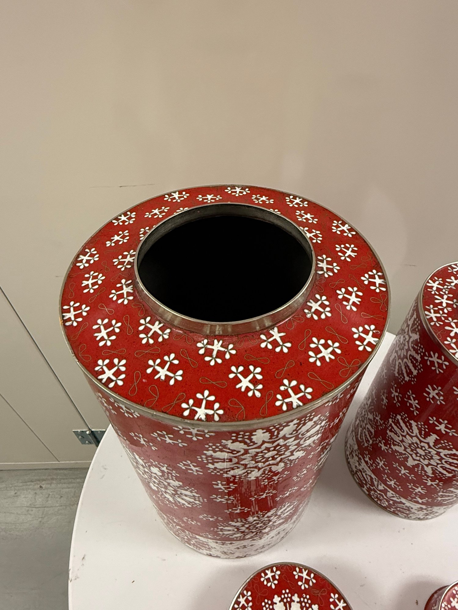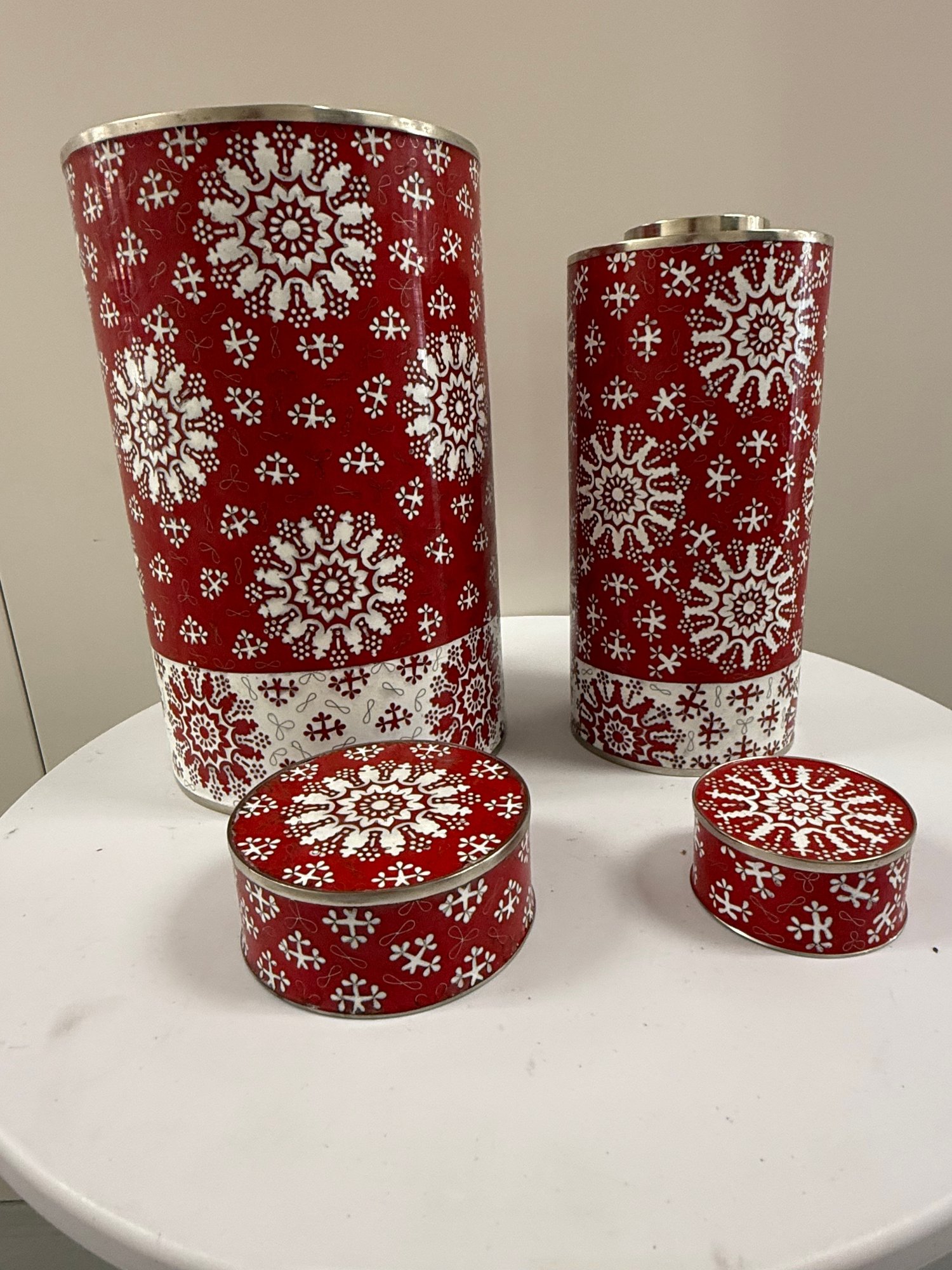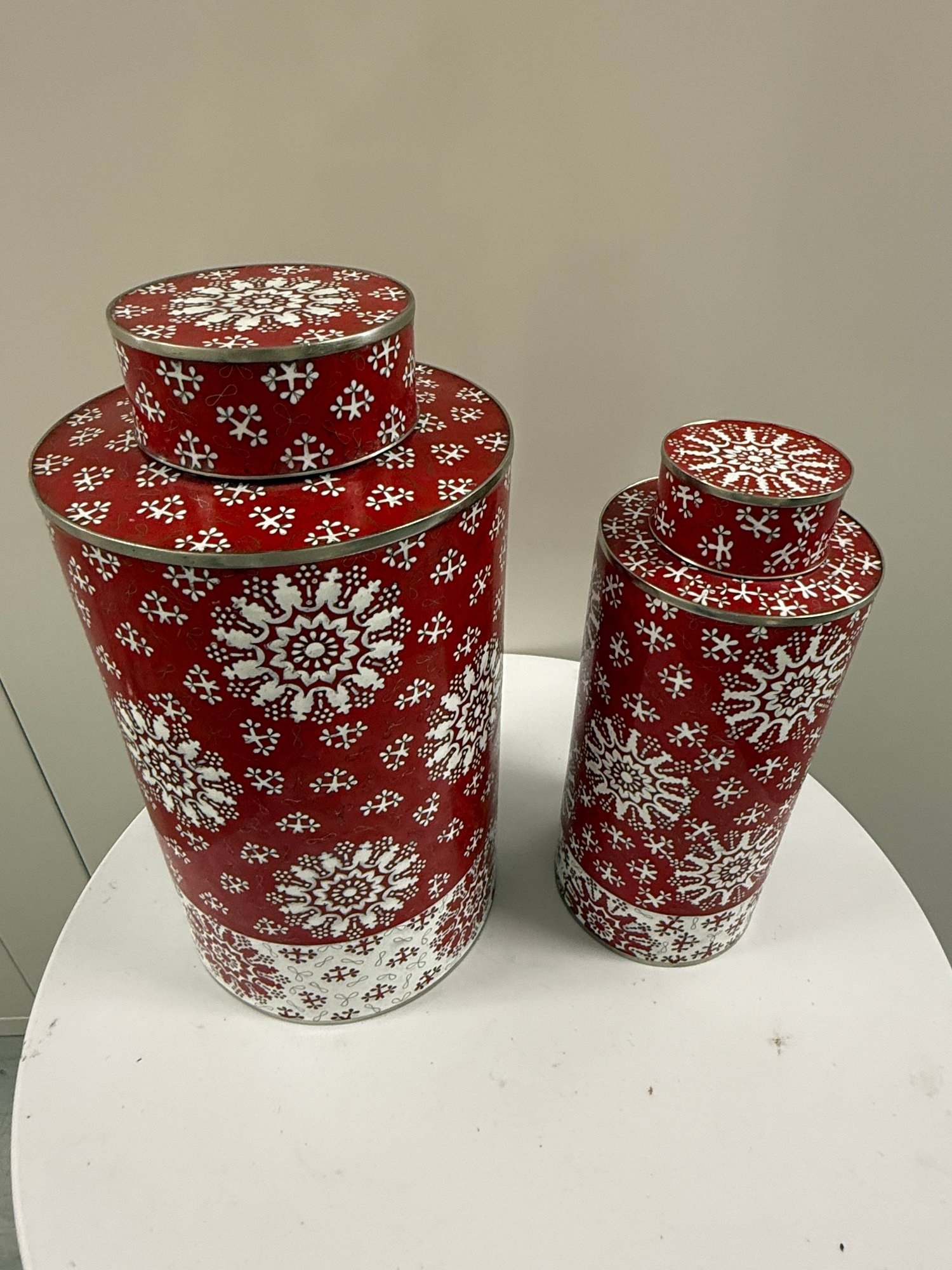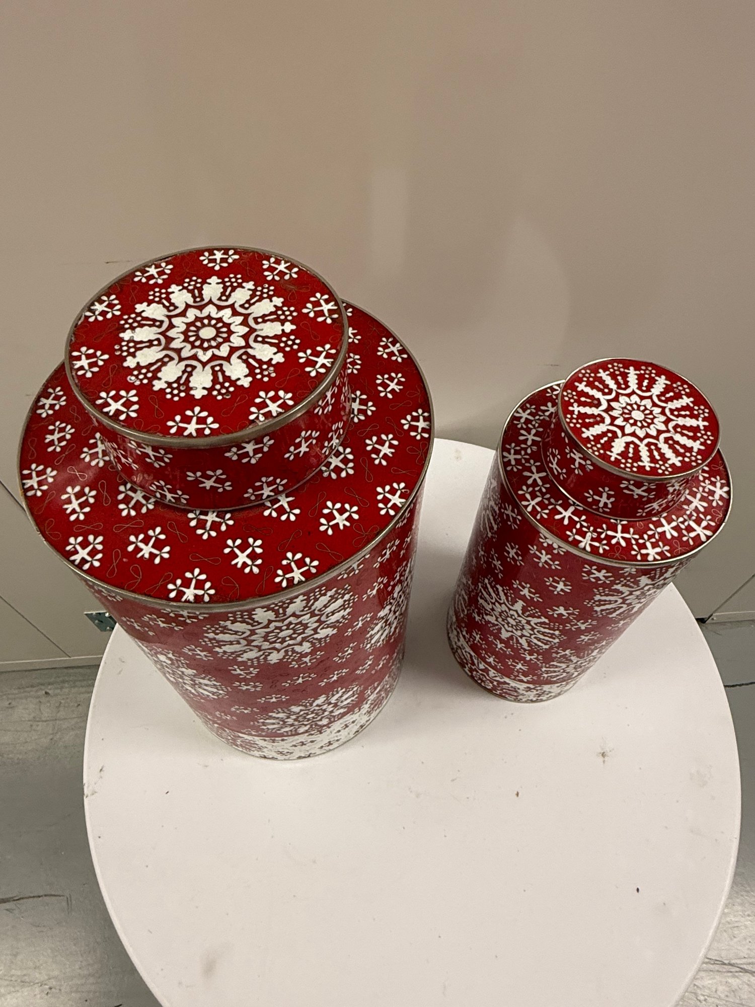 Set of two (2) vintage Fabienne Jouvin designer cloisonné covered canisters, made from copper with applied enamel artwork, with snow flake-like patterns over a red background. Marked "Fabienne Jouvin Paris" on underside.