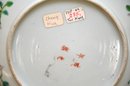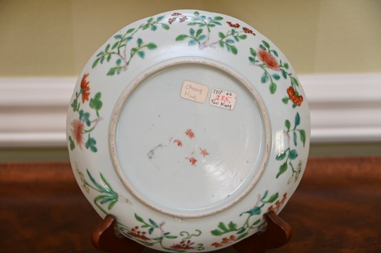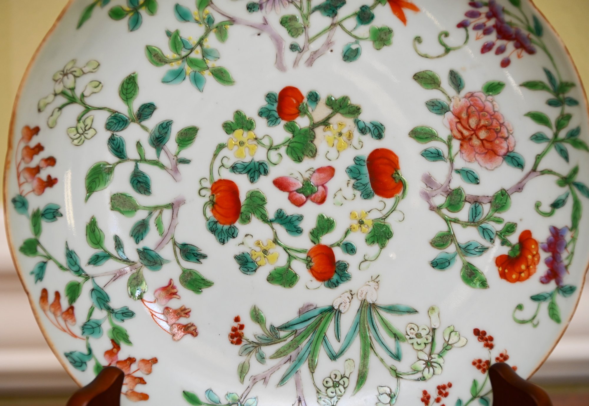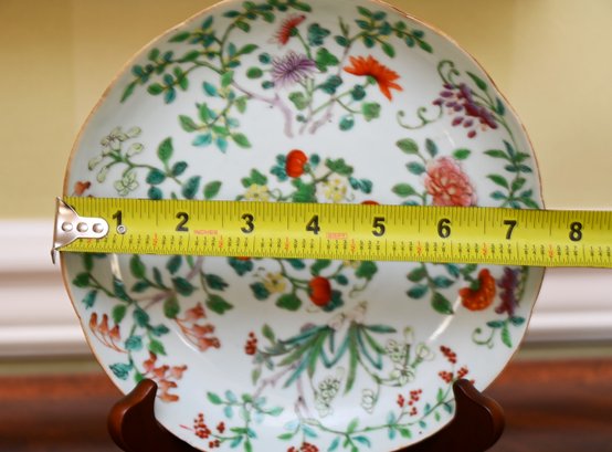 The rim of the plate has a delicate, slightly scalloped edge with a fine painted outline, enhancing its refined aesthetic. The painting is finely executed, with precise brushwork and a harmonious color palette, indicating it may belong to a Qing Dynasty Famille Verte or Famille Rose style. The plate is displayed on a wooden stand, which further emphasizes its collectible and decorative nature.