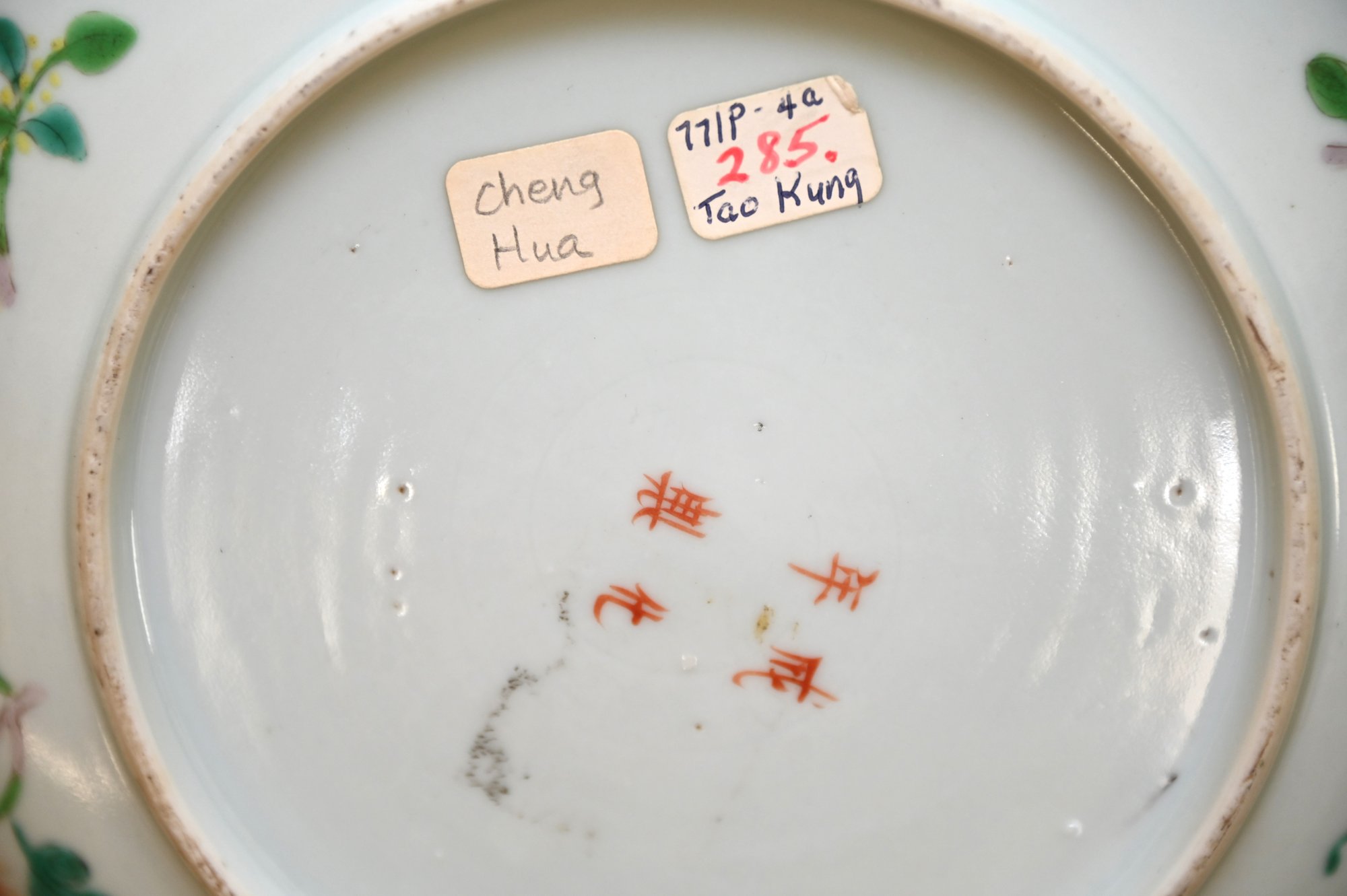 The plate exhibits minor imperfections and firing pinholes, which are typical in older porcelain production methods. The unglazed foot rim has some wear, further suggesting age and handling over time. If authentic, this could be an antique Chinese porcelain dish inspired by or from the Chenghua period, although many later pieces also bear reign marks as a tribute to earlier dynasties.