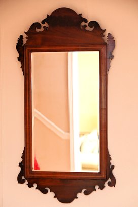 This is a Chippendale-style wall mirror, characterized by its ornate carved mahogany frame with decorative scrollwork along the top and sides.