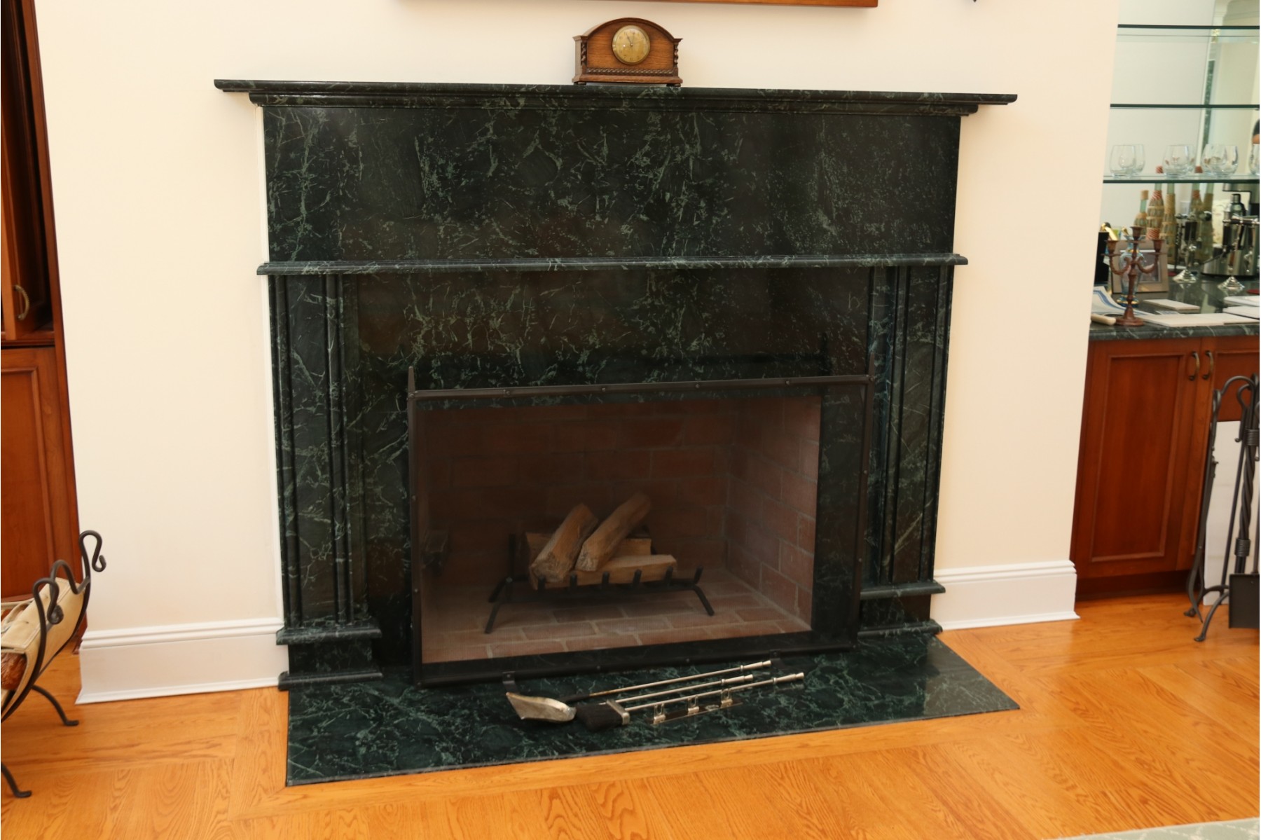 Black wrought iron screen measures 50 x 33 and chrome fireplace tools with wall holder
