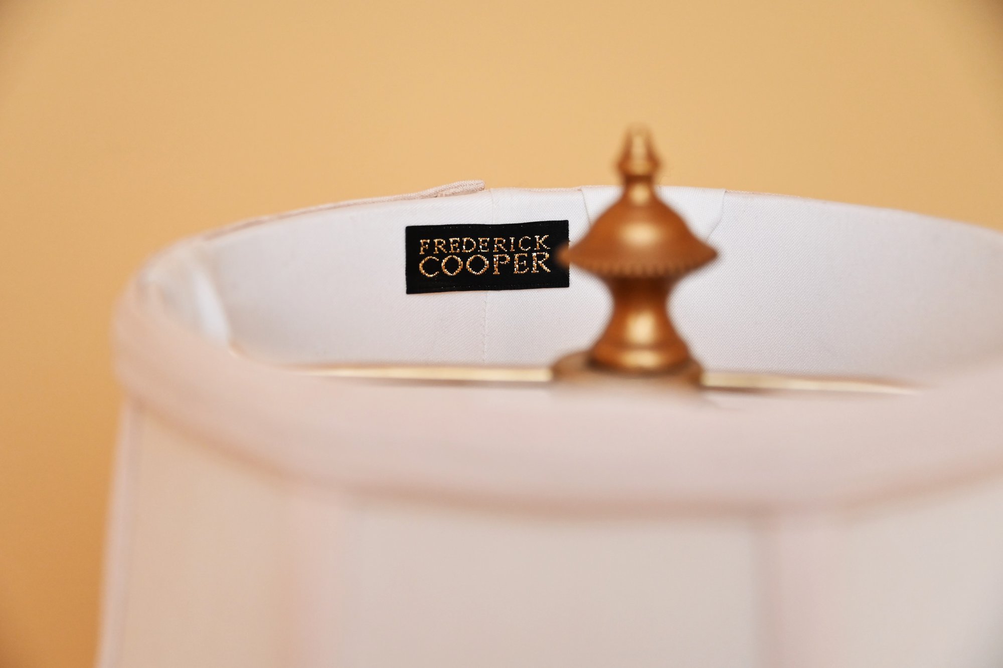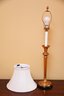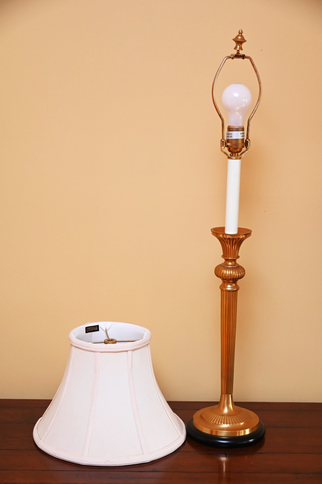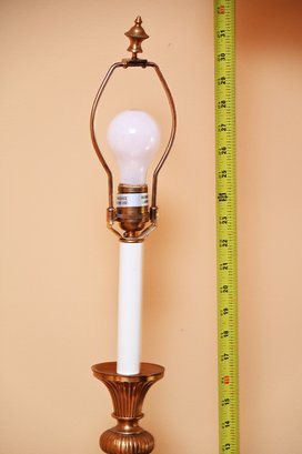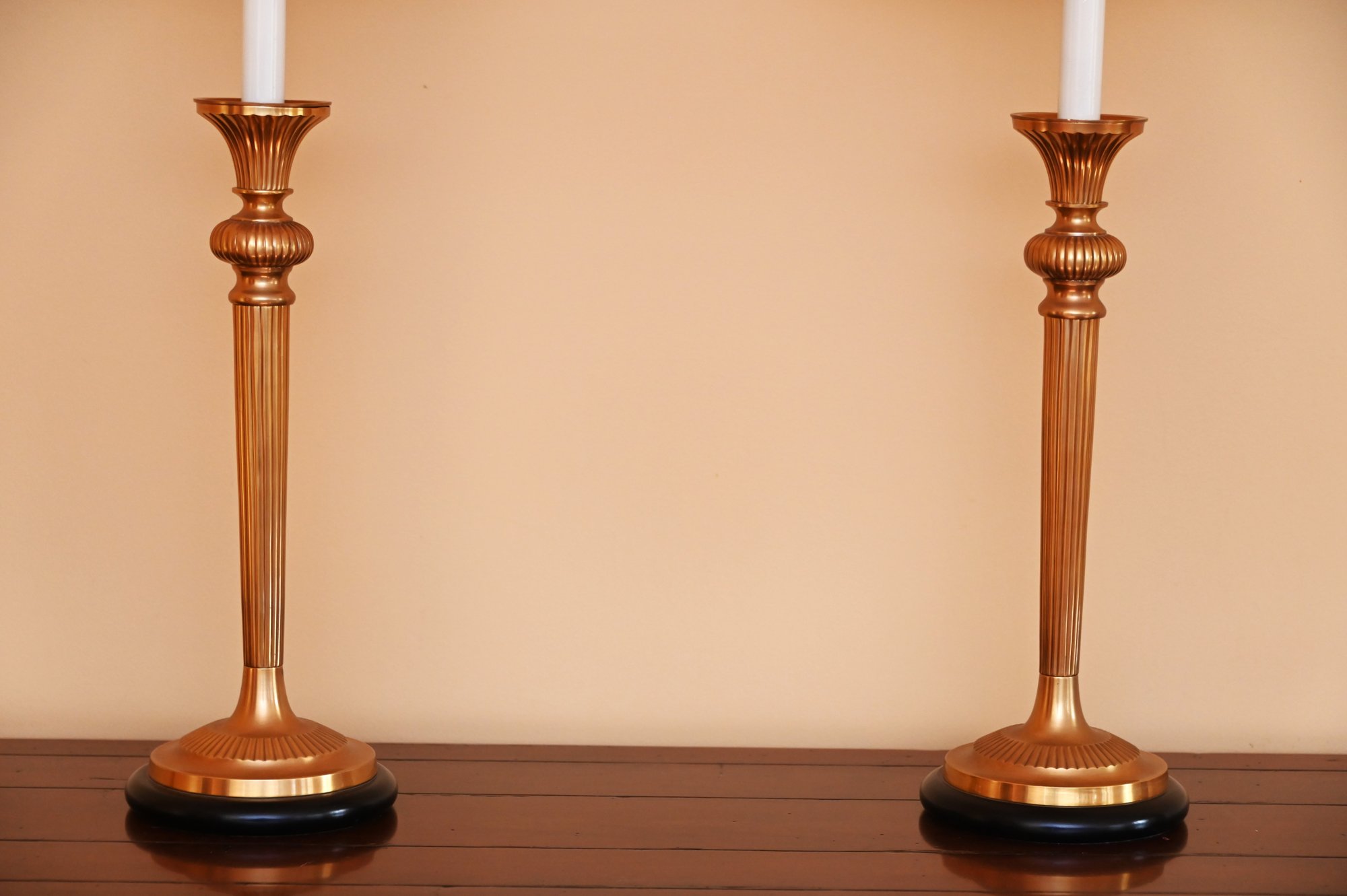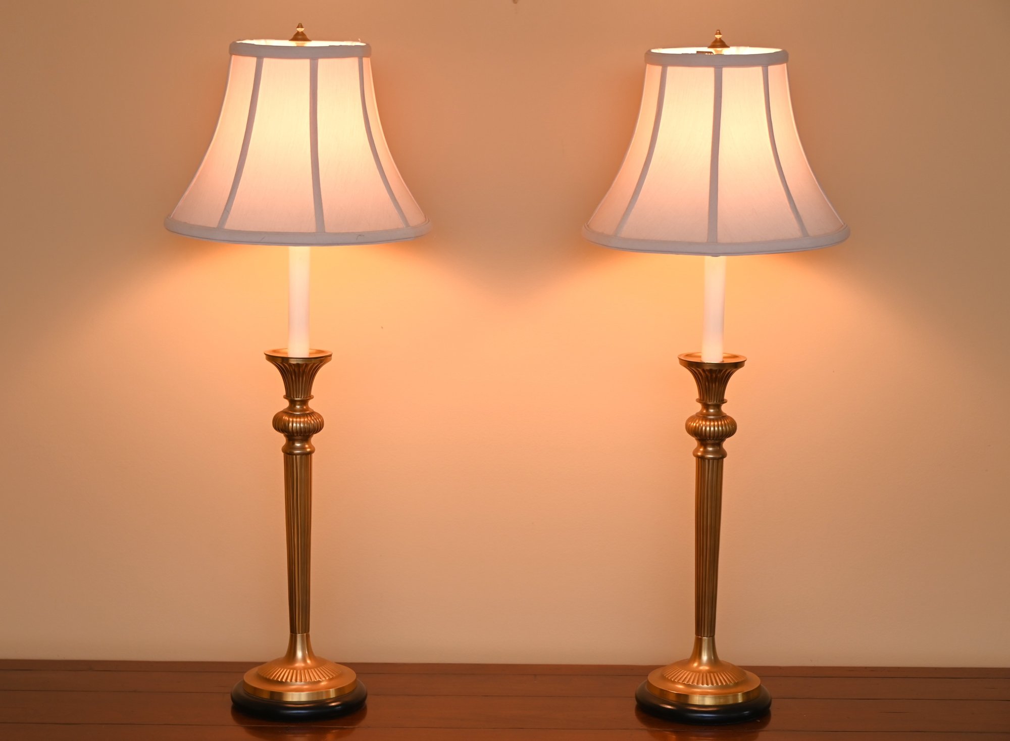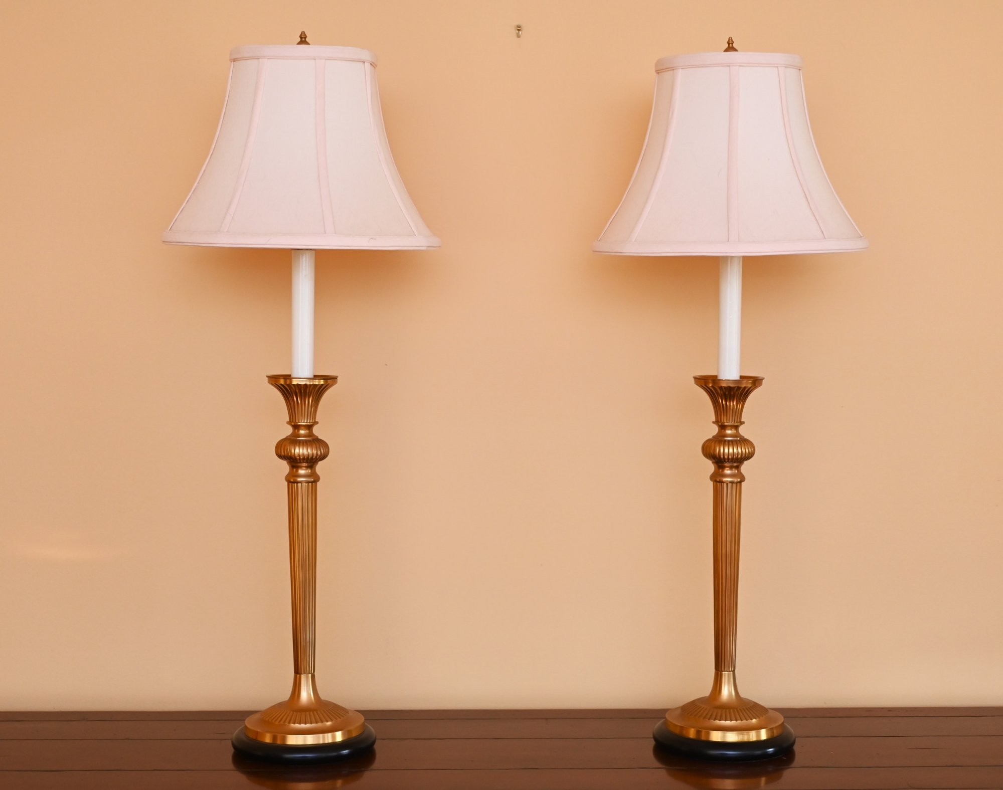 These lamps are in the style of Frederick Cooper, a renowned lighting designer known for elegant and timeless designs. This pair of table lamps features tall, fluted brass bases with a rich golden finish, accented with a subtle black base trim for contrast. The lamps have a classic candlestick silhouette with white candle-style columns supporting soft pink, pleated bell-shaped shades.
