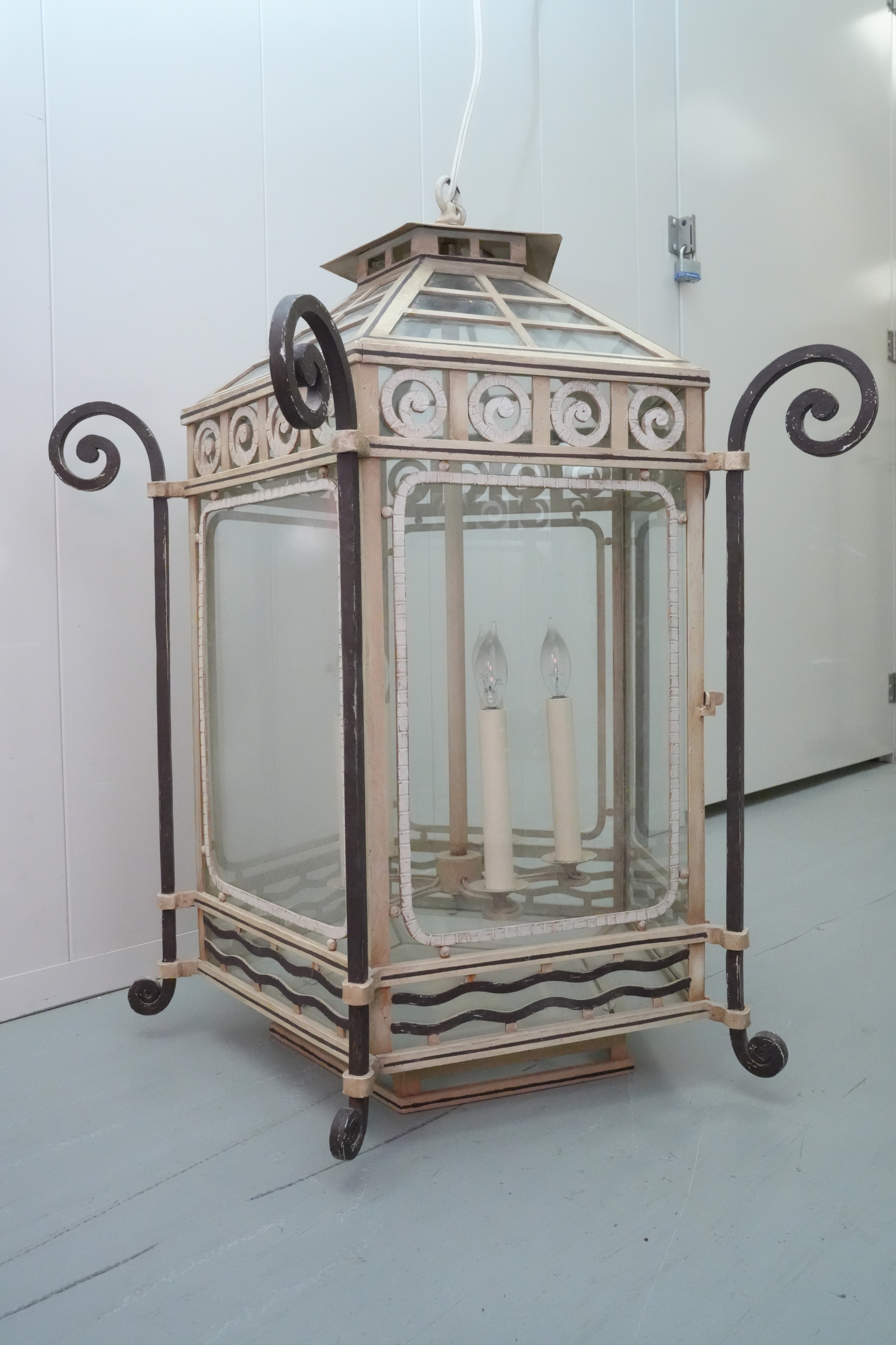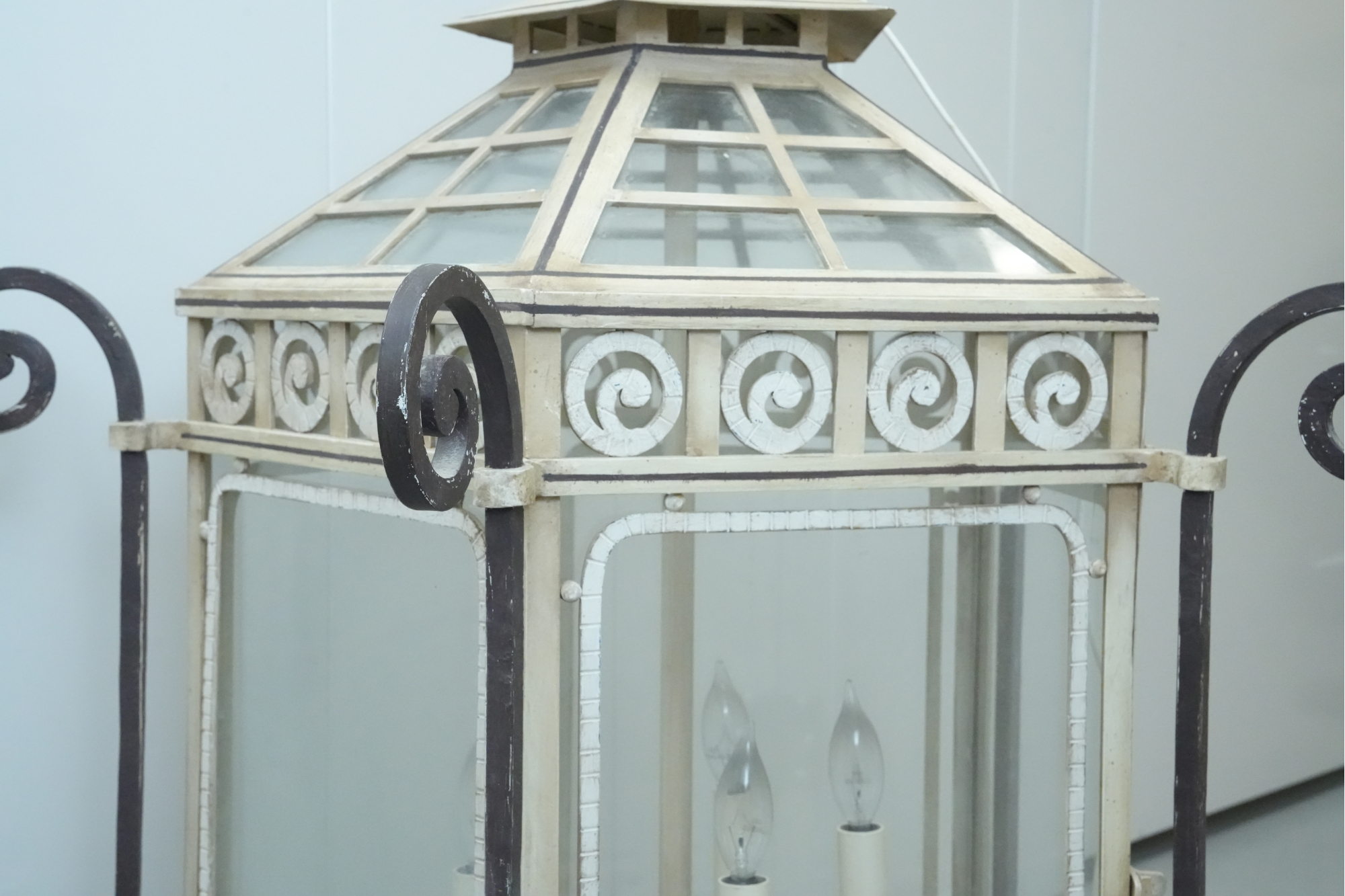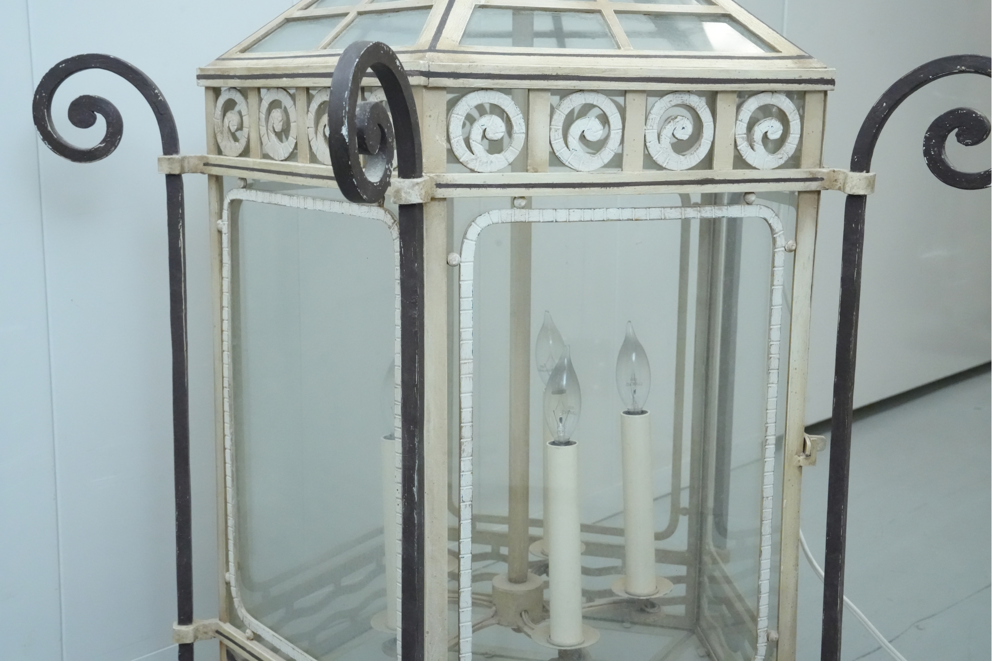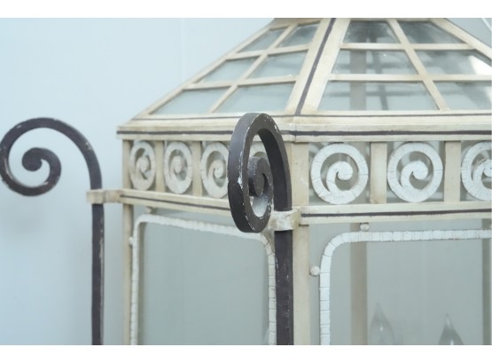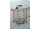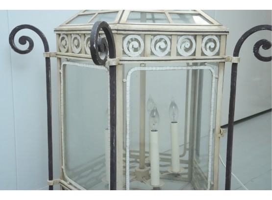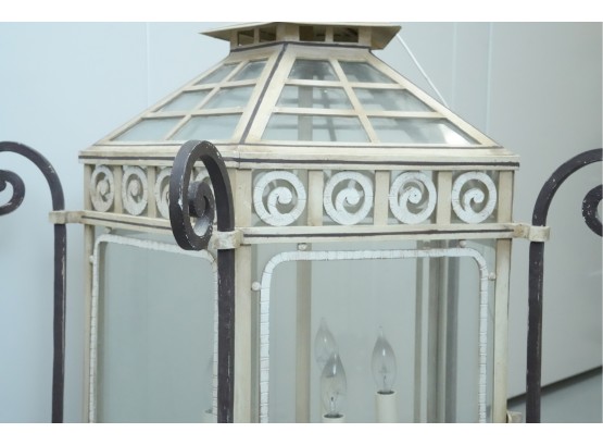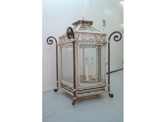 19th-century French style metal and glass panel porch lantern with a distressed paint finish.