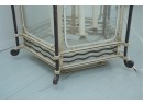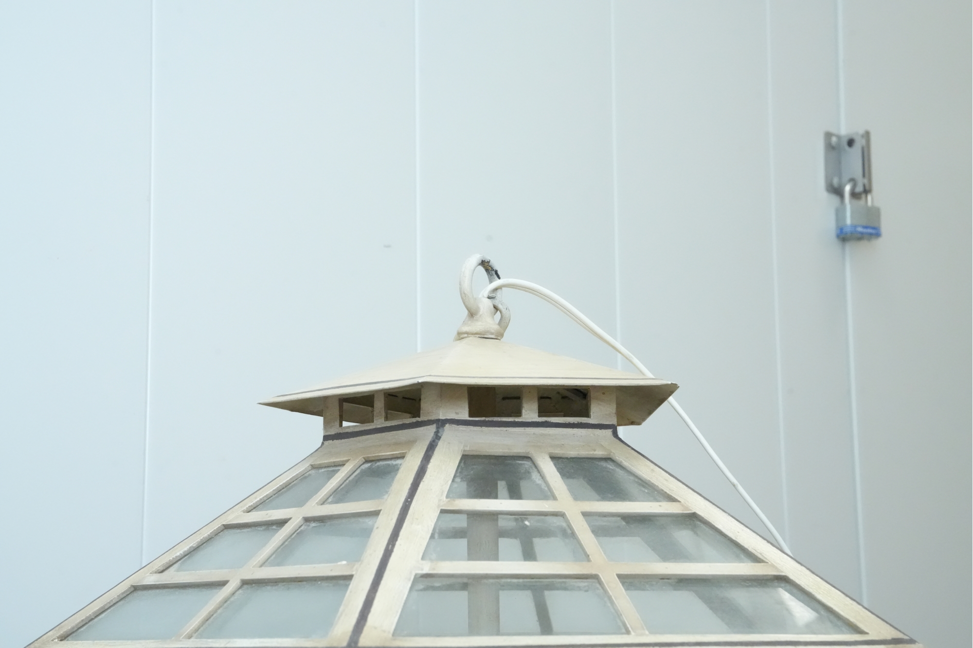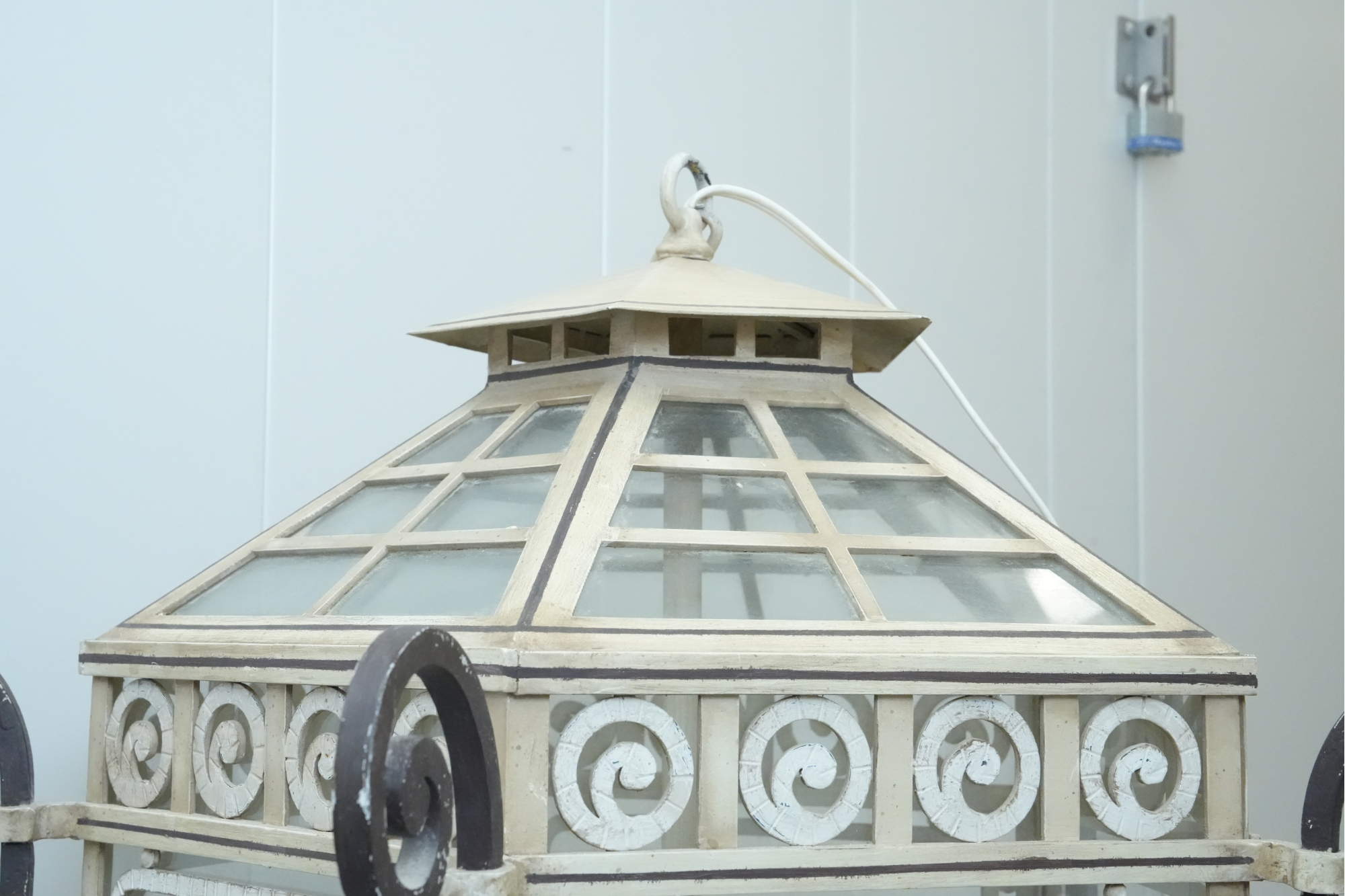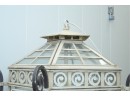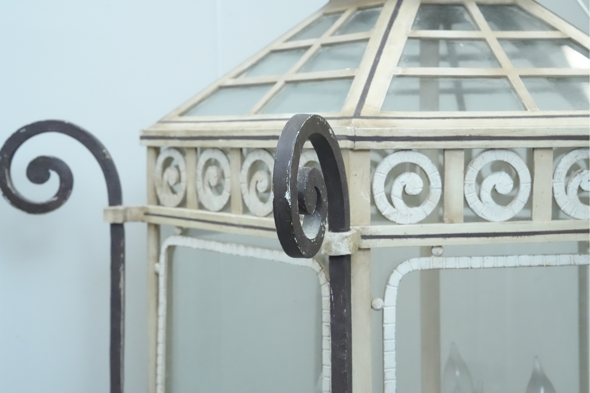 19th-century French style metal and glass panel porch lantern with a distressed paint finish.