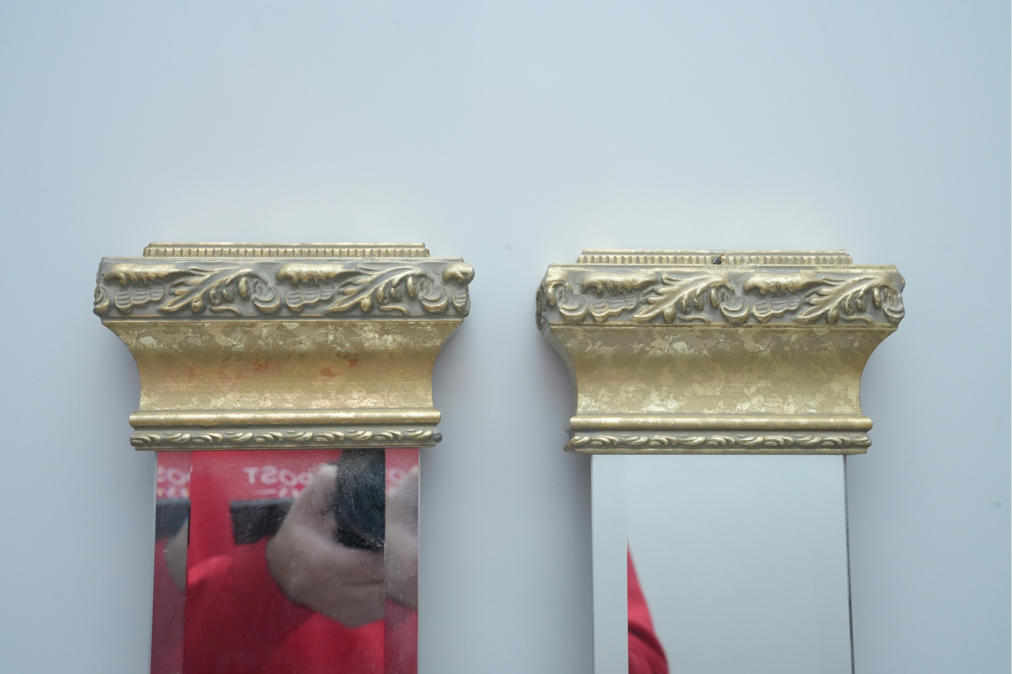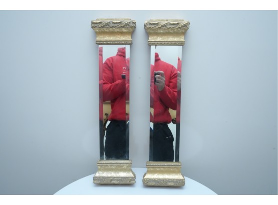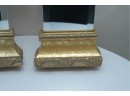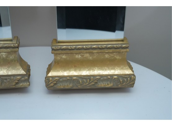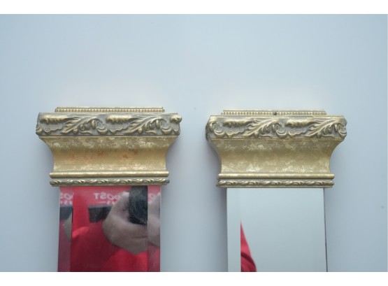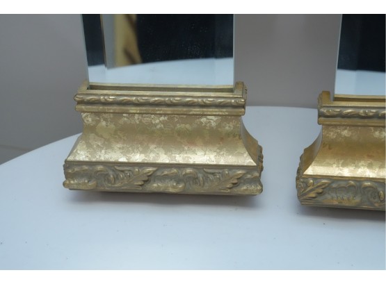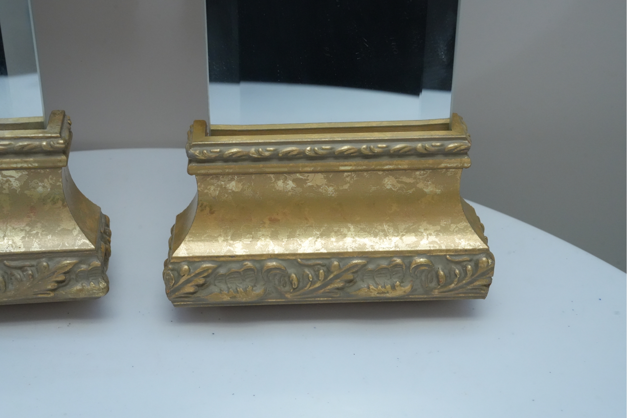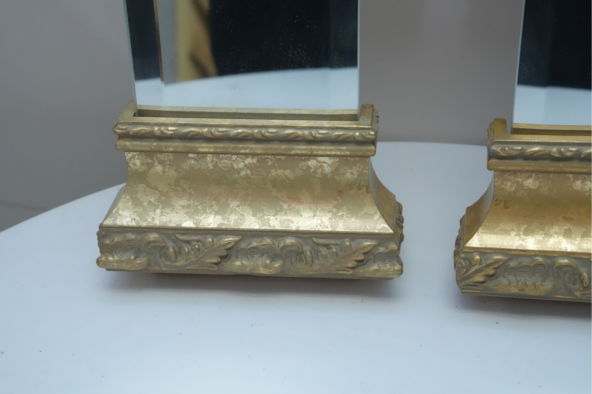 Pair of French-style gilded pedestal wall mirrors, with reflective panels and gold accents.