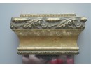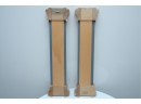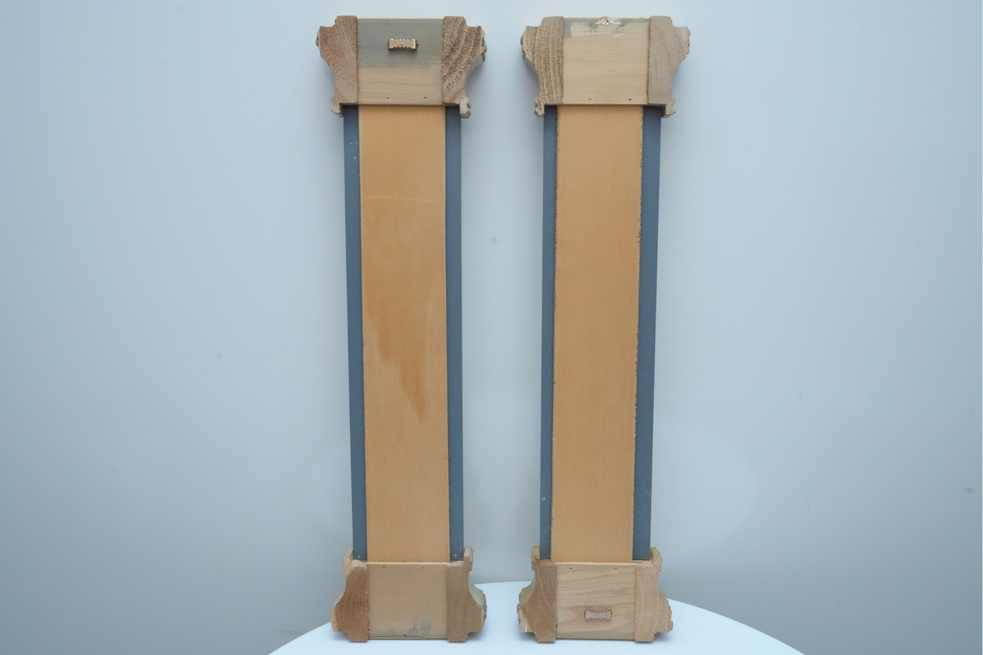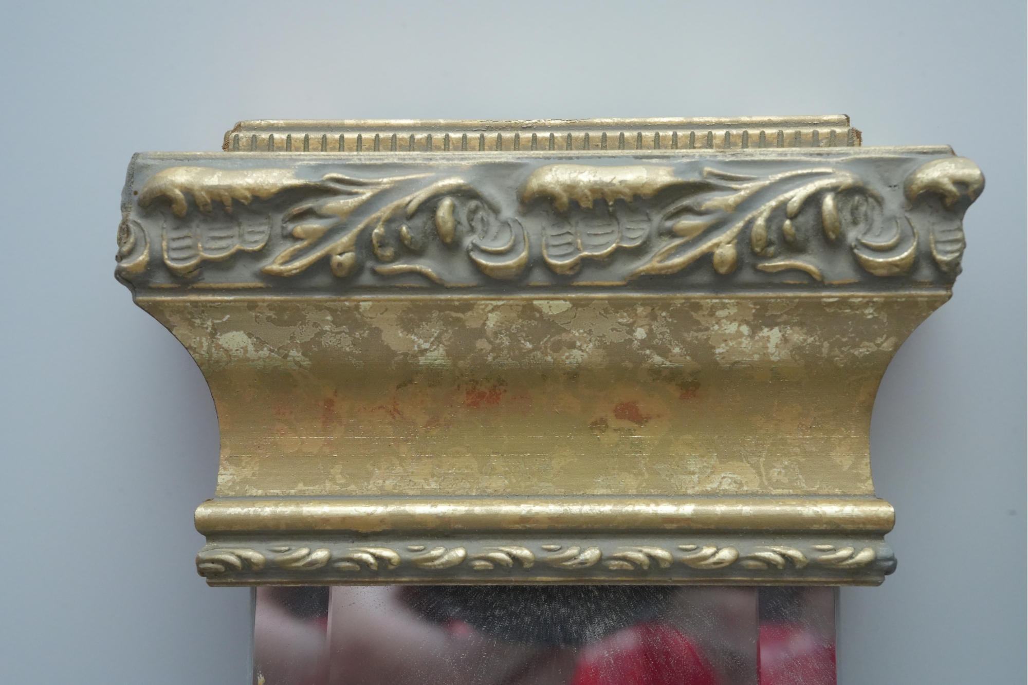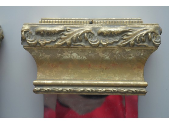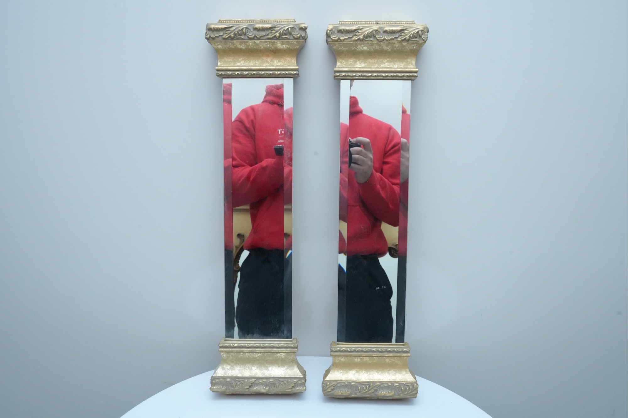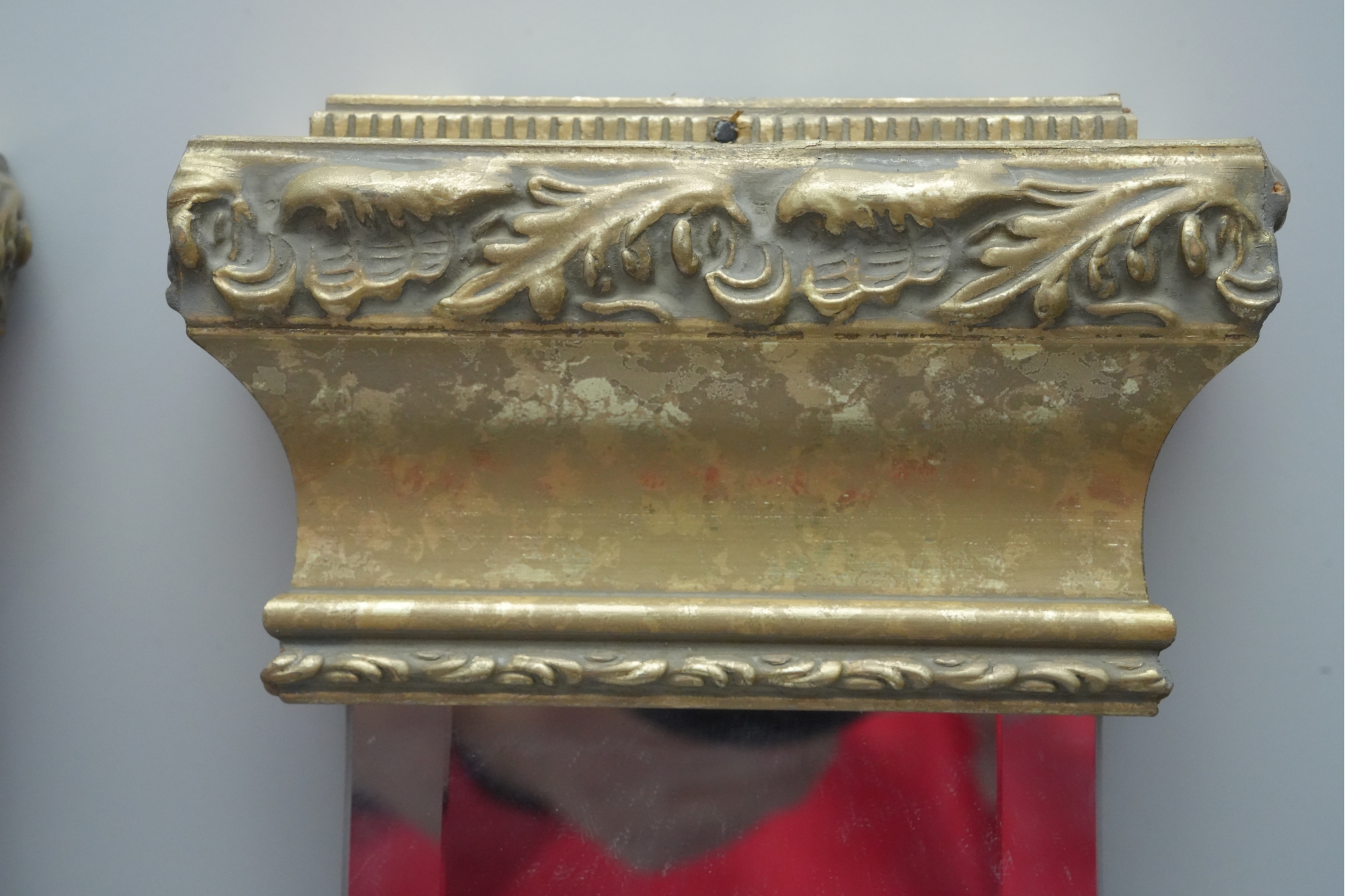 Pair of French-style gilded pedestal wall mirrors, with reflective panels and gold accents.
