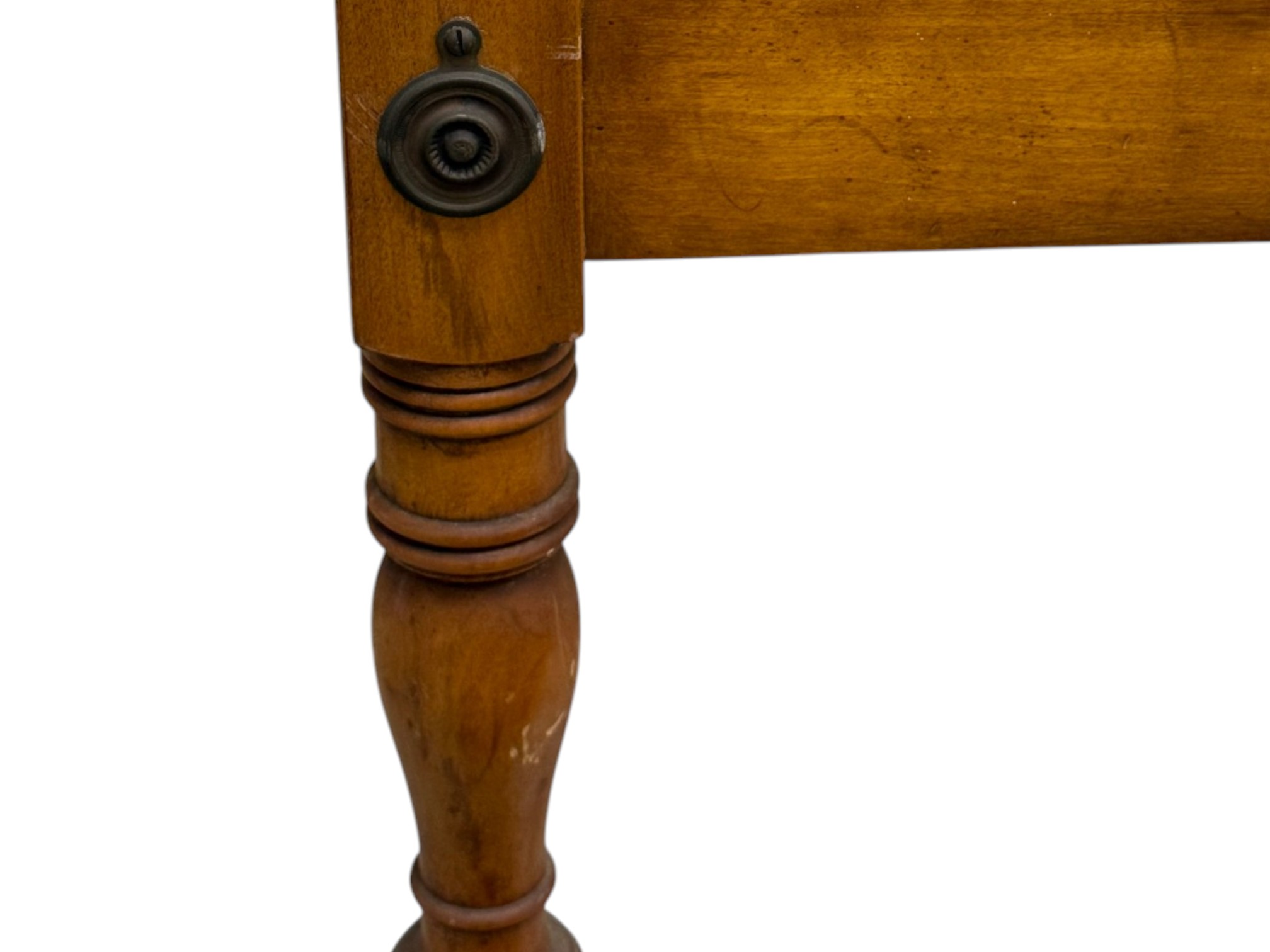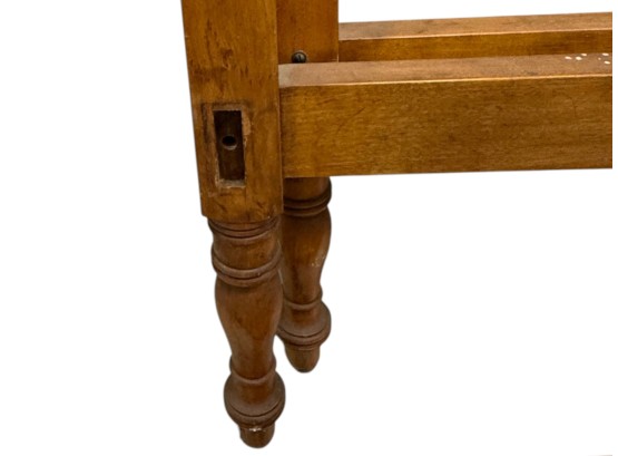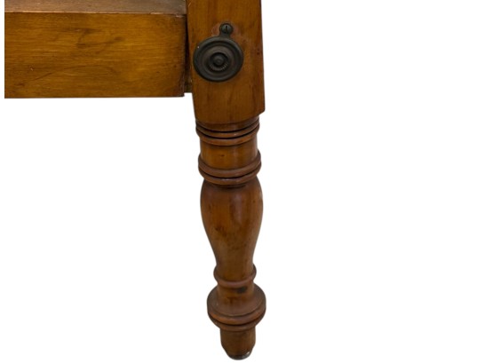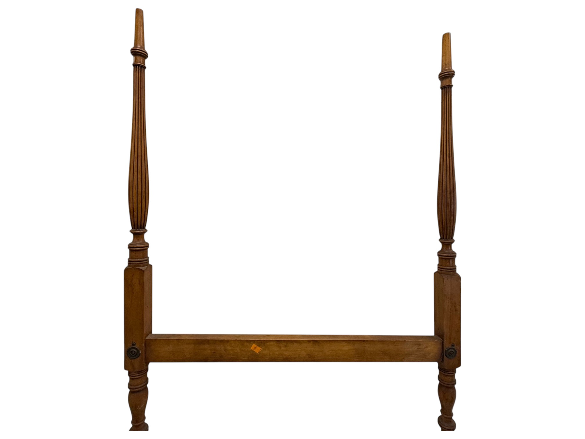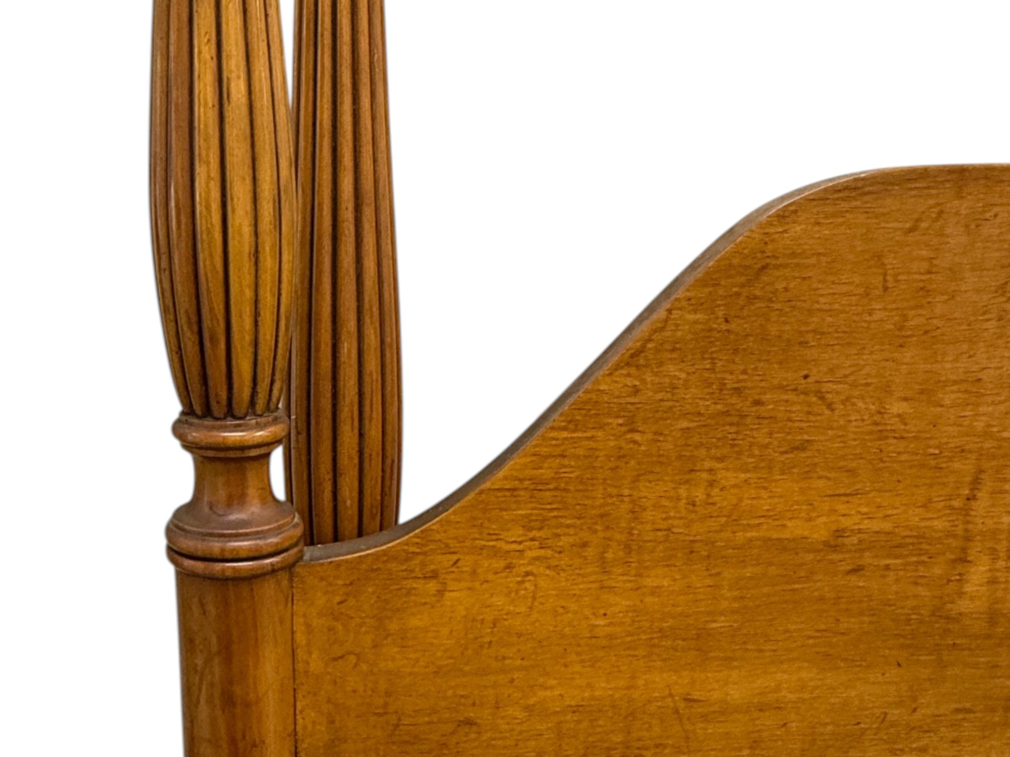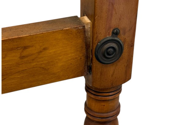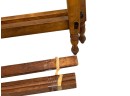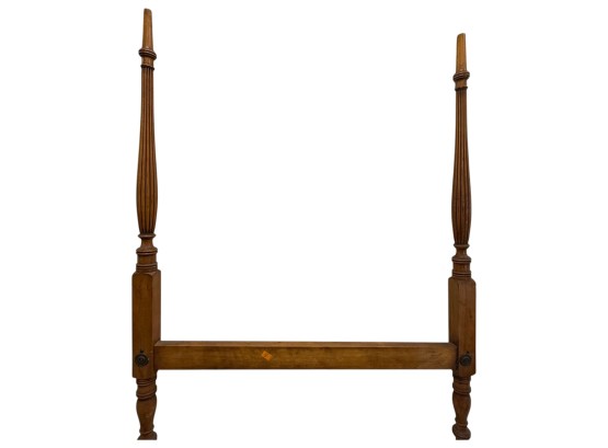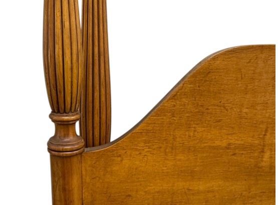Antique (19th c.) American Federal-style maple wood canopy twin-sized four-poster bed frame with carved details. Offered in pieces requiring re‑assembly, the bed includes headboard, footboard, bottom/side rails and wooden platform slats.