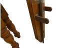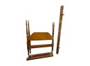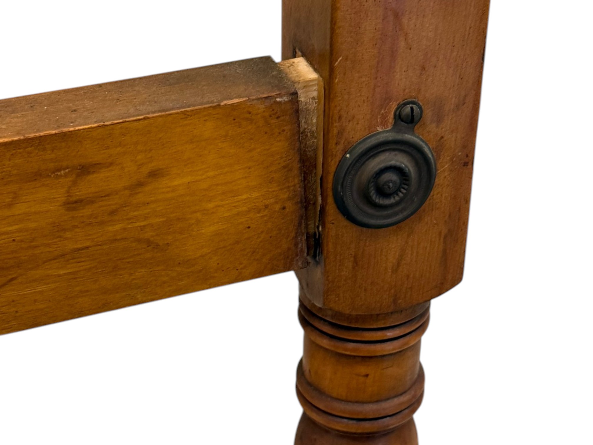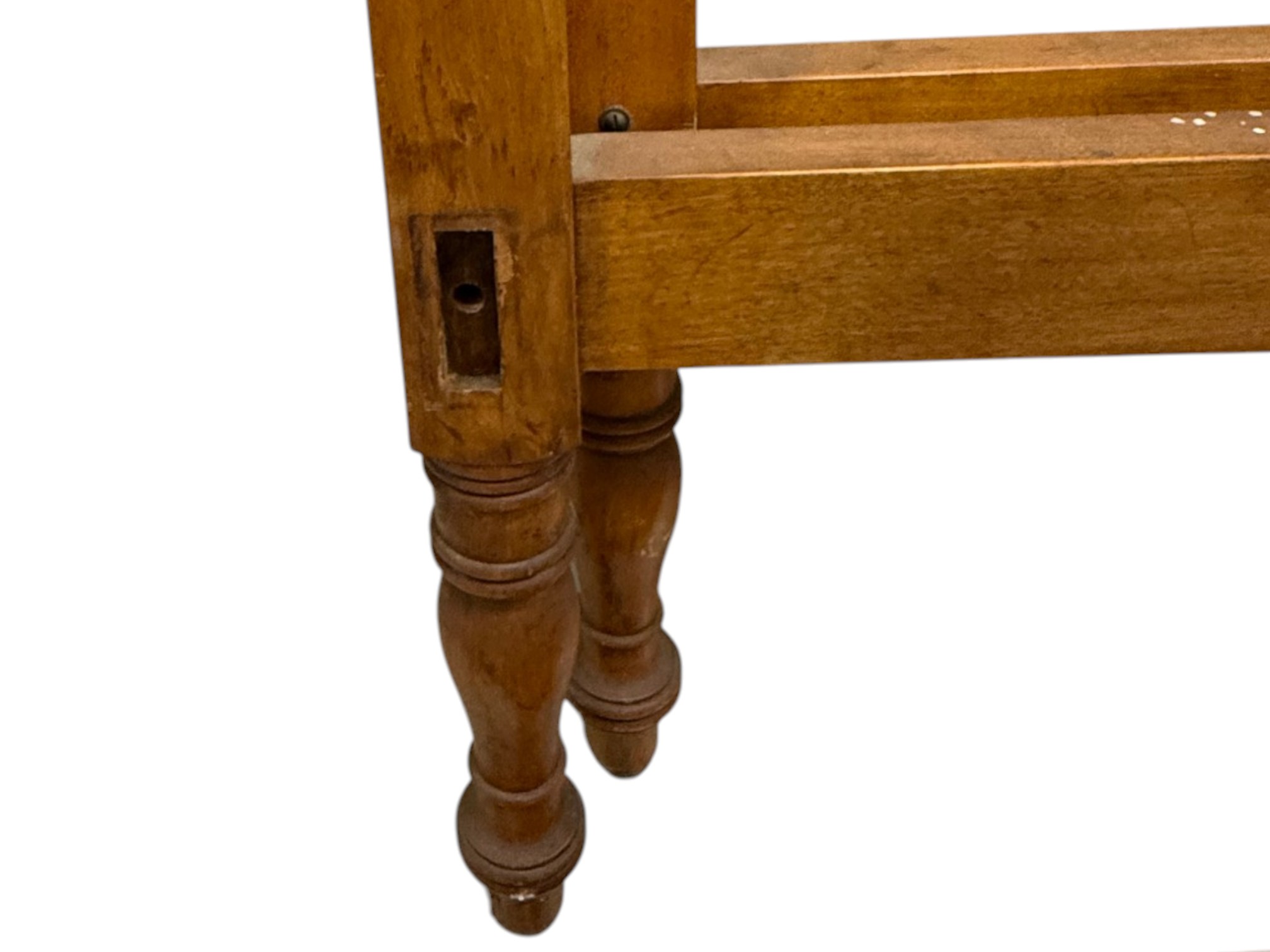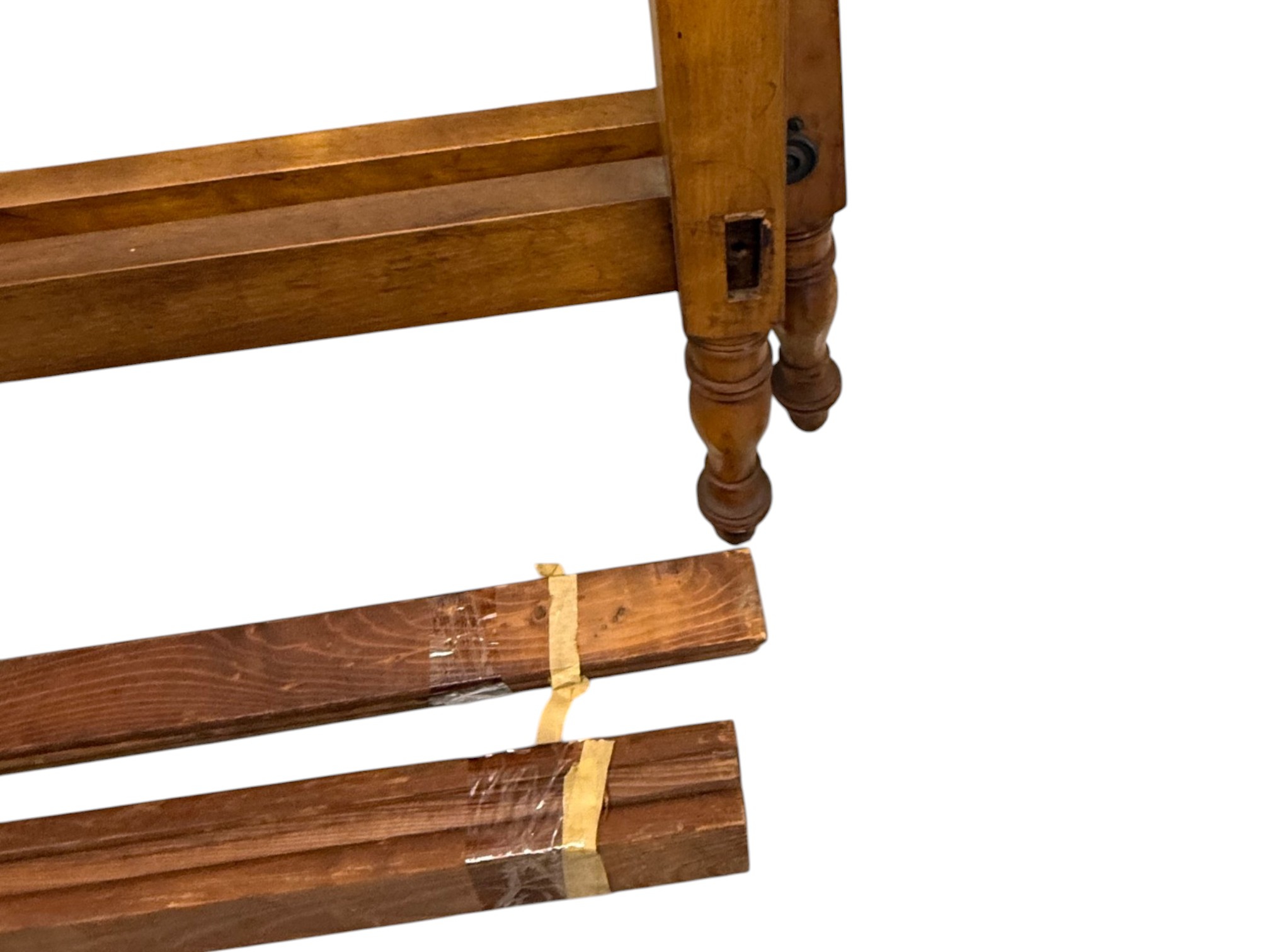Antique (19th c.) American Federal-style maple wood canopy twin-sized four-poster bed frame with carved details. Offered in pieces requiring re‑assembly, the bed includes headboard, footboard, bottom/side rails and wooden platform slats.