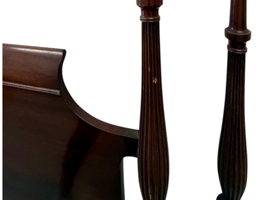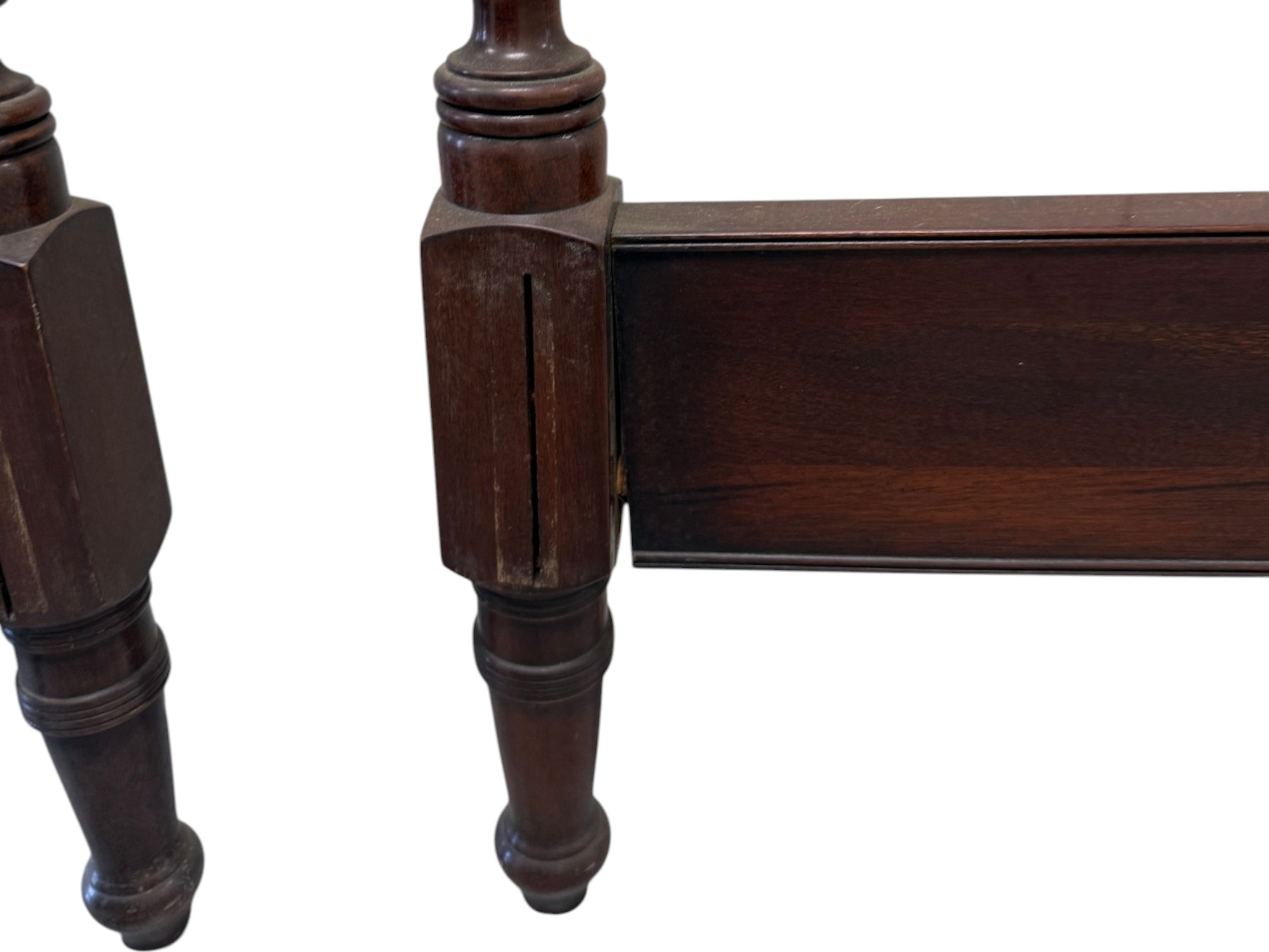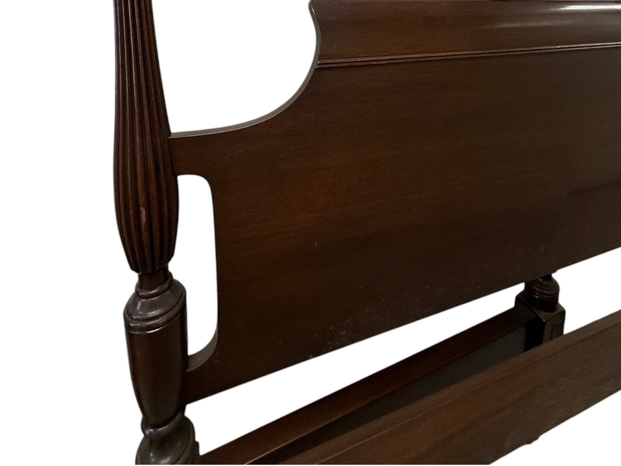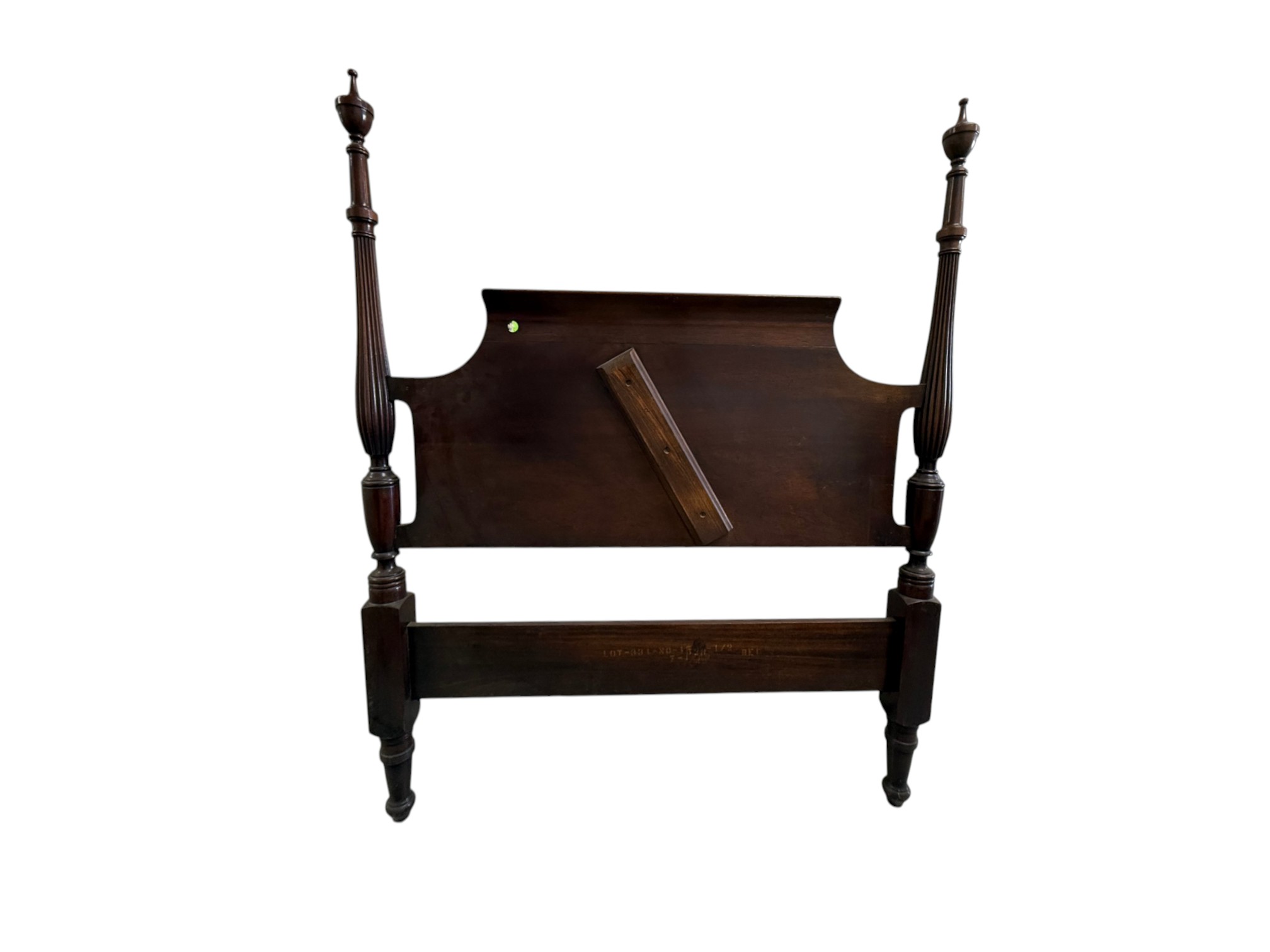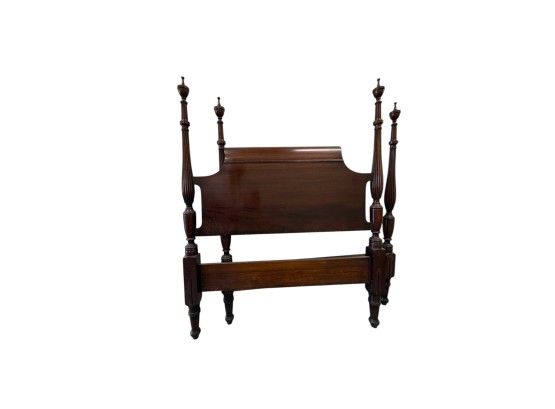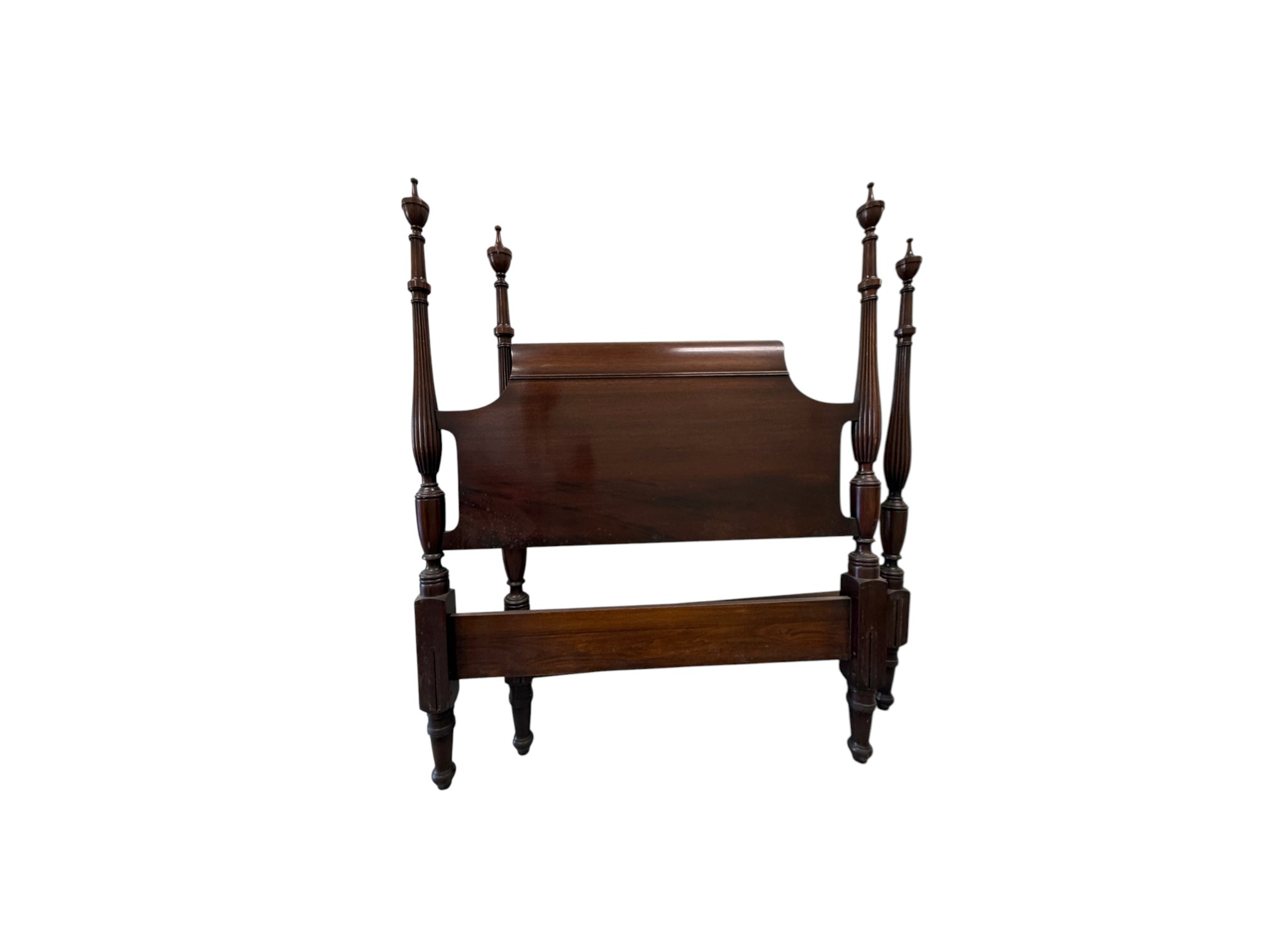 Two sets of Federal-style mahogany four-poster bed, featuring "scalloped" headboard, hand-turned reeded posts, and decorative finials. Offered in pieces requiring re‑assembly, the beds include headboard, footboard, and bottom/side rails. Some signs of wear to the wood due to age and use.
