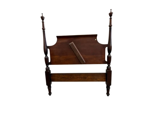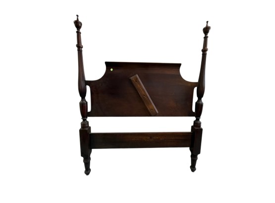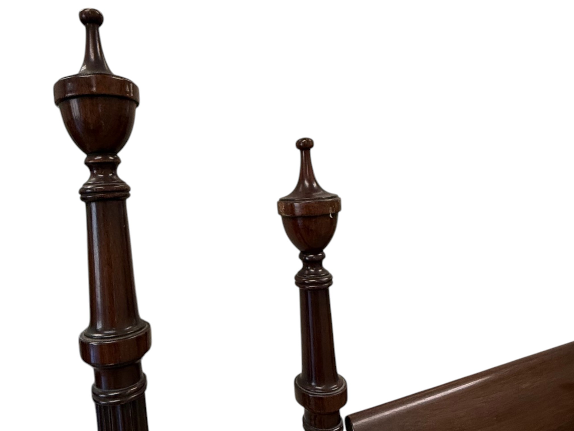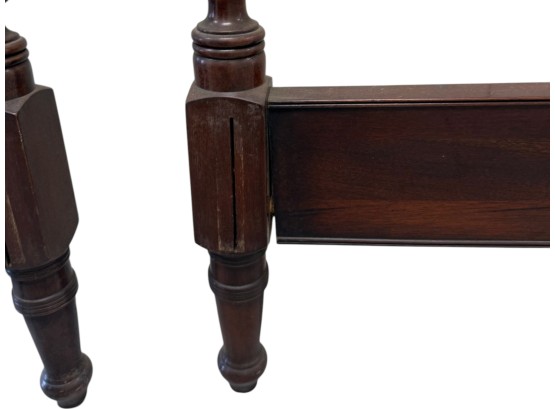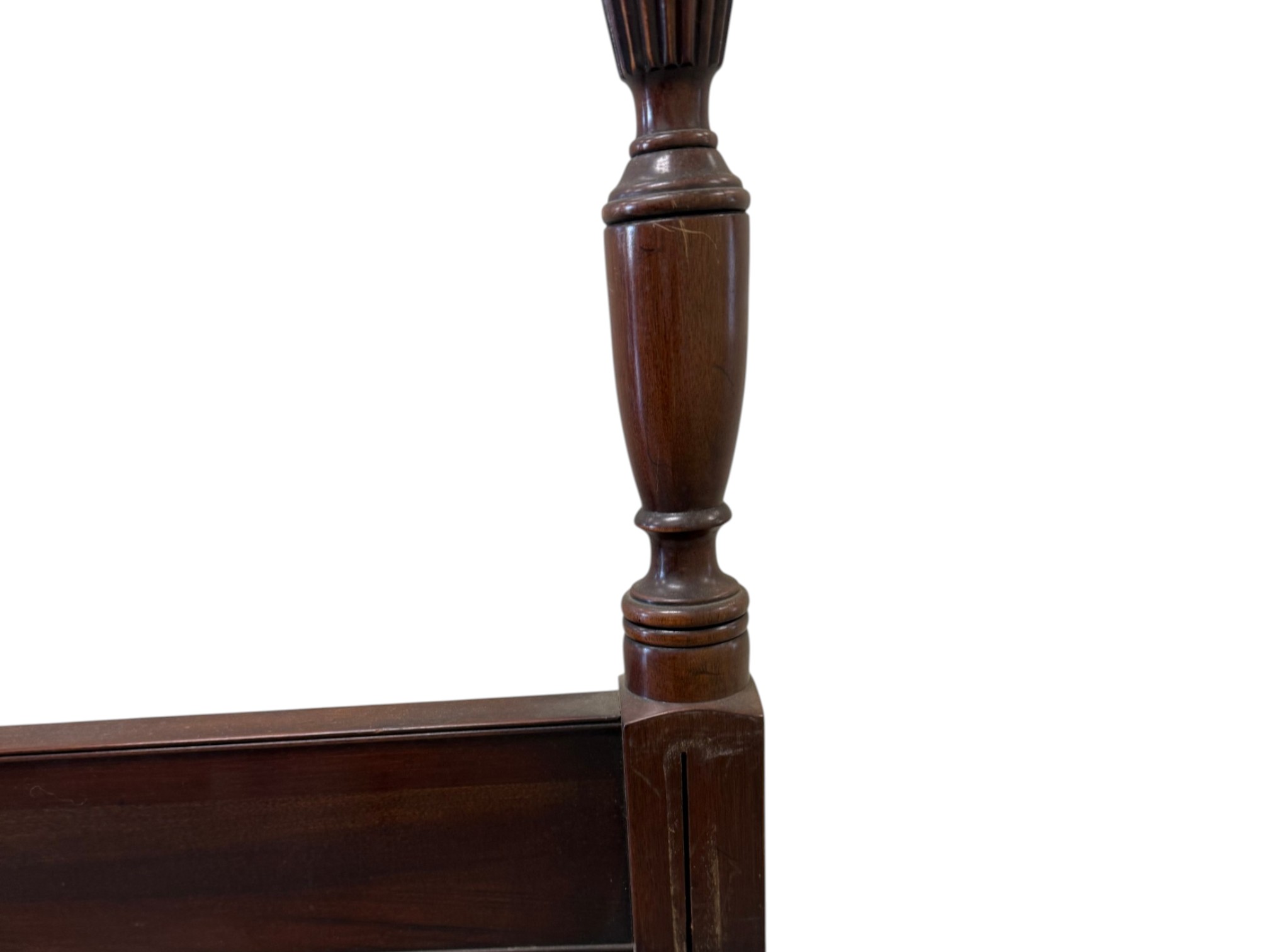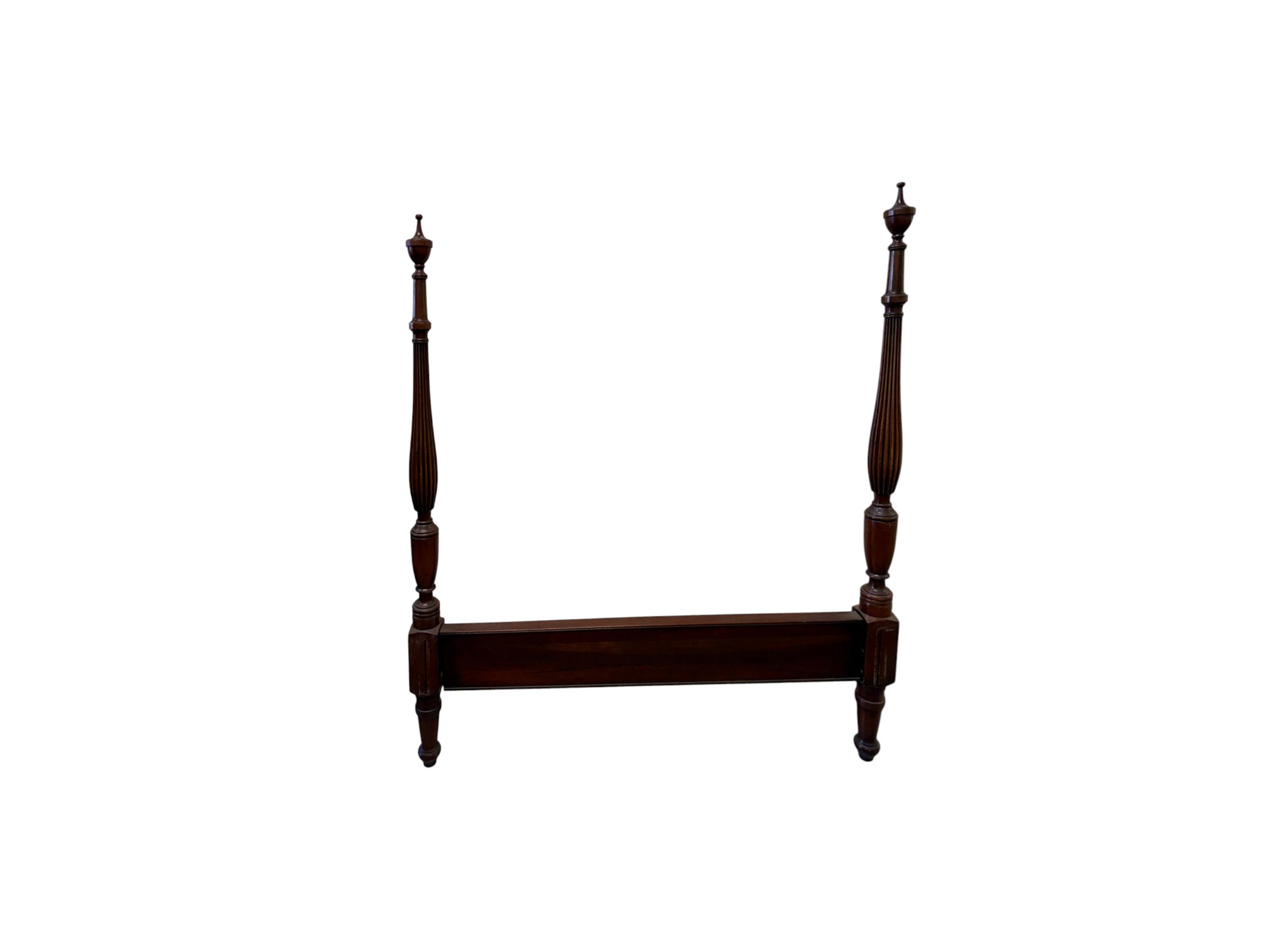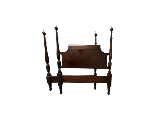 Two sets of Federal-style mahogany four-poster bed, featuring "scalloped" headboard, hand-turned reeded posts, and decorative finials. Offered in pieces requiring re‑assembly, the beds include headboard, footboard, and bottom/side rails. Some signs of wear to the wood due to age and use.