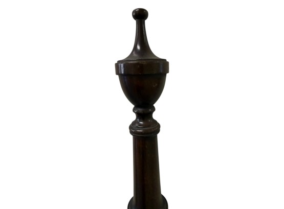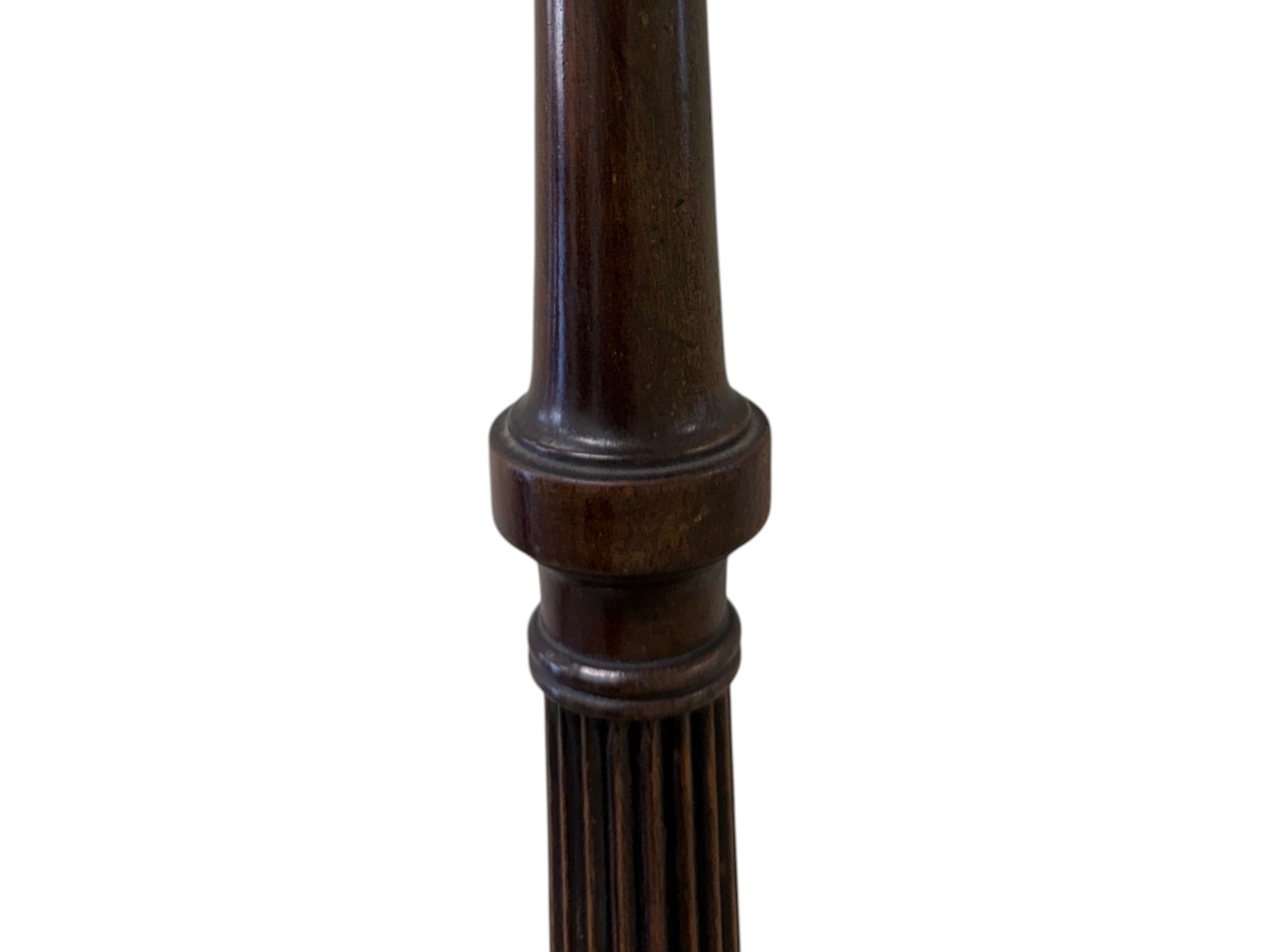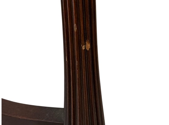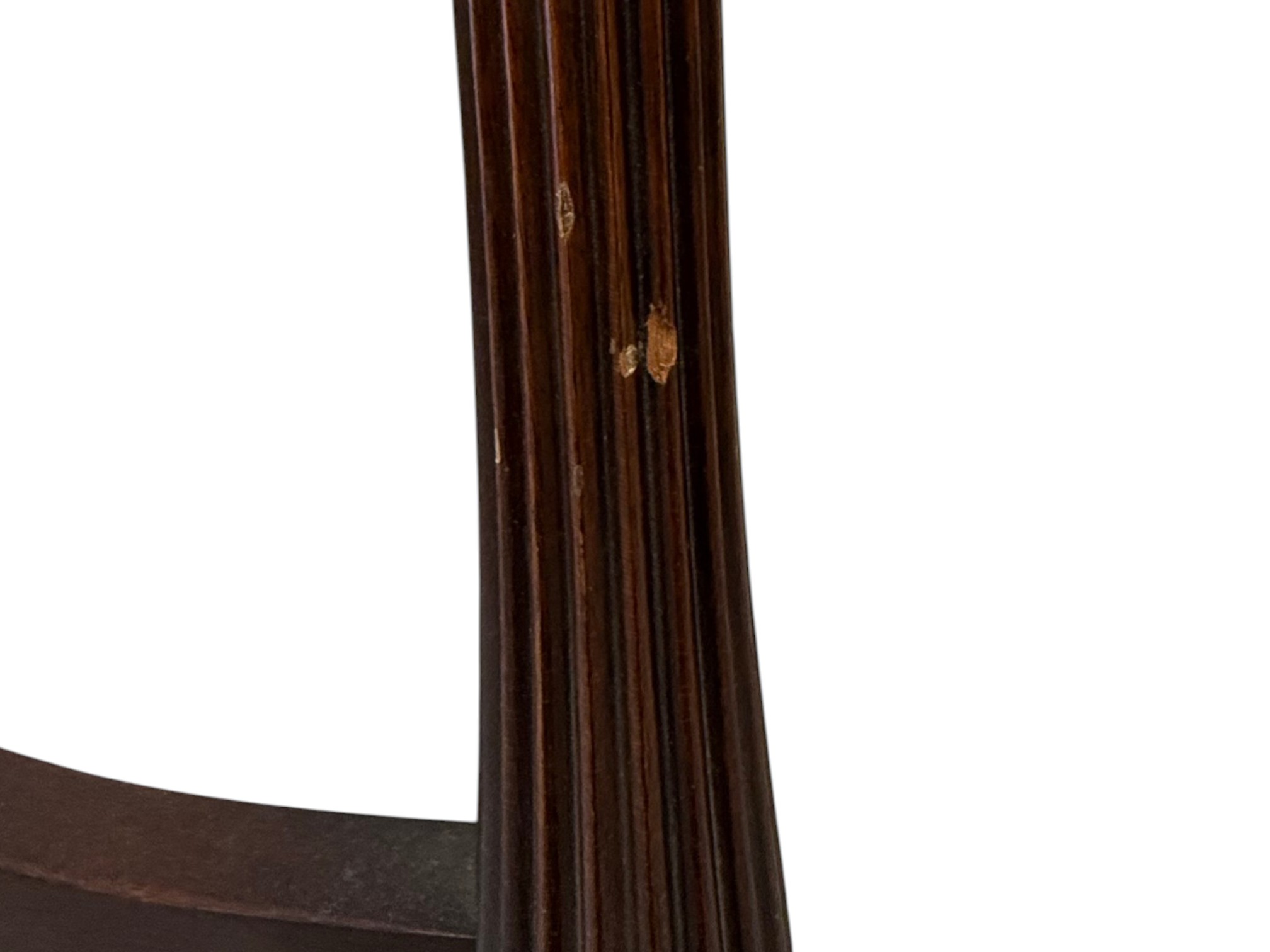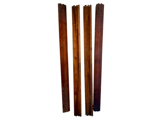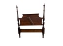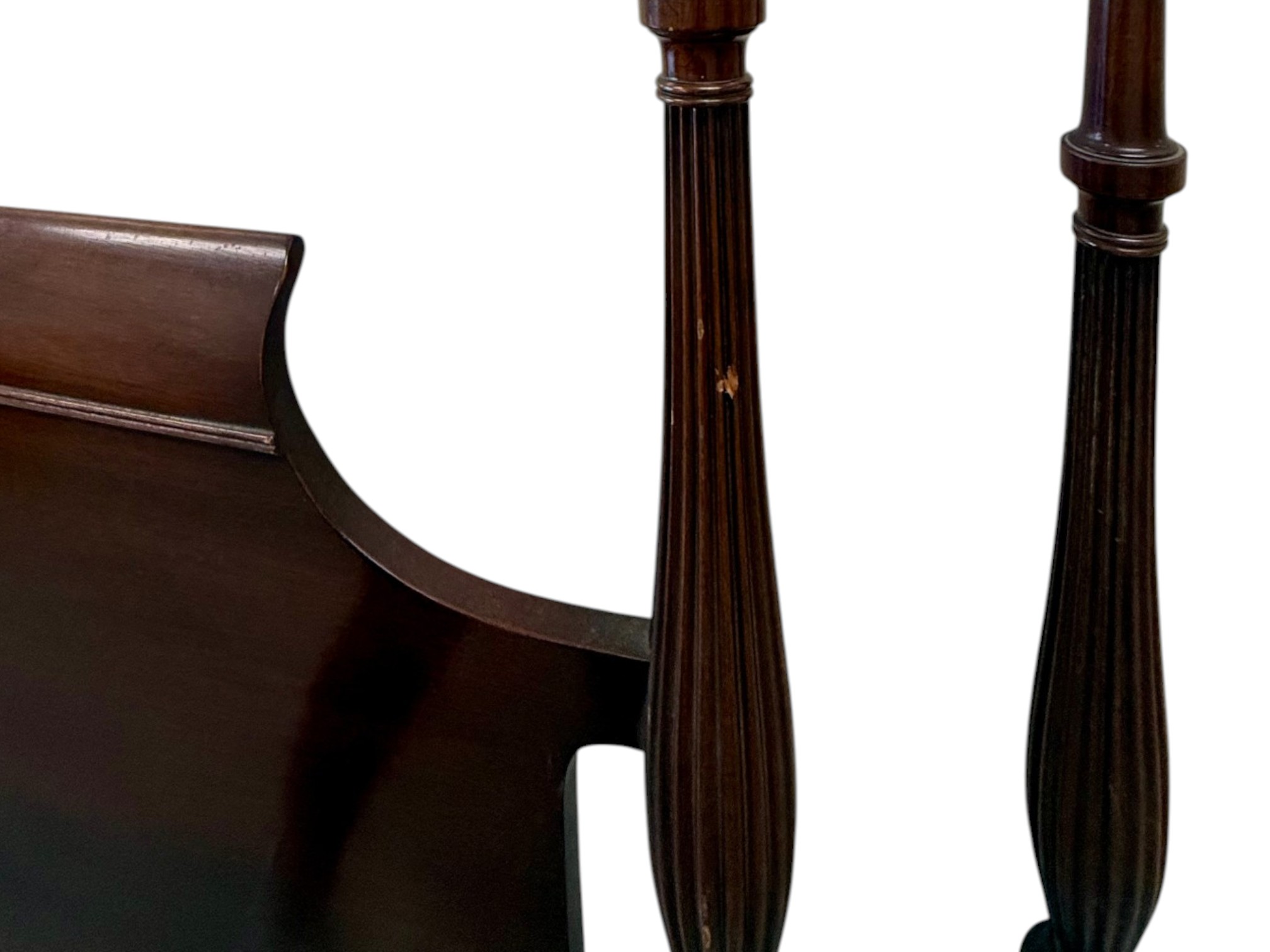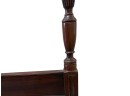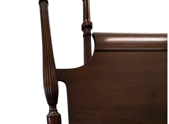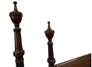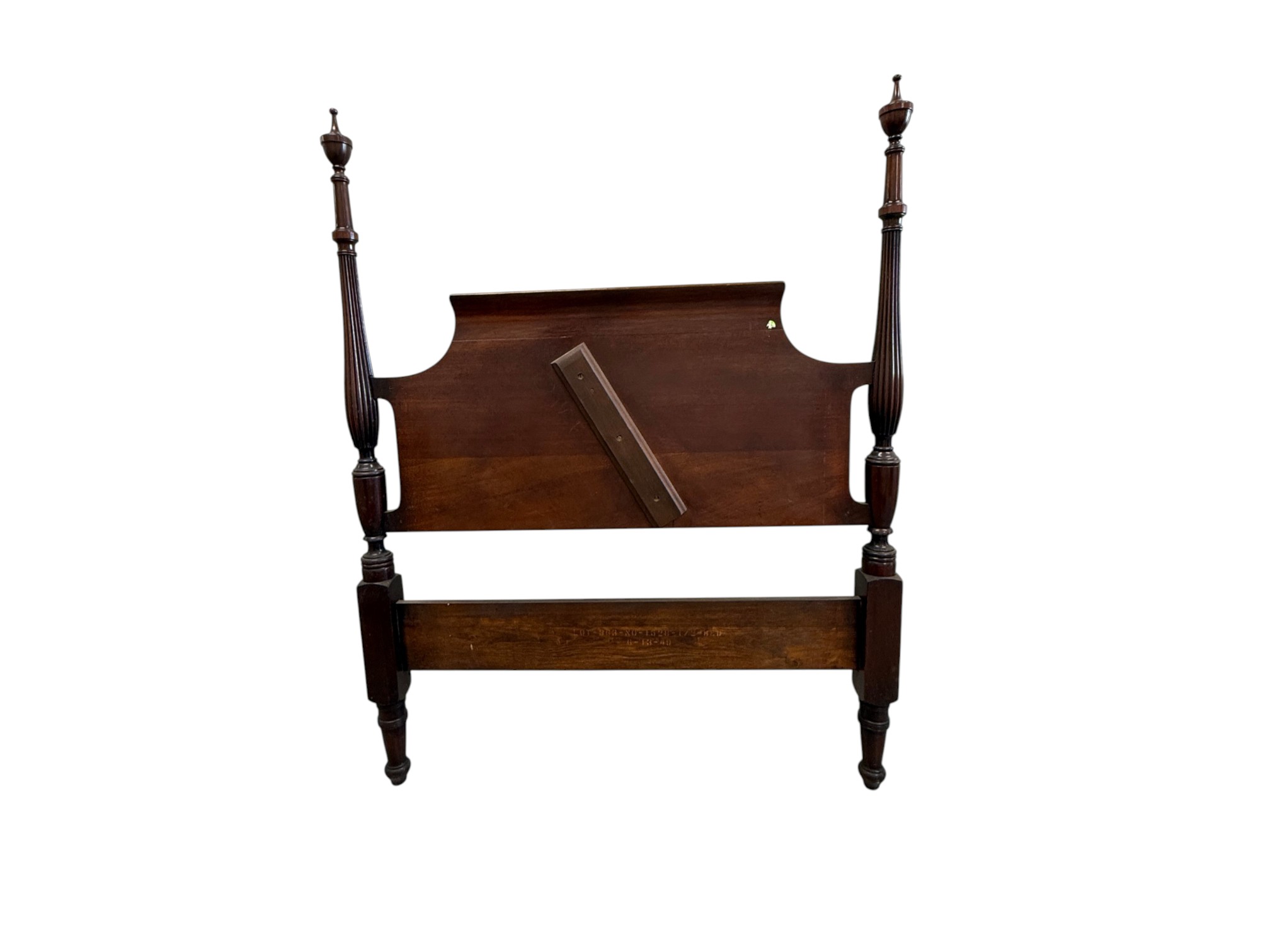 Two sets of Federal-style mahogany four-poster bed, featuring "scalloped" headboard, hand-turned reeded posts, and decorative finials. Offered in pieces requiring re‑assembly, the beds include headboard, footboard, and bottom/side rails. Some signs of wear to the wood due to age and use.