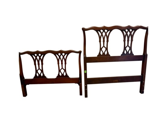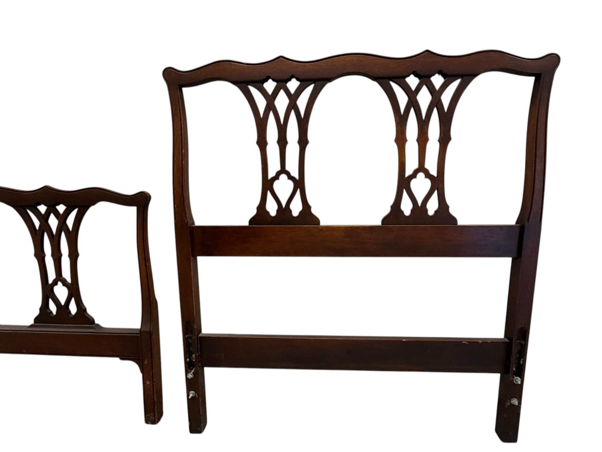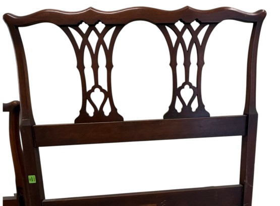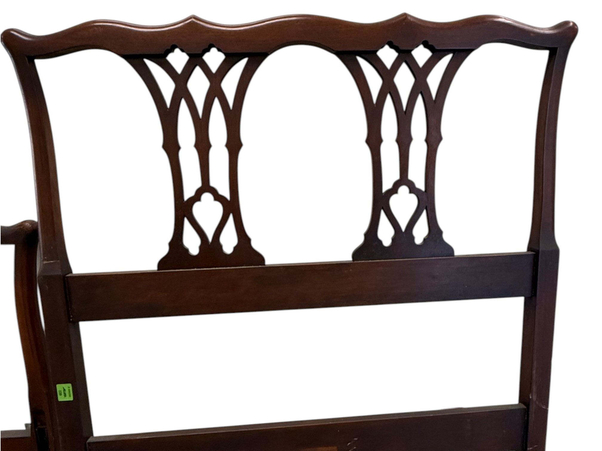 Chippendale-style solid wood, likely cherry wood, twin-sized bedframe, featuring an arched top and intricate decorative openwork details. Some signs of wear to the wood due to age and use.
