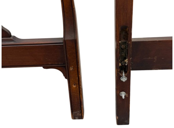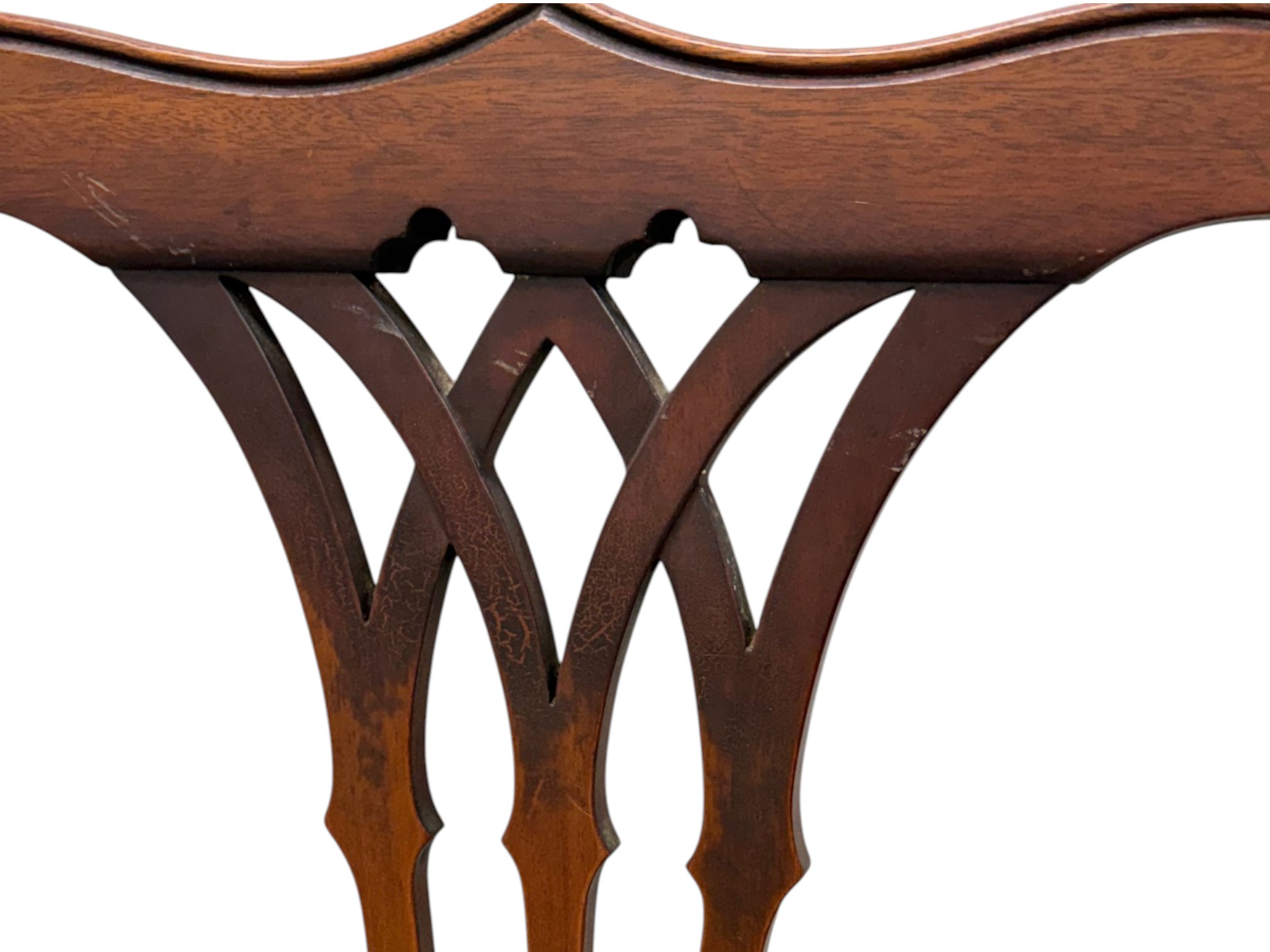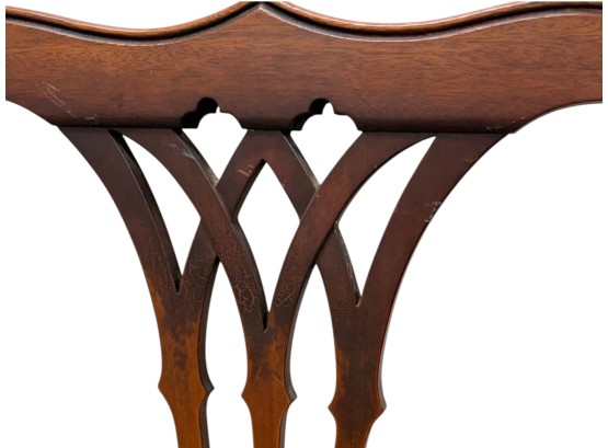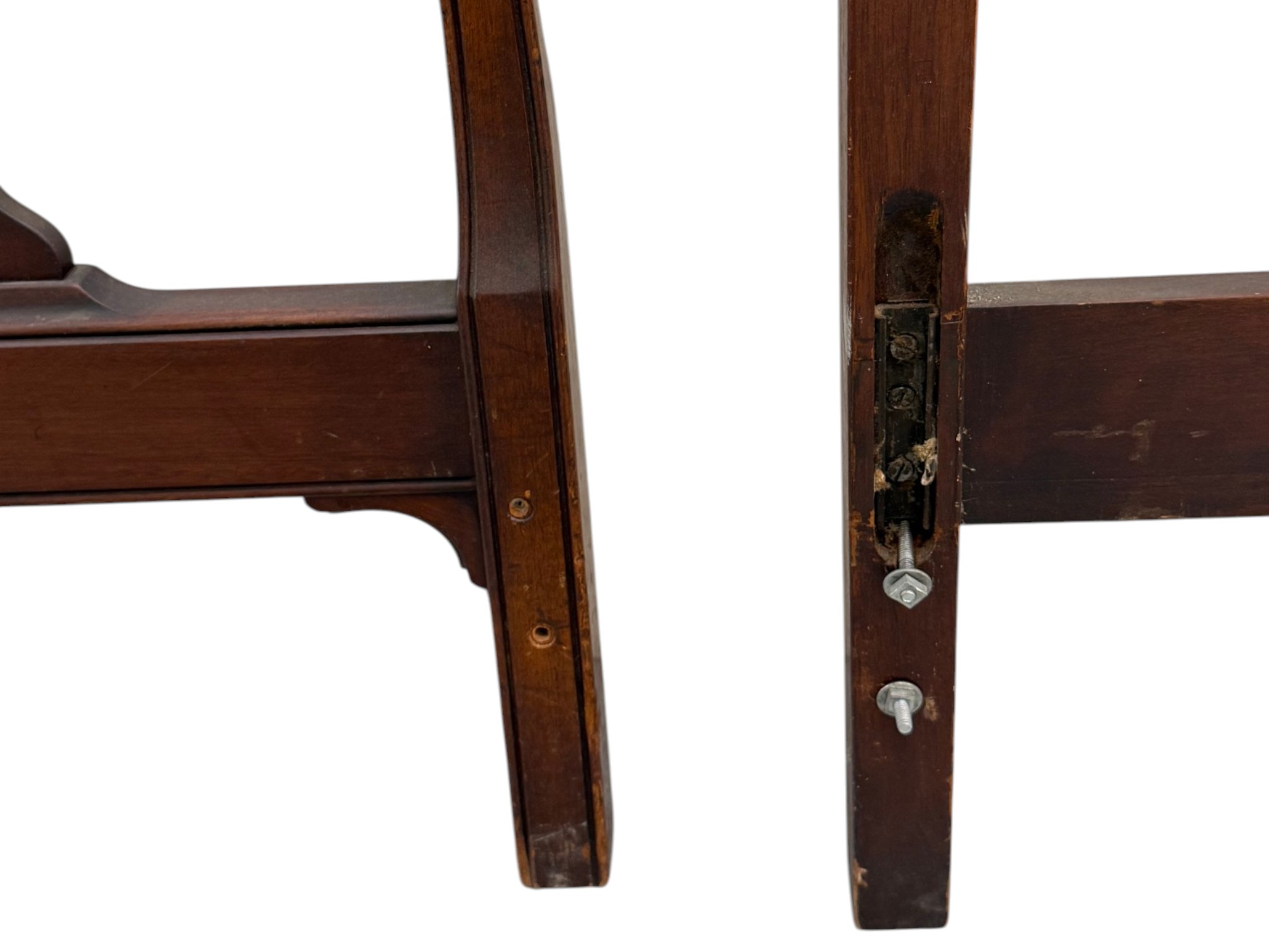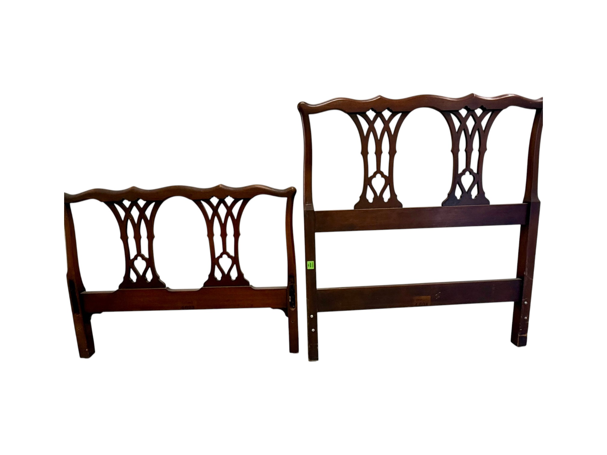 Chippendale-style solid wood, likely cherry wood, twin-sized bedframe, featuring an arched top and intricate decorative openwork details. Some signs of wear to the wood due to age and use.