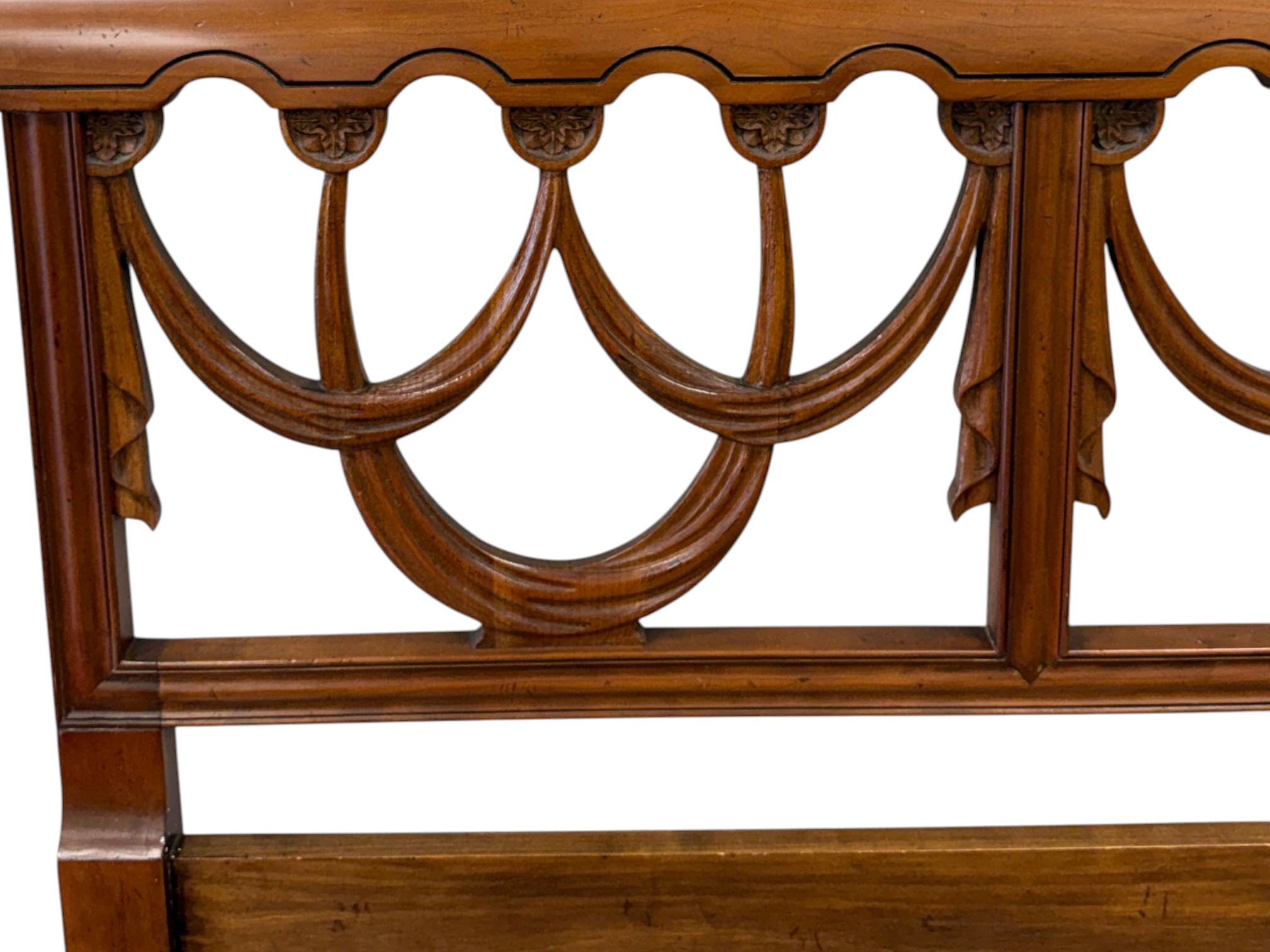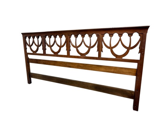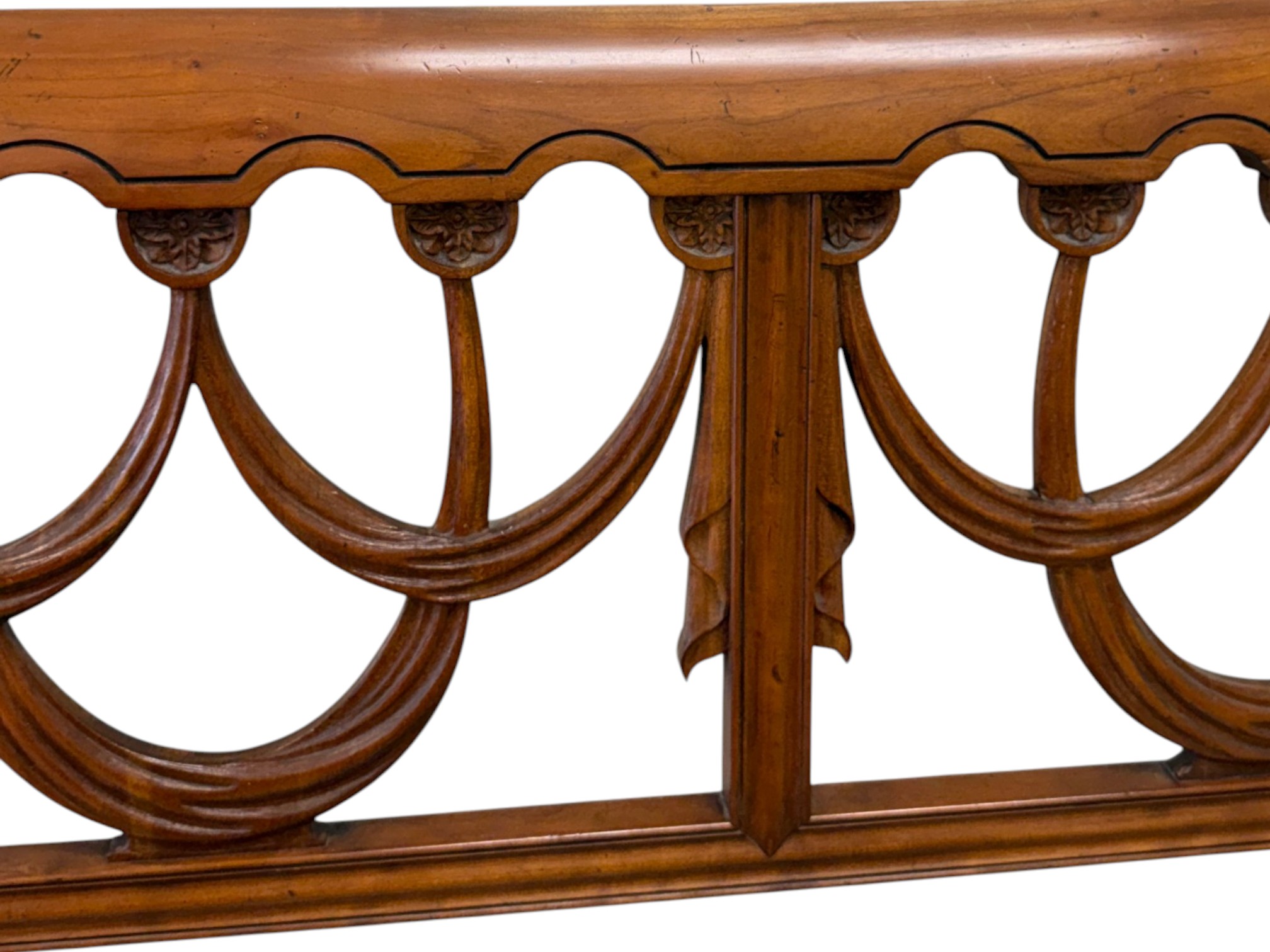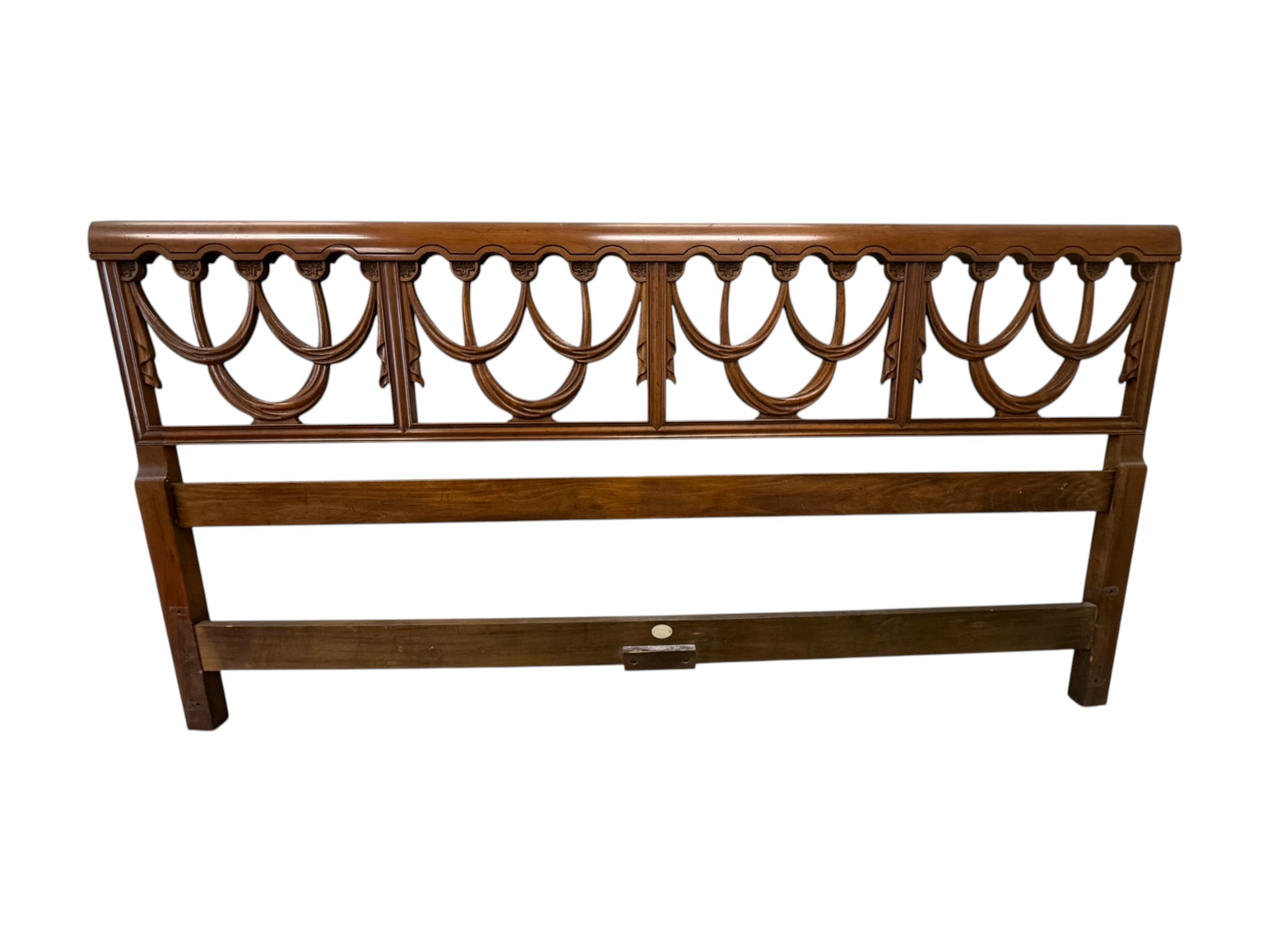 Baker Furniture Chippendale-style mahogany king-size headboard, featuring intricate open fretwork carving along the top rail that mimics the flow of draped ribbons.