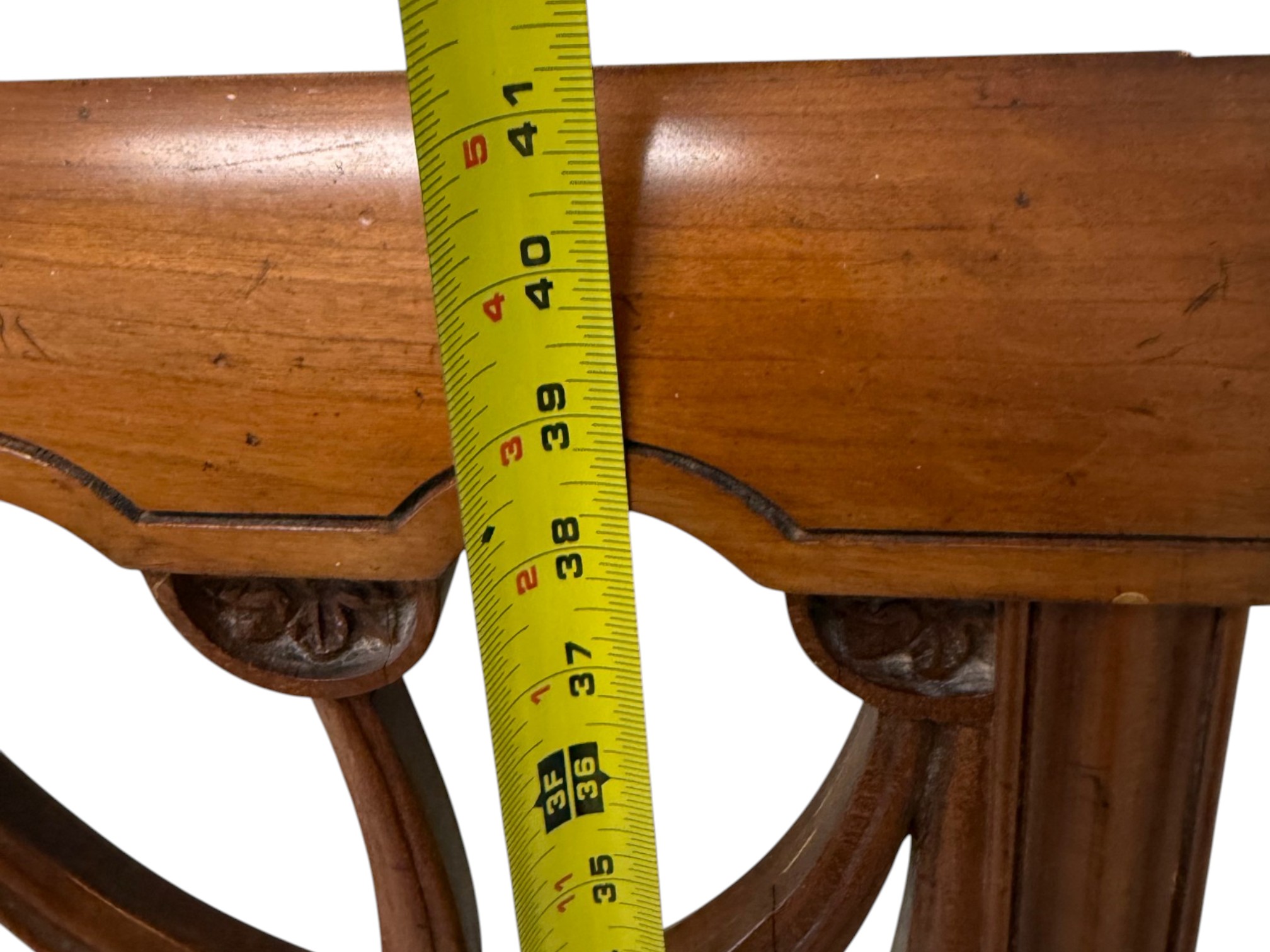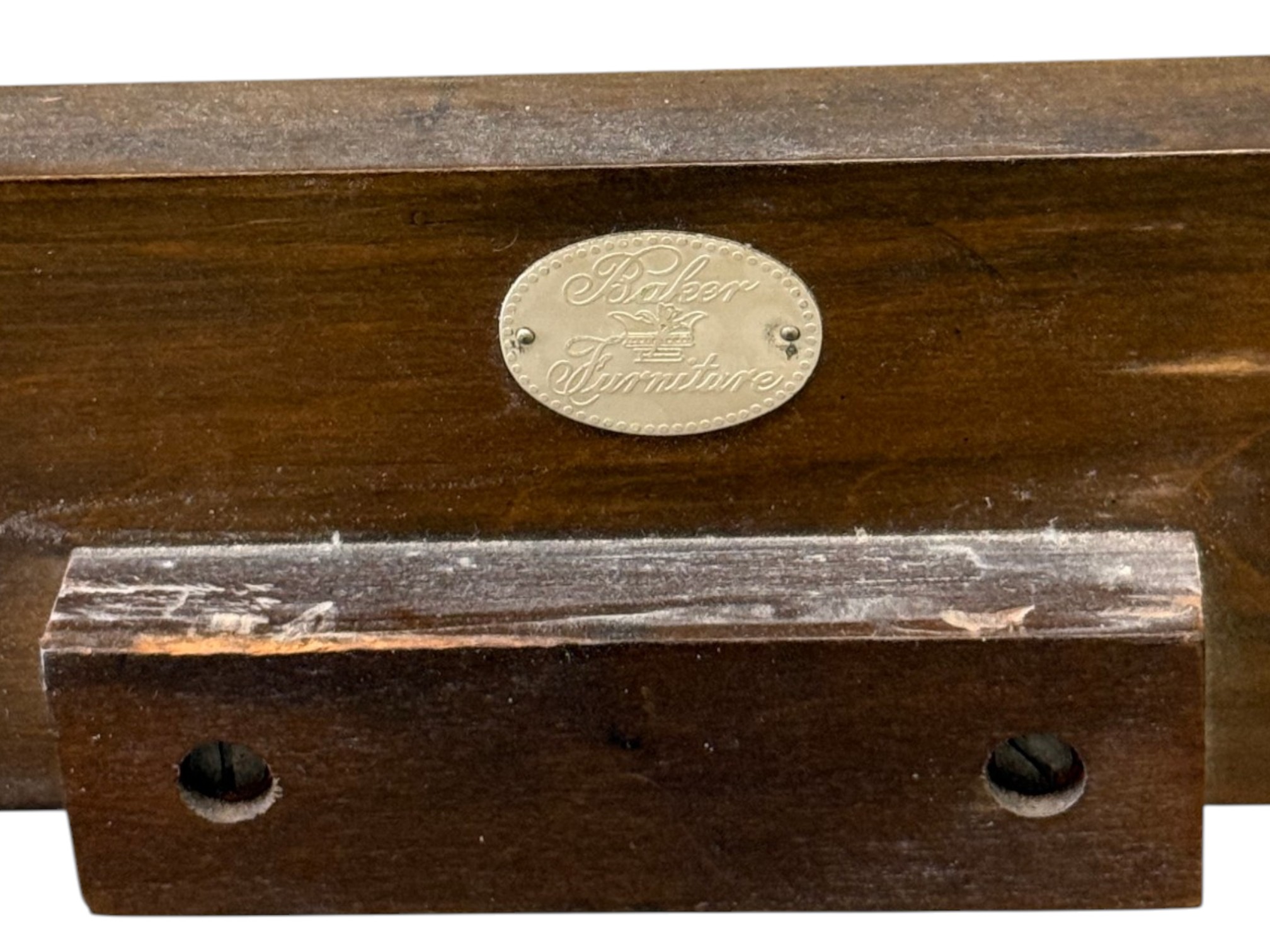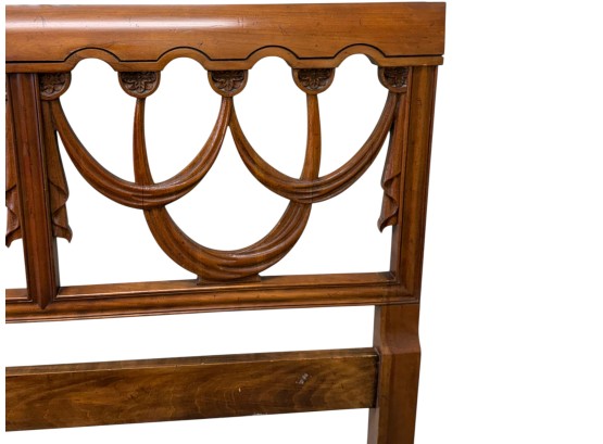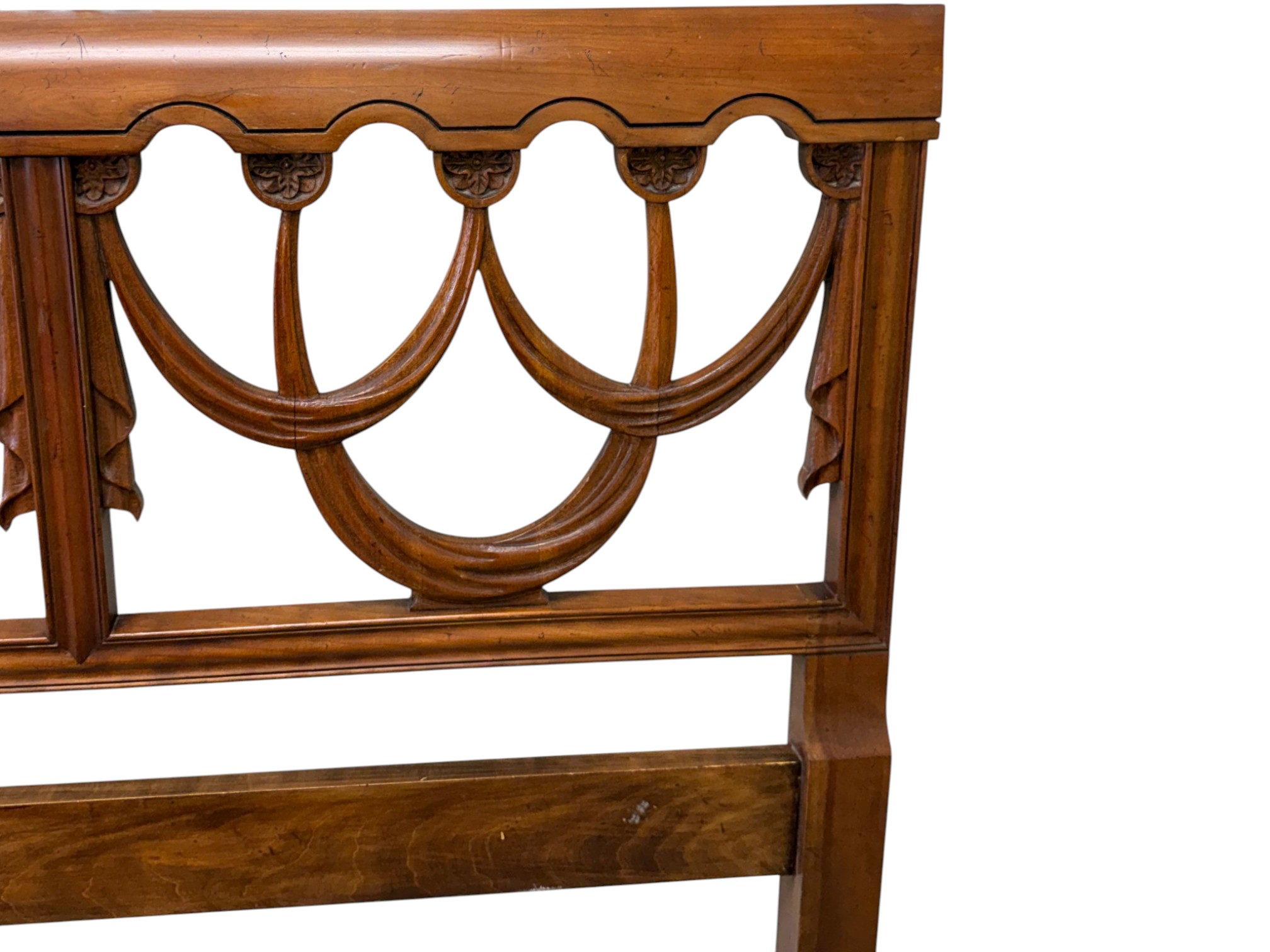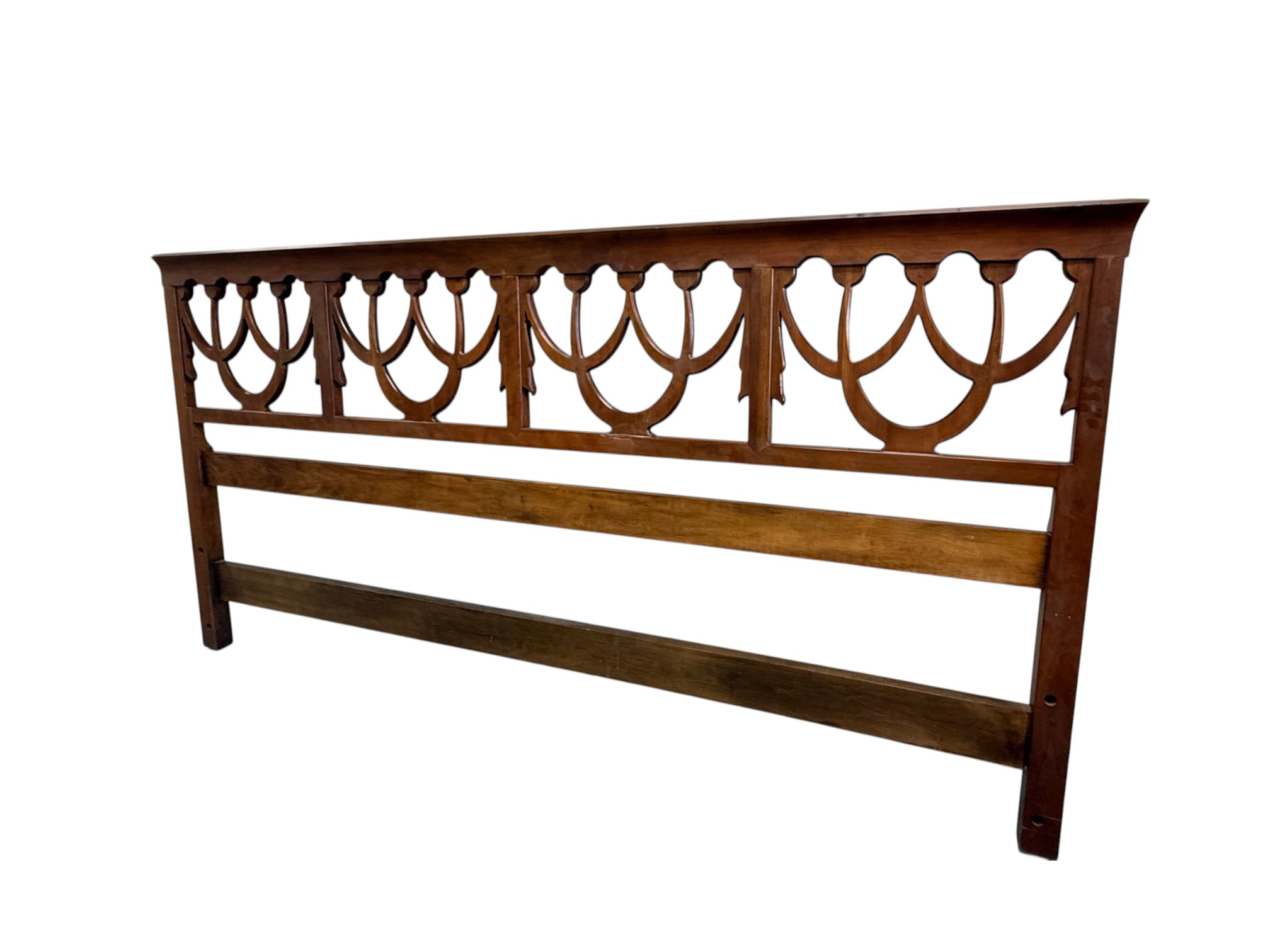 Baker Furniture Chippendale-style mahogany king-size headboard, featuring intricate open fretwork carving along the top rail that mimics the flow of draped ribbons.