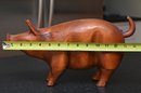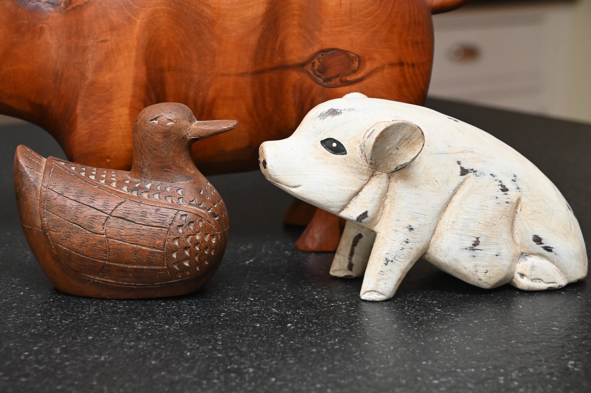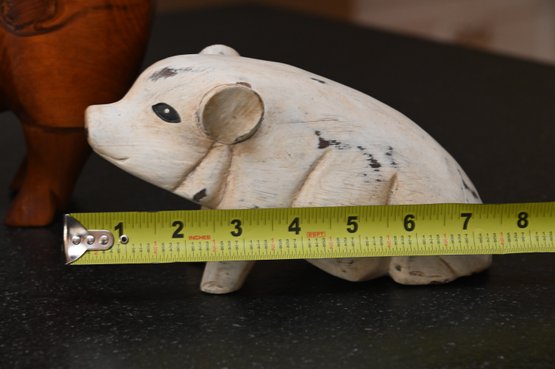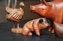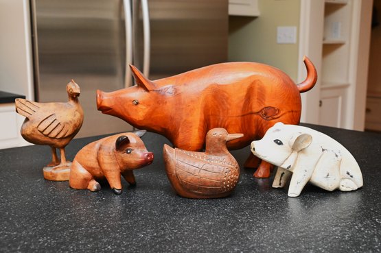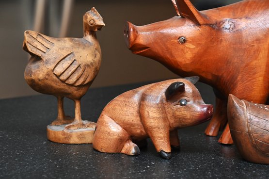 This collection features five handcrafted wooden animal figurines, each with a distinct rustic charm. The centerpiece is a large, polished wooden pig with a rich, warm tone and a beautifully curved form, accentuated by the natural grain of the wood. To its left, a carved wooden chicken stands upright with defined wings and a folk-art-inspired design. In front of the pig, a small wooden duck features intricate carving details, including feather etchings, giving it a lifelike appearance. To the right, a whitewashed piglet with a distressed finish presents a charming farmhouse aesthetic. Lastly, a small, deep brown pig with painted facial details and a glossy finish adds a playful touch. Together, these figures create a visually appealing display of farmyard animals with handcrafted artistry.