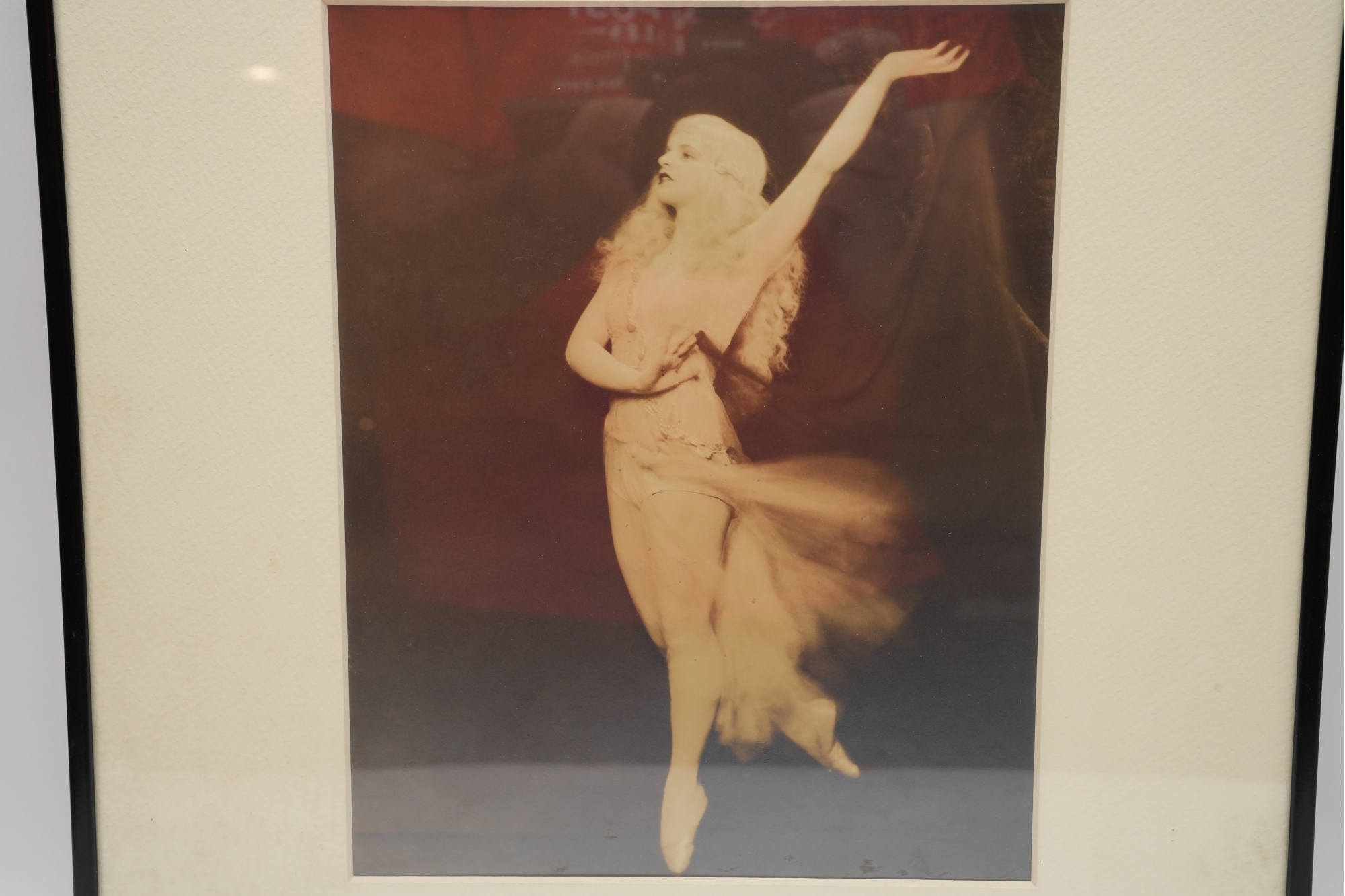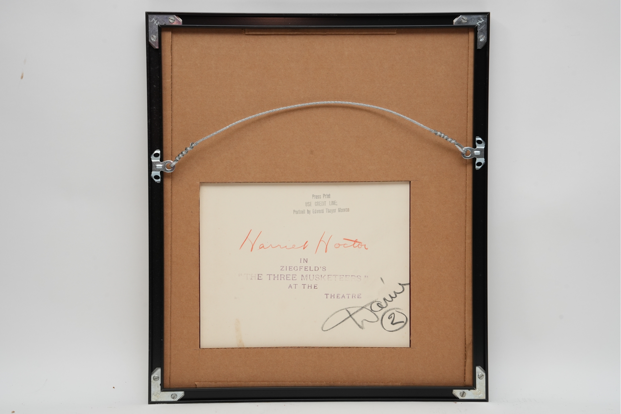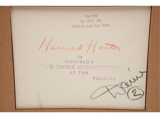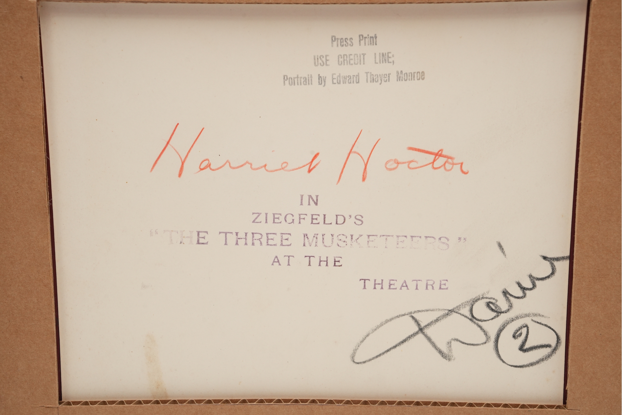 Edward Thayer Monroe (1890-1974) was an American photographer active in the first half of the twentieth century. He specialized in portraits of Broadway and movie celebrities. This studio portrait of Harriet Hoctor from The Three Musketeers shows her in motion, captured with one arm raised and hair cascading. Displayed in a simple black frame.