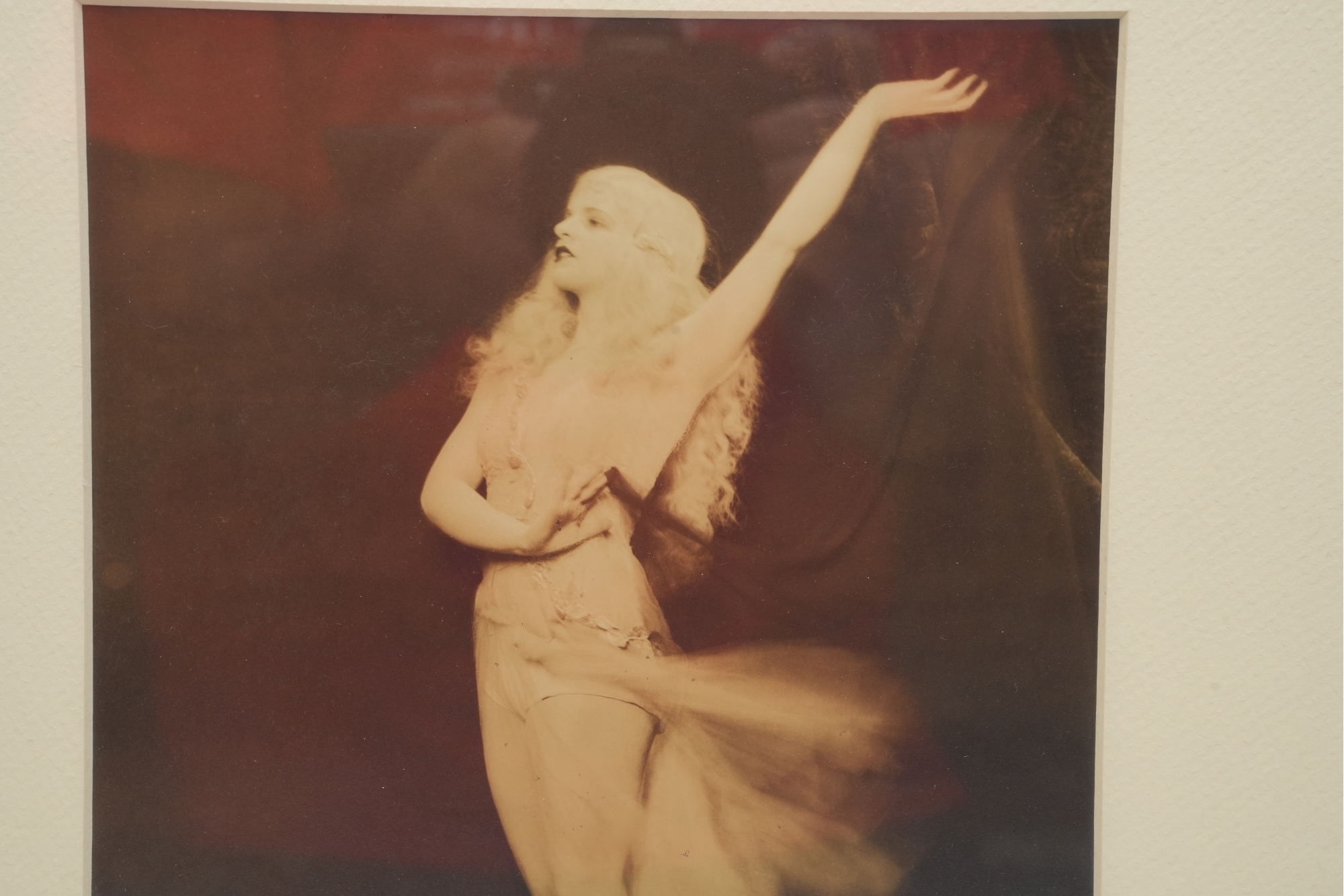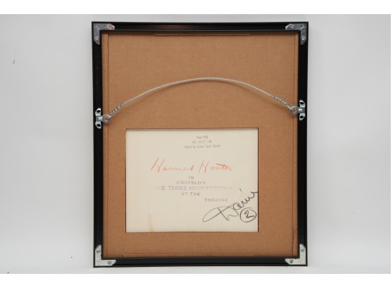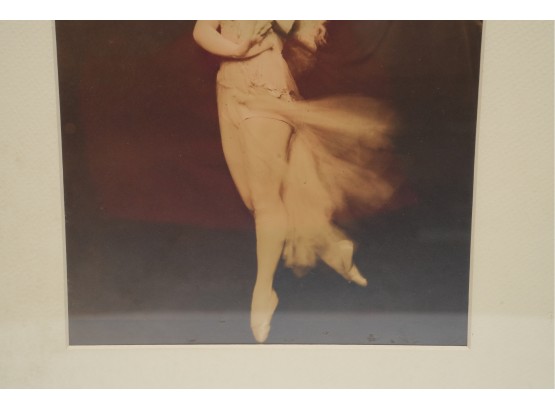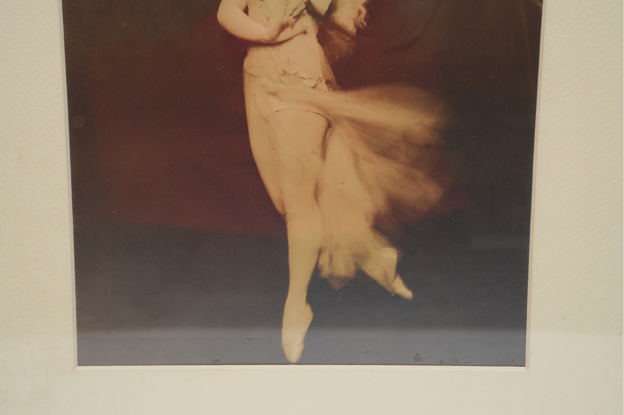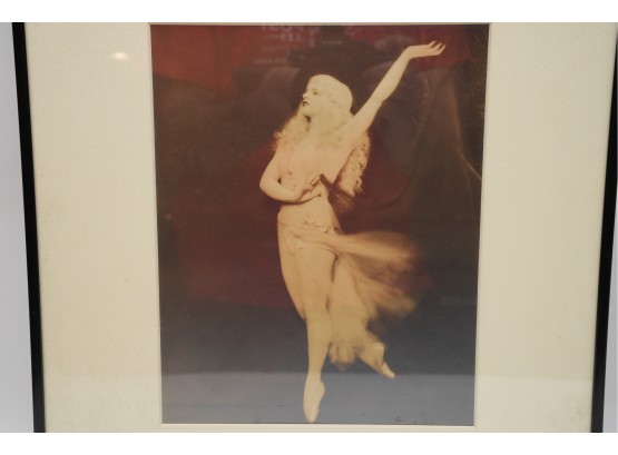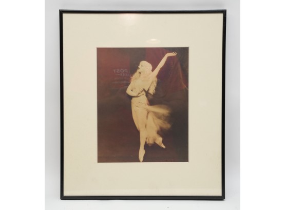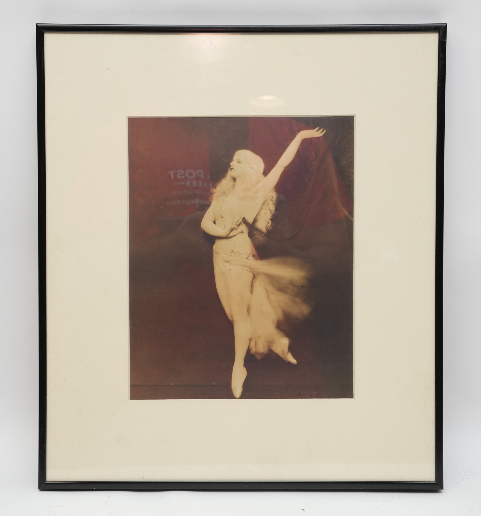 Edward Thayer Monroe (1890-1974) was an American photographer active in the first half of the twentieth century. He specialized in portraits of Broadway and movie celebrities. This studio portrait of Harriet Hoctor from The Three Musketeers shows her in motion, captured with one arm raised and hair cascading. Displayed in a simple black frame.