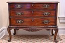 This antique-style chest of drawers exudes classic elegance with its rich, warm-toned wood finish and exquisite craftsmanship. The gracefully curved front features three spacious drawers adorned with ornate, gilded brass handles in a scrolling rococo design, enhancing its opulent appeal. Each drawer is framed with subtle molding, adding to its refined aesthetic. The lower apron is beautifully carved with an intricate shell motif, while the cabriole legs display detailed acanthus leaf carvings, culminating in elegantly scrolled feet.
