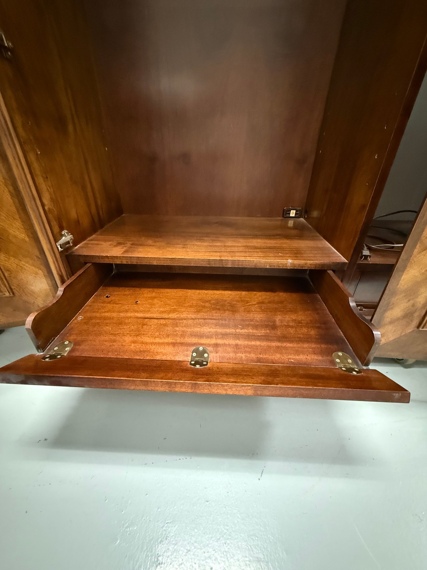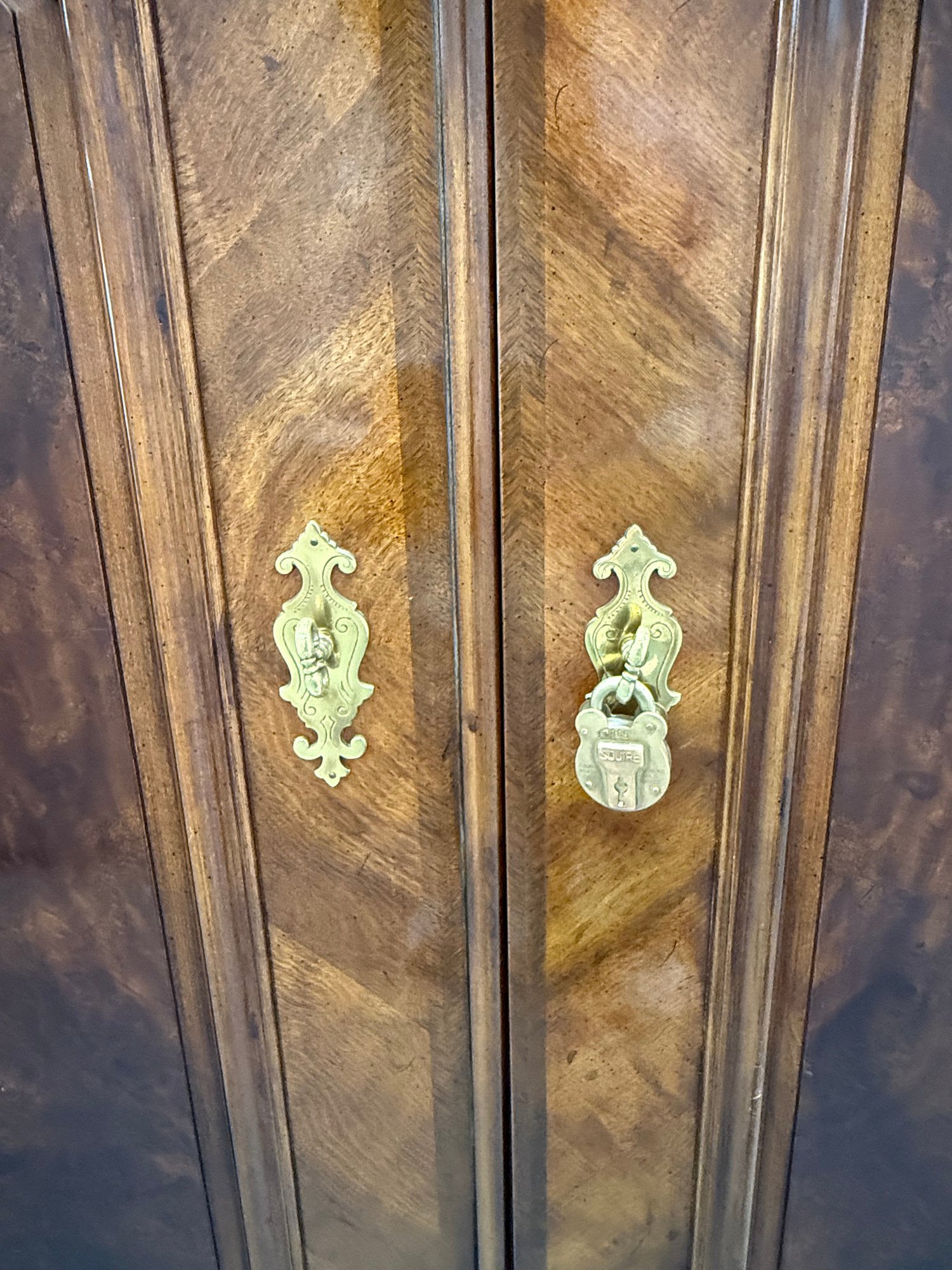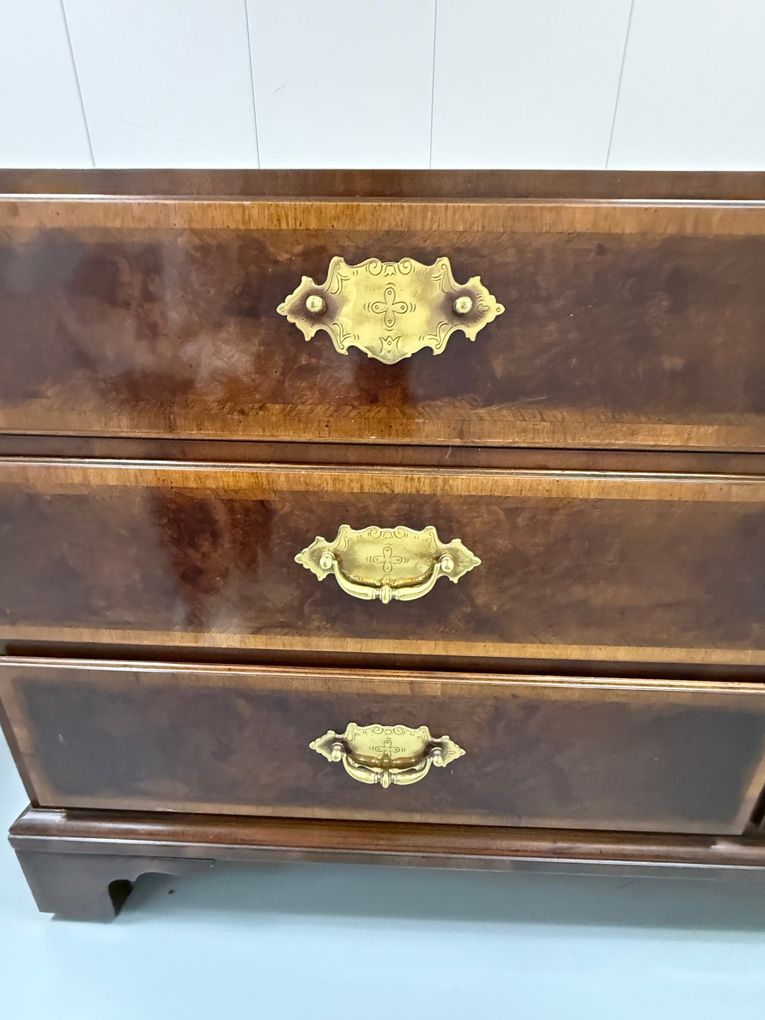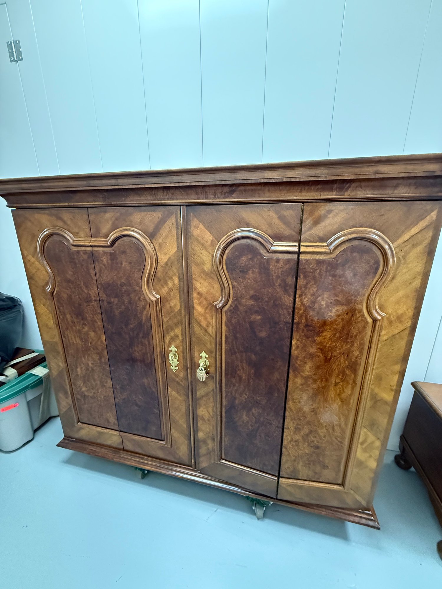 High-quality vintage Henredon Georgian-style linen press in flame mahogany with burl wood accents, featuring classic 18th-century English–inspired detailing, brass hardware, and generous lighted storage. Comes in two parts, upper cabinet and lower drawers.