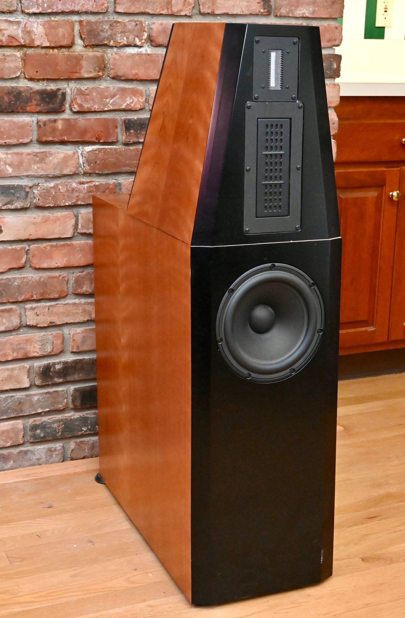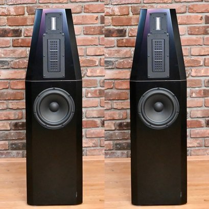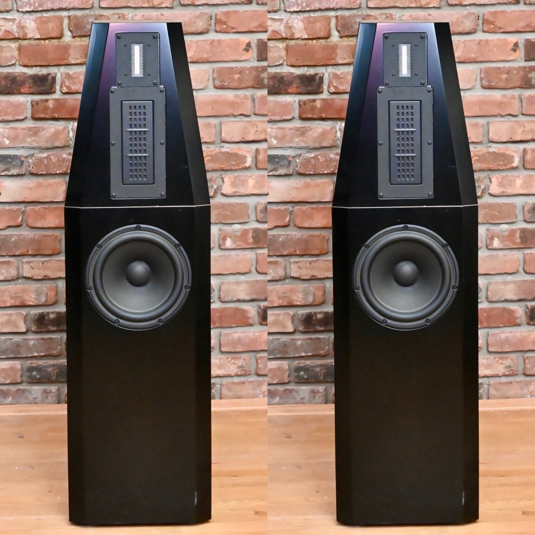 Pair of Philharmonic 3 floorstanding speakers featuring a distinctive angled cabinet design with a gloss black front baffle and warm wood veneer sides. Each speaker is equipped with a ribbon tweeter, midrange driver, and large woofer, delivering detailed highs, accurate mids, and powerful bass. Known for their audiophile-grade performance, these speakers are ideal for high-end stereo or home theater systems. Striking modern design makes them as visually impressive as they are sonically.
