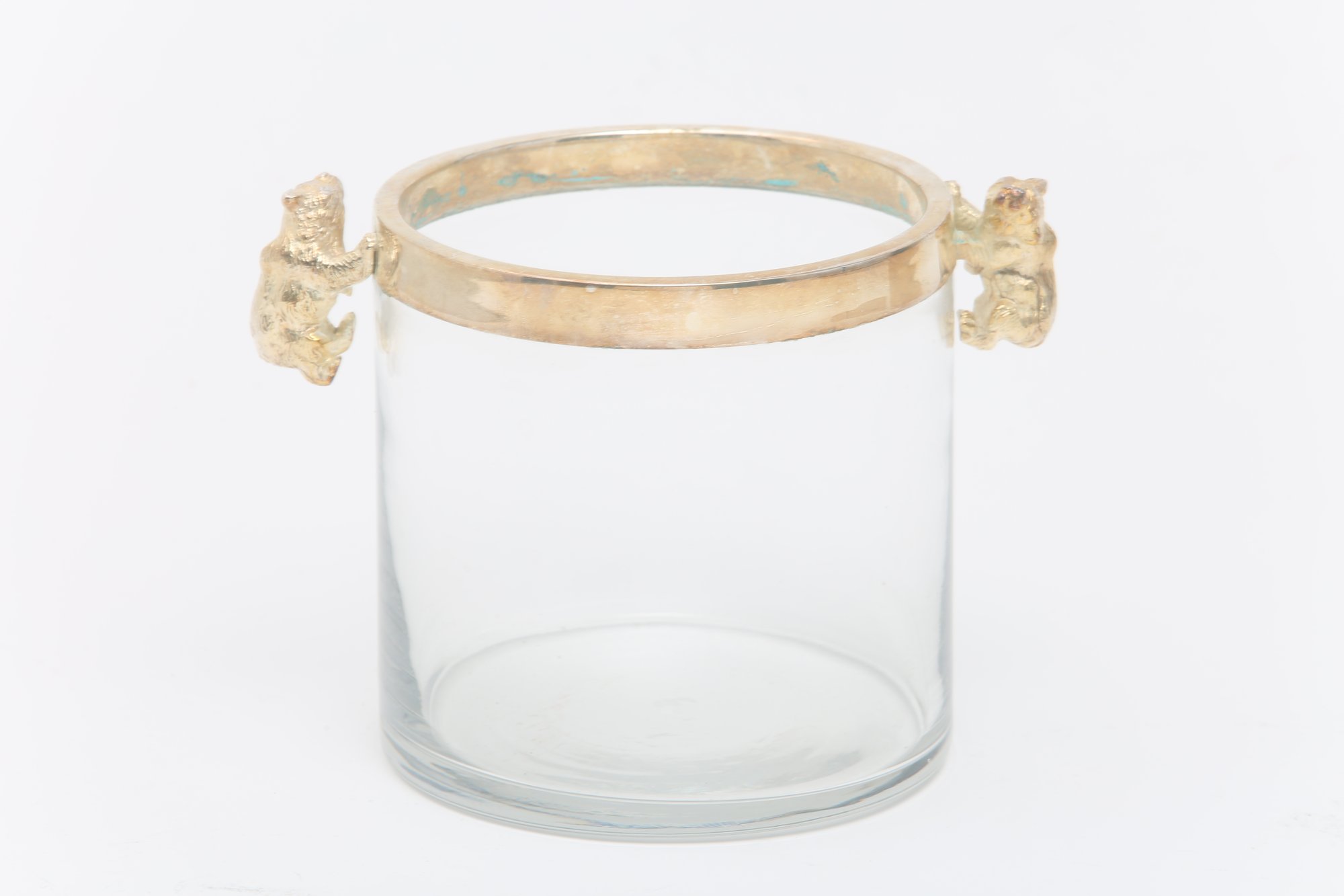 Elegant Italian brass and glass champagne cooler. Features a thick glass bucket with beautiful patina brass and bear figural accents on each side- Noted minor wear and oxidation from age