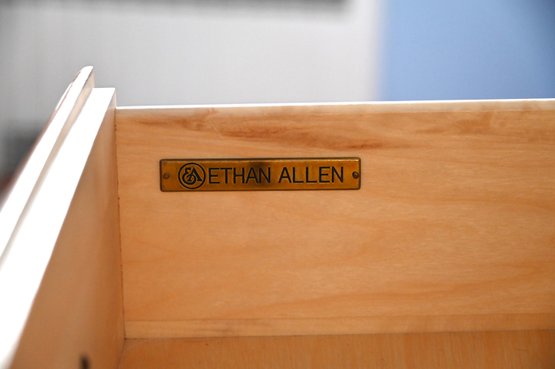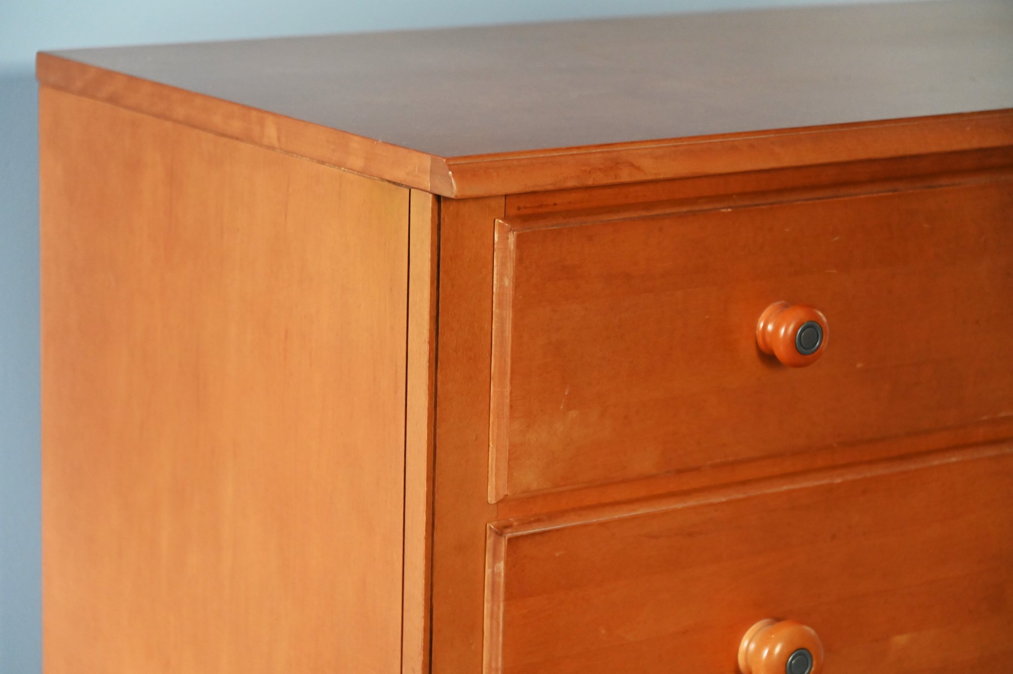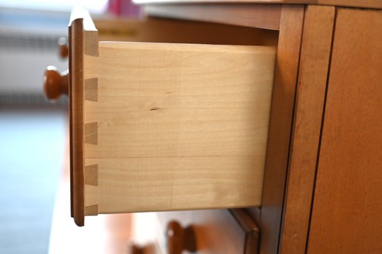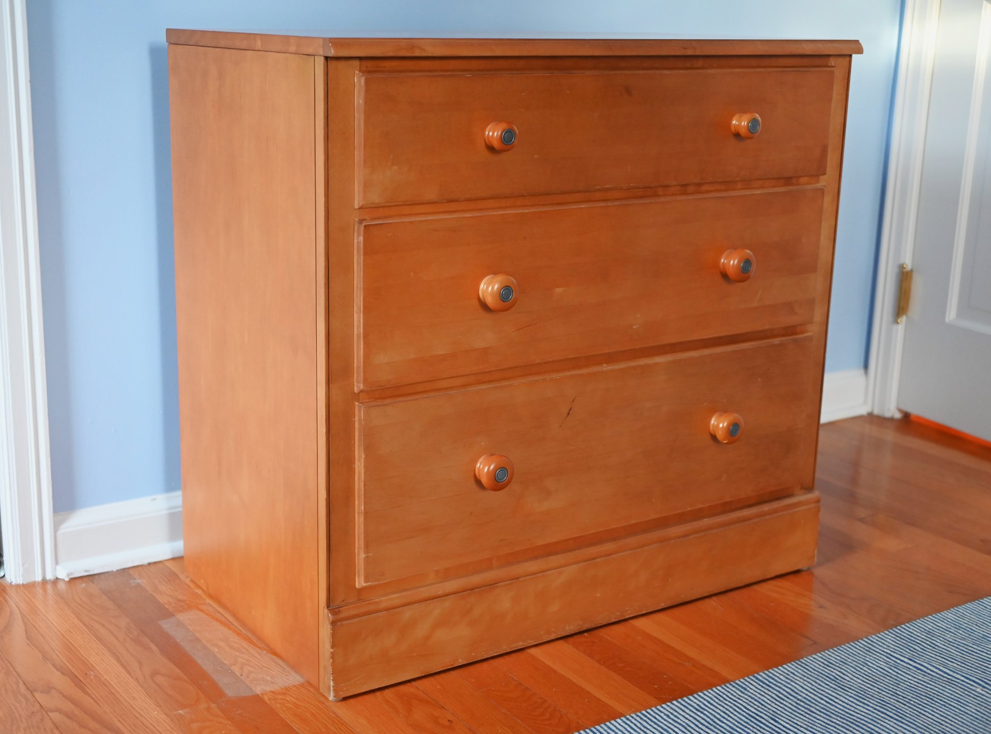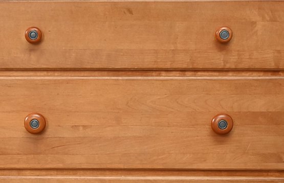 Each of the three spacious drawers is equipped with two round wooden knobs with a darker metal accent in the center, adding a subtle decorative touch. The dresser sits on a sturdy base with a slightly recessed bottom edge, providing structural support and a grounded appearance.