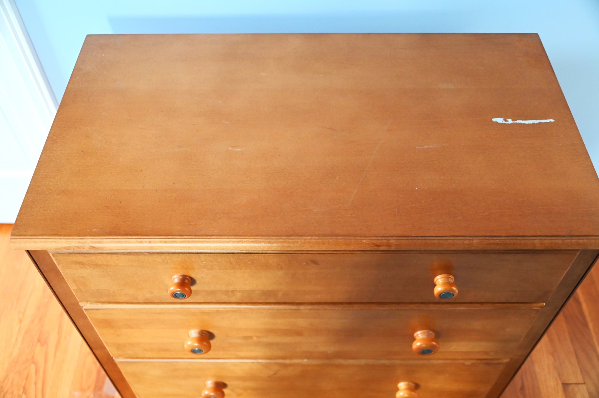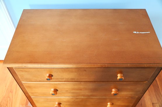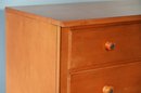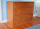 classic wooden three-drawer dresser in a warm, natural wood finish. The dresser has a simple, clean-lined design, making it a versatile piece suitable for a variety of interior styles, including traditional, transitional, and minimalist spaces.