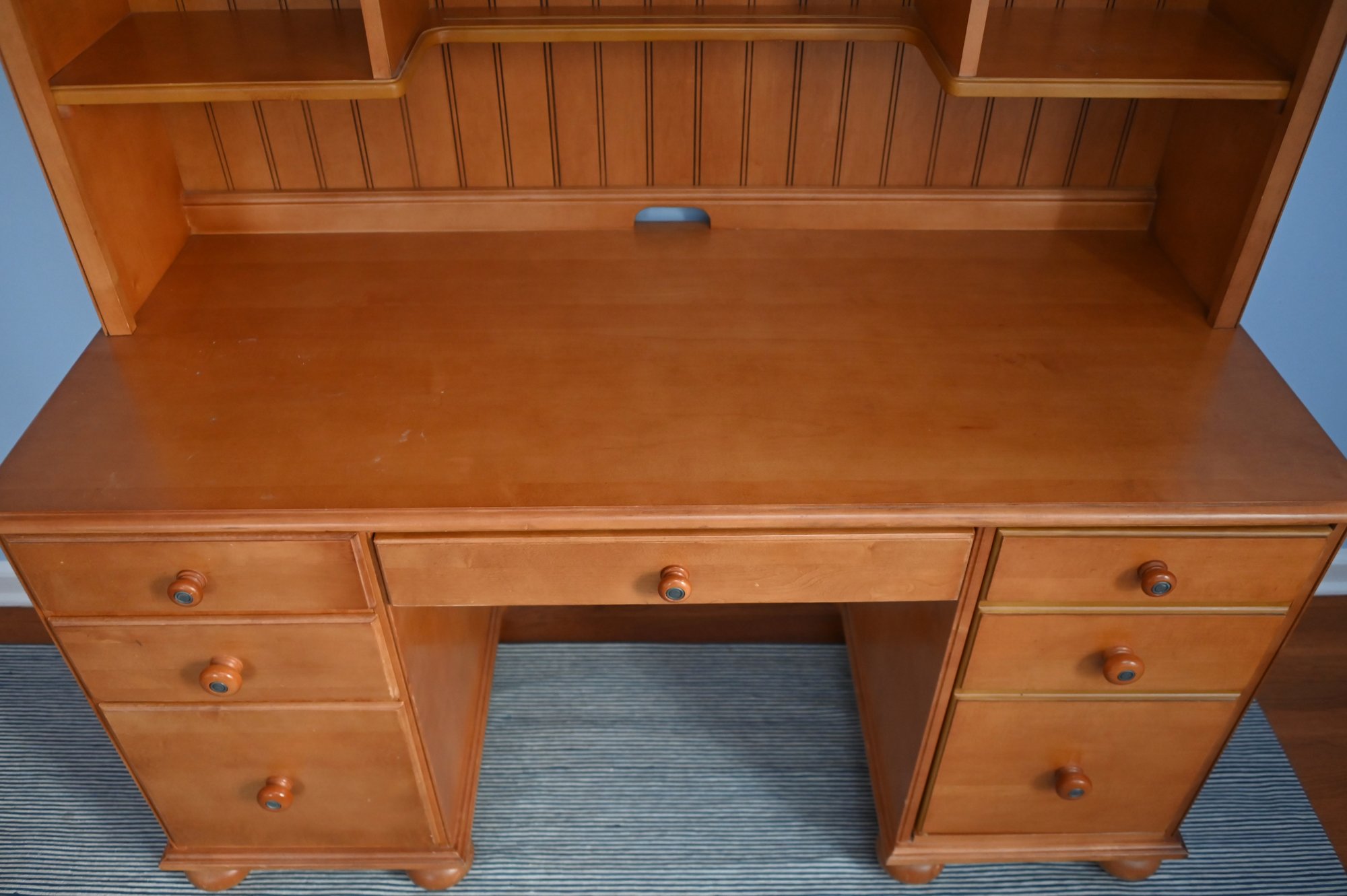 The hutch adds additional storage with a beadboard-style back panel and multiple open shelves, making it perfect for displaying books, decorative pieces, or office essentials. The top of the hutch features a slightly curved molding detail, adding a subtle touch of elegance.