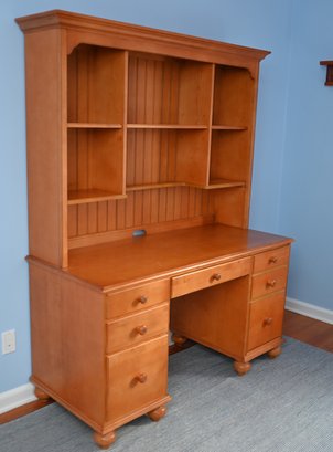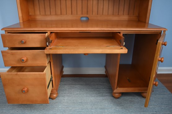 wooden desk with a matching hutch in a warm honey-toned finish. The desk is designed with functionality in mind, featuring multiple drawers and open shelving for ample storage and organization.