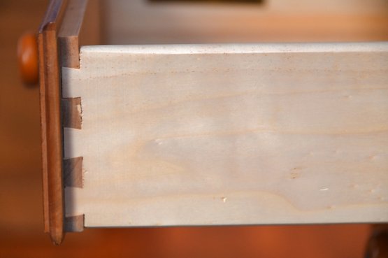 The desk portion includes a central drawer for office supplies, flanked by two sets of three drawers on either side, each with round wooden knobs that have metal accent centers. The desk stands on rounded bun feet, giving it a slightly traditional and timeless appeal.
